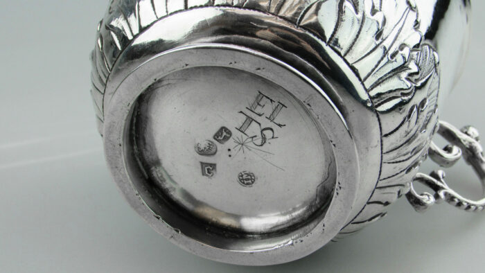 Antique Charles II Solid Silver Porringer with a chased acunthus leaf border around the base. The Porringer has ornate scroll handles topped with cherubic faces. The porringer has the initials EL over TS engraved beneath the base.