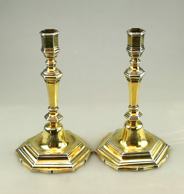 A Pair of Antique 18th Century French Cast Silver Candlesticks with a silver gilt finish. The Candlesticks have shaped stepped hexagonal bases supporting knopped hexagonal columns with plain hexagonal capitals.