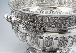 An enormous Victorian Sterling Silver Bowl with an ornate chased fluted design of alternating plain and chased fluting below a delicately chased band. The Bowl had a pair of substantial handles with acanthus leaf terminals. The Bowl stands on an ornate chased spread foot. The Bowl Stands on a substantial black Plinth with a Solid Silver Plaque pinned to the one side. (Plaque Dated 1921)