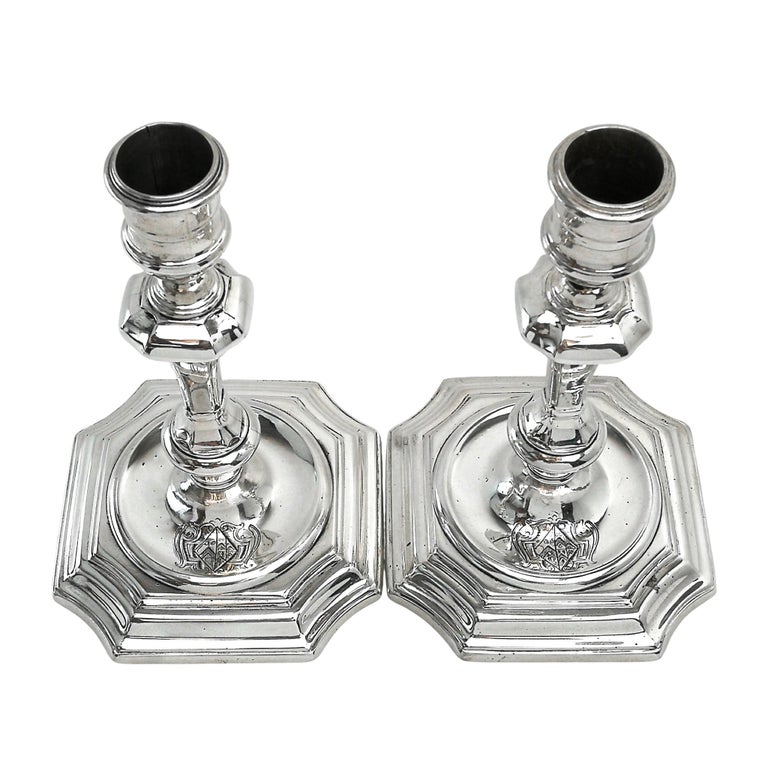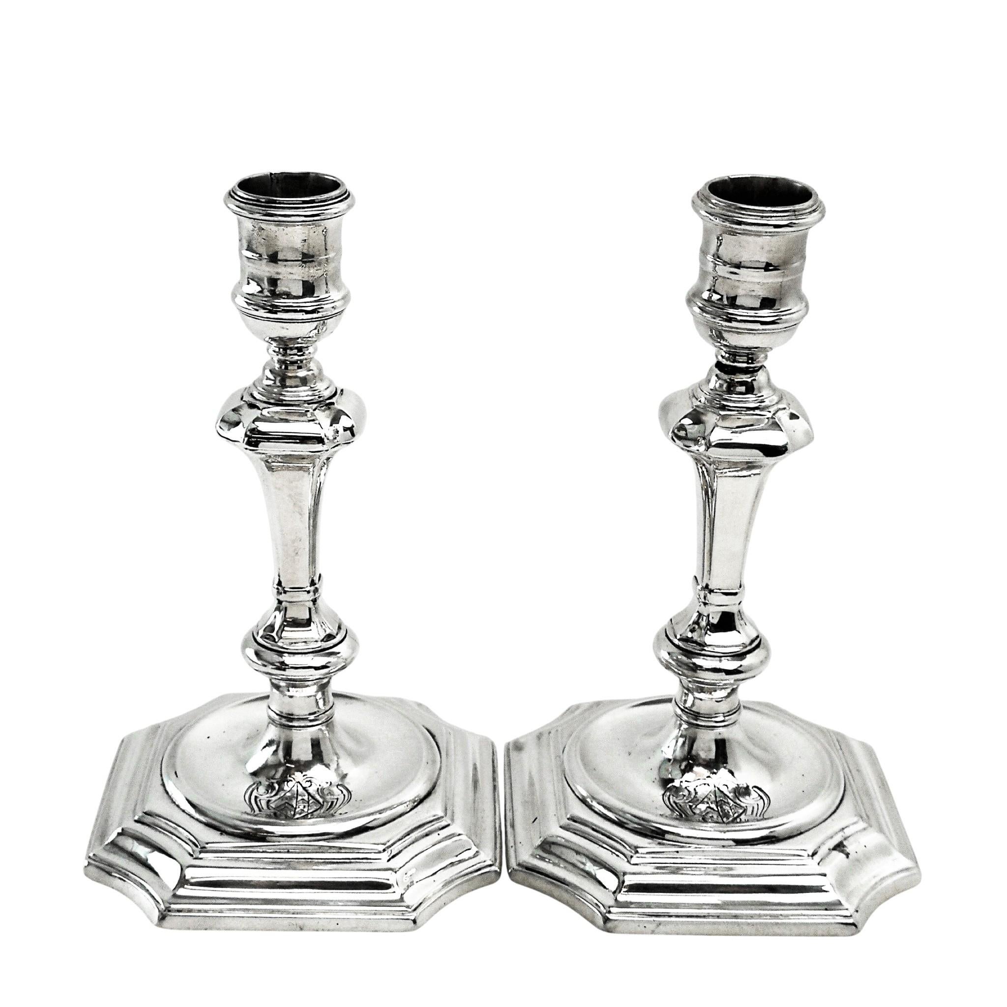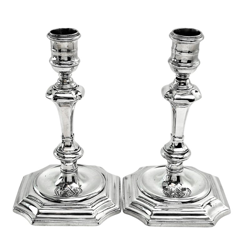 A pair of classic George I Antique sterling Silver Candlesticks standing on shaped stepped square based with a sunken well in the centre. Each Candlestick has a shaped knopped column and elegant capitals. Each Candlestick has a small armorial engraved in the central sunken well.