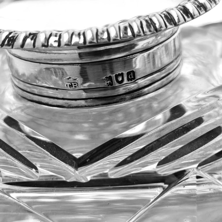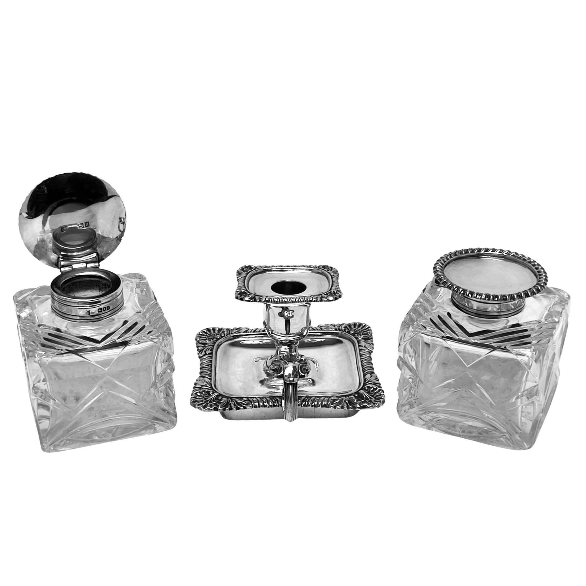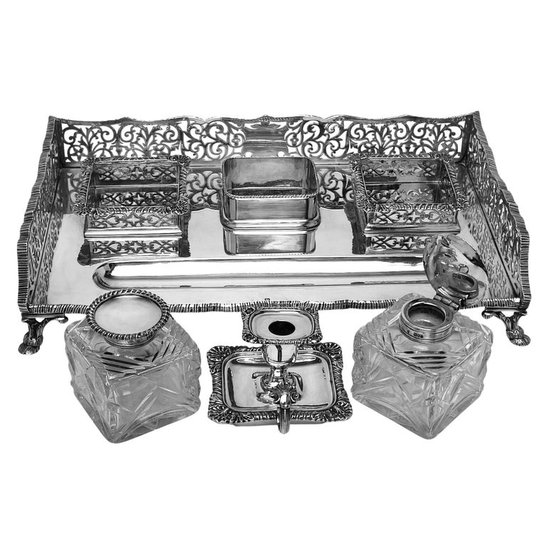 Antique Victorian Silver & Cut Glass Inkstand Inkwell Desk Tidy London 1895