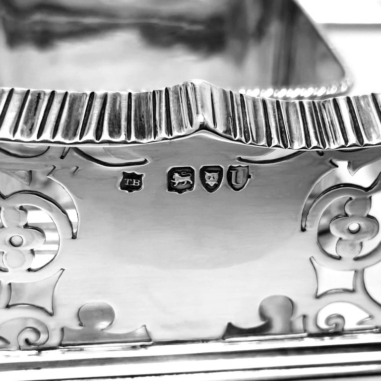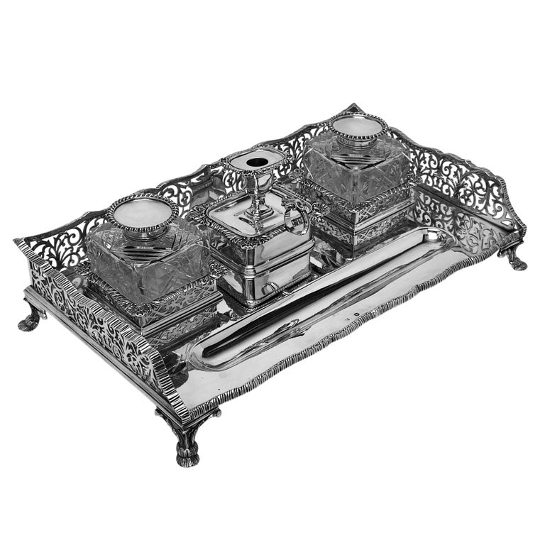 A magnificent Antique Victorian Silver Inkstand with two cut glass and Silver lidded Inkwells. The Inkstand has a lovely pierced design on the sides and stands on four feet. The Inkstand also boasts a removable Silver taperstick with storage space blow it and a substantial sunken well for pens.
