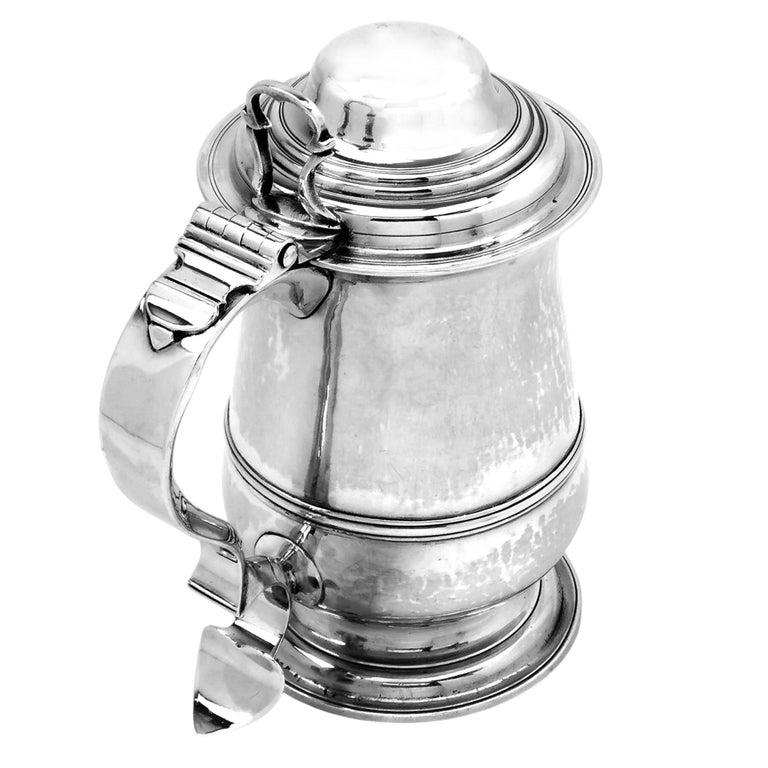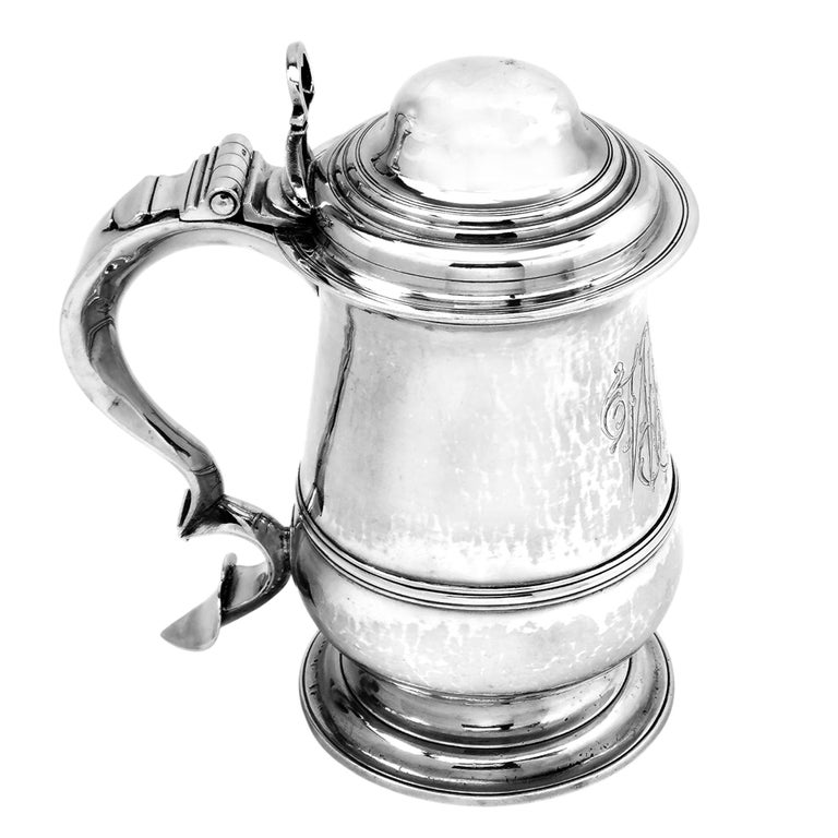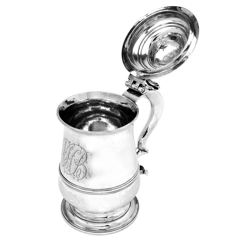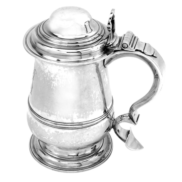 A classic antique George II solid Silver lidded Tankard. This Silver Georgian Quart Tankard has an impressive domed hinged lid with a shaped thumb piece and a substantial scroll handle. The Tankard Mug has a traditional baluster shape with an applied band around the body and stands on a spread foot. The tankard has a large ornate monogram opposite the handle.