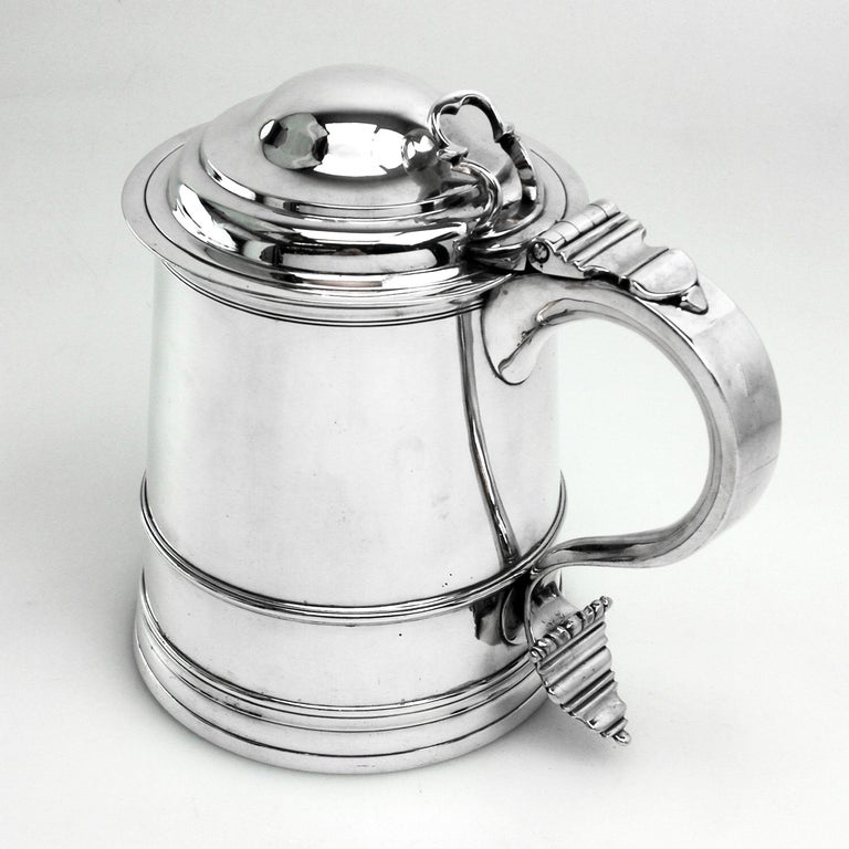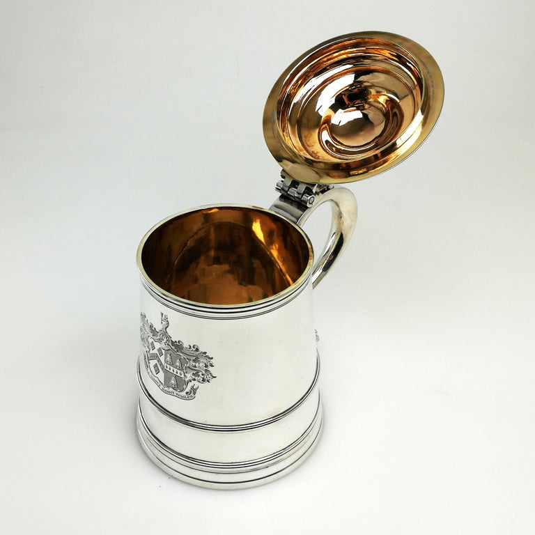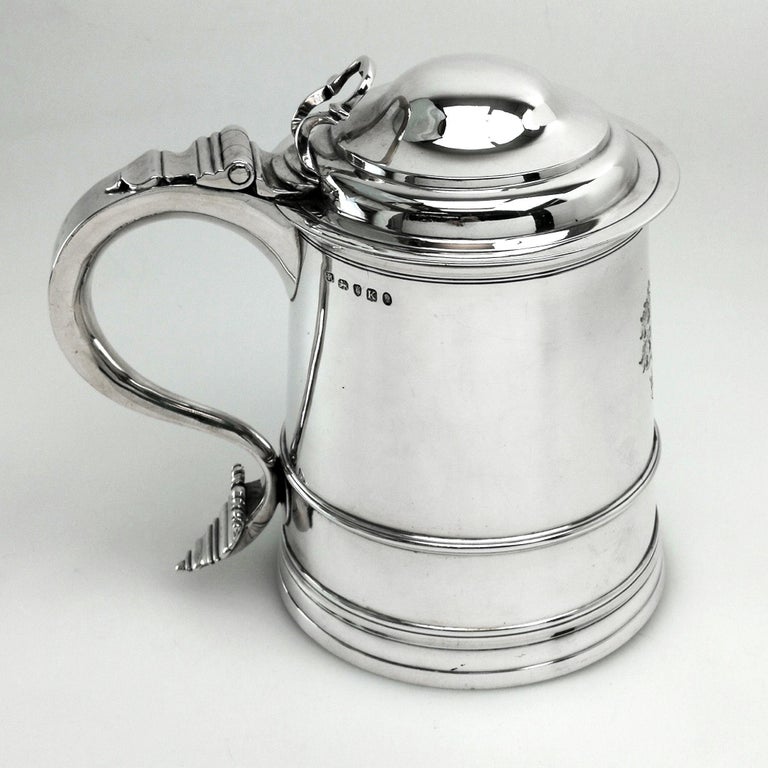 A Classic George III antique sterling silver tankard with a domed lid and a substantial scroll handle. The tankard is in a traditional straight sided form with a large crest engraved opposite the handle.