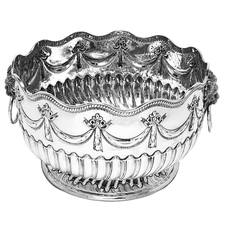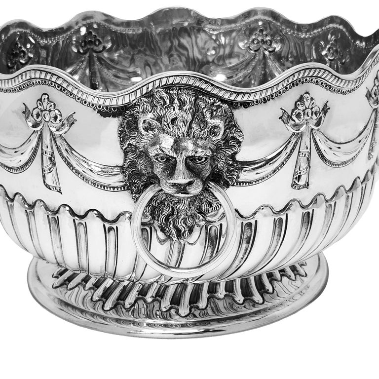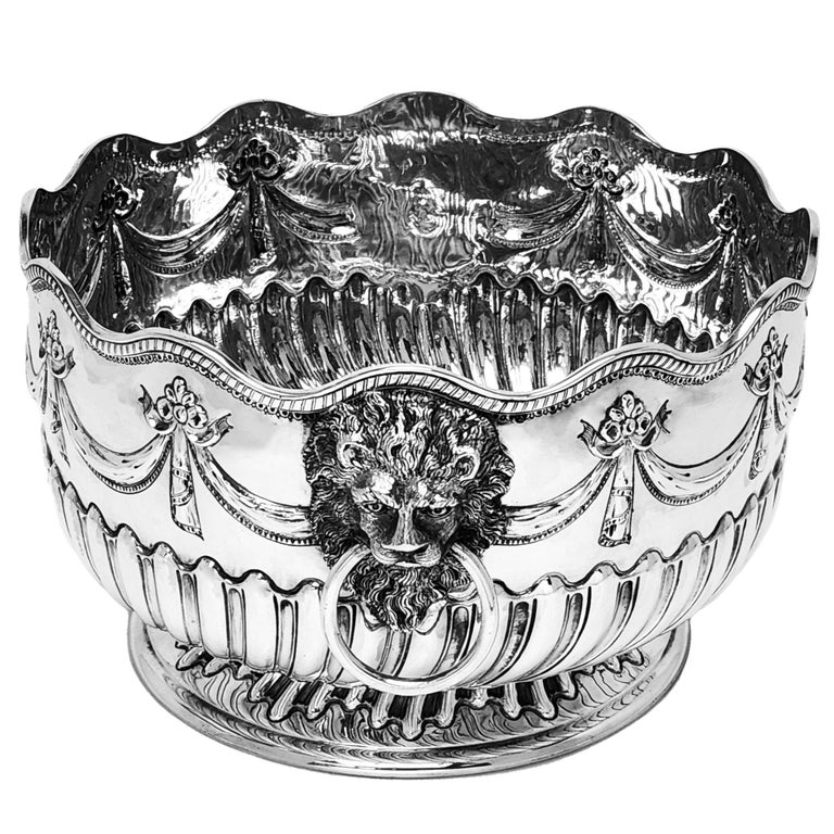 An Antique Victorian Solid Silver Bowl decorated with elegant chased designs. The lower half of the Antique Bowl show a chased writhen fluted design with a swag and floral chased and above this. This Bowl has a pair of impressive Lion Head Ring Handles. This Victorian Bowl is of a good size.