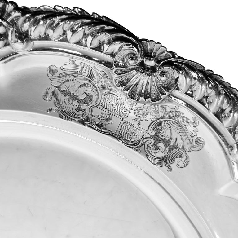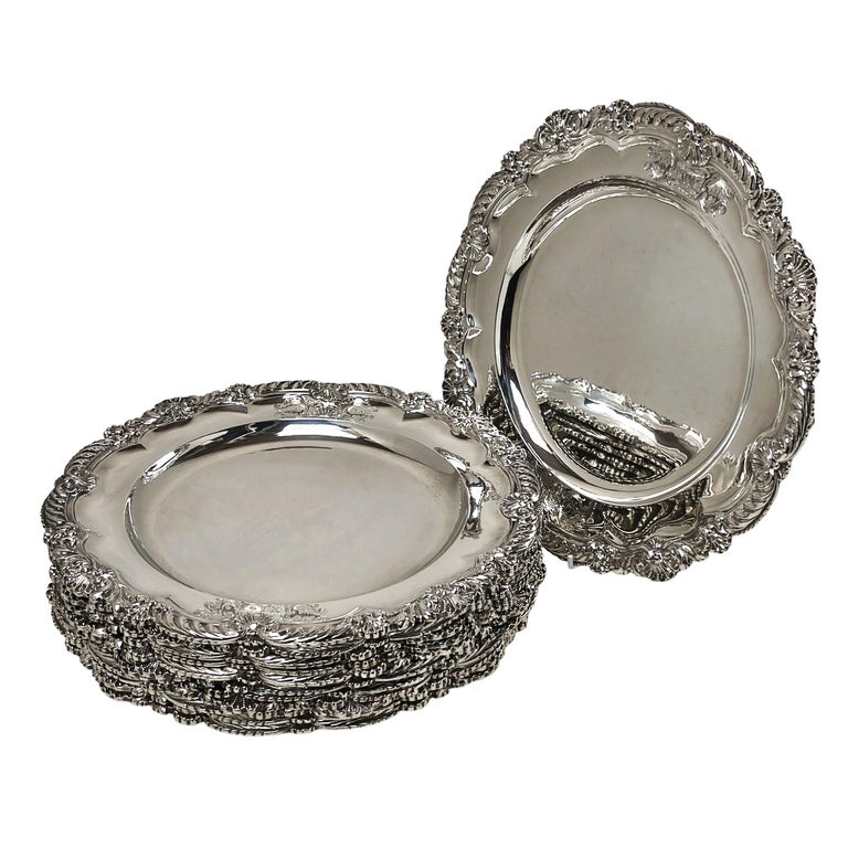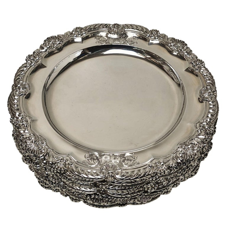 A magnificent Set of 12 Antique George IV Dinner Plates in a classic shaped circular form and featuring a Rococo Revival style border showing an intricate Shell and Foliate design repeating. Each Silver Dinner Plate has two engraved armorials appearing opposite each other on the rim. The engraved coat of arms is that of Jacob Astley, 16th Baron Hastings (1797–1859) with the family motto Justitiae Tenax (Tenacious of Justice), the blazon out of a Ducal coronet and a plume of five ostrich feathers