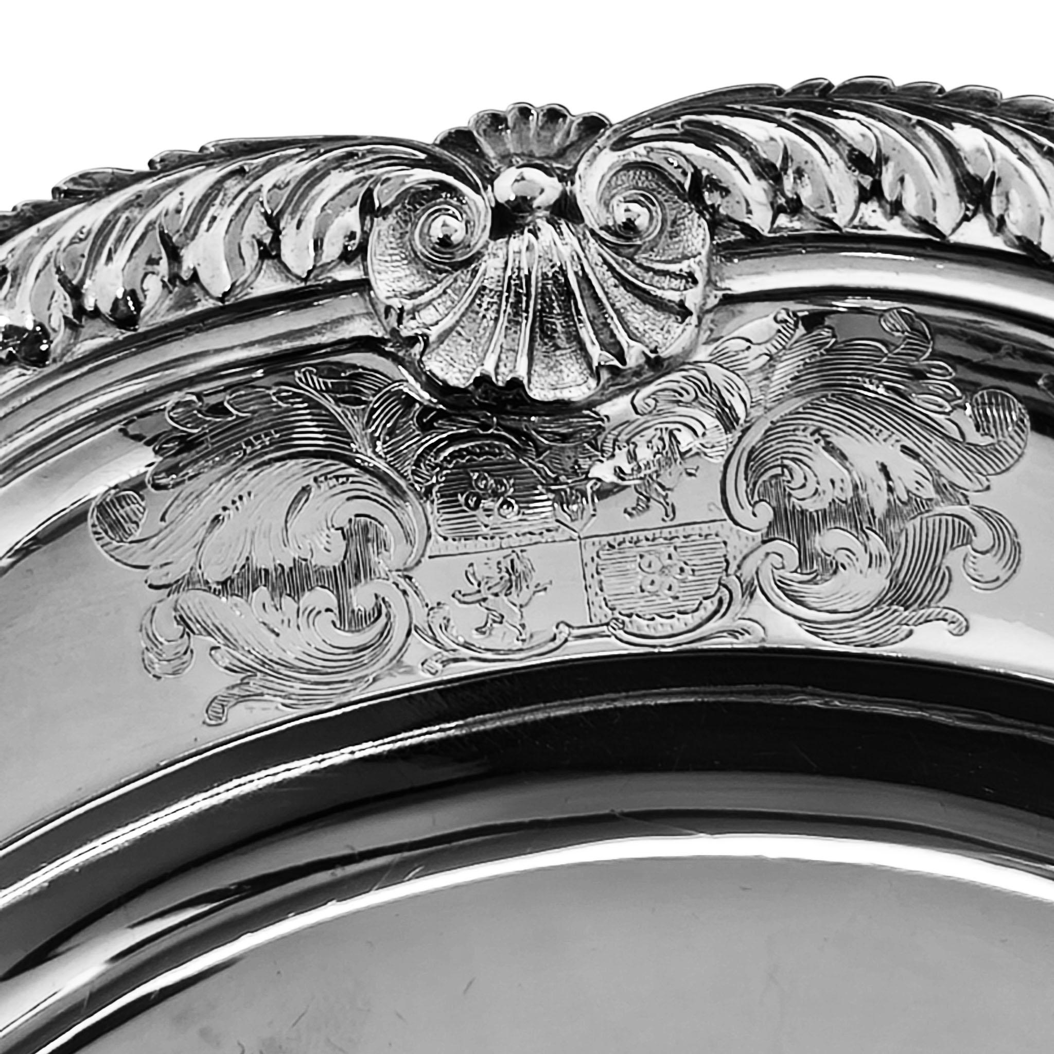A magnificent Set of 12 Antique George IV Dinner Plates in a classic shaped circular form and featuring a Rococo Revival style border showing an intricate Shell and Foliate design repeating. Each Silver Dinner Plate has two engraved armorials appearing opposite each other on the rim. The engraved coat of arms is that of Jacob Astley, 16th Baron Hastings (1797–1859) with the family motto Justitiae Tenax (Tenacious of Justice), the blazon out of a Ducal coronet and a plume of five ostrich feathers