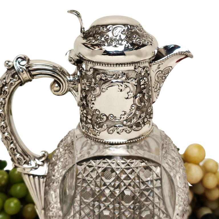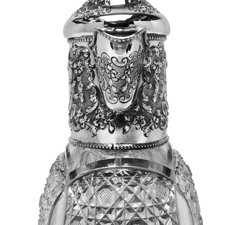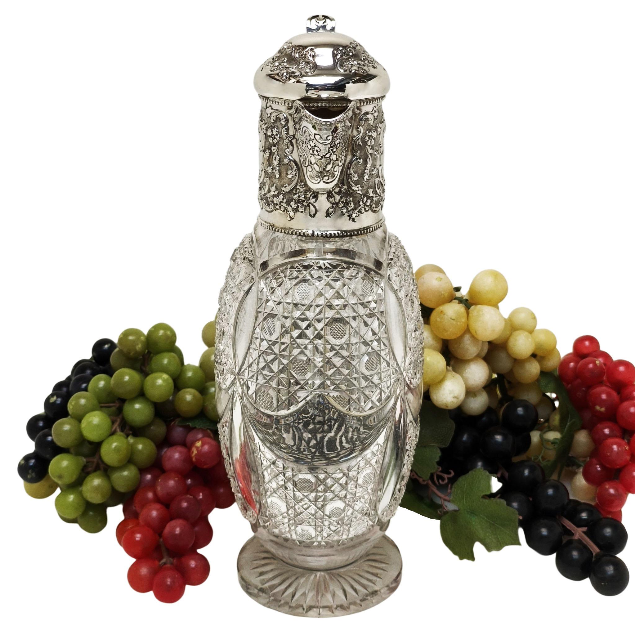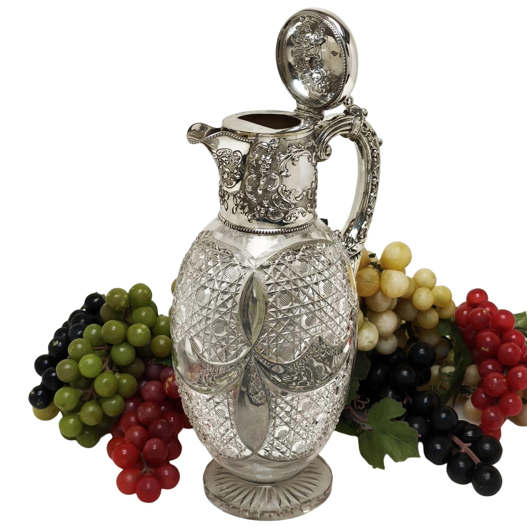 A beautiful Antique Sterling Silver & Cut Glass Claret Jug. This Wine Jug has a chased scroll and foliate design on the neck and hinged lid and has a pair of cartouches on opposite sides of the neck. The Claret Jug has a substantial scroll handle and the body of the jug has an elegant cut glass pattern and a start burst pattern below the foot.