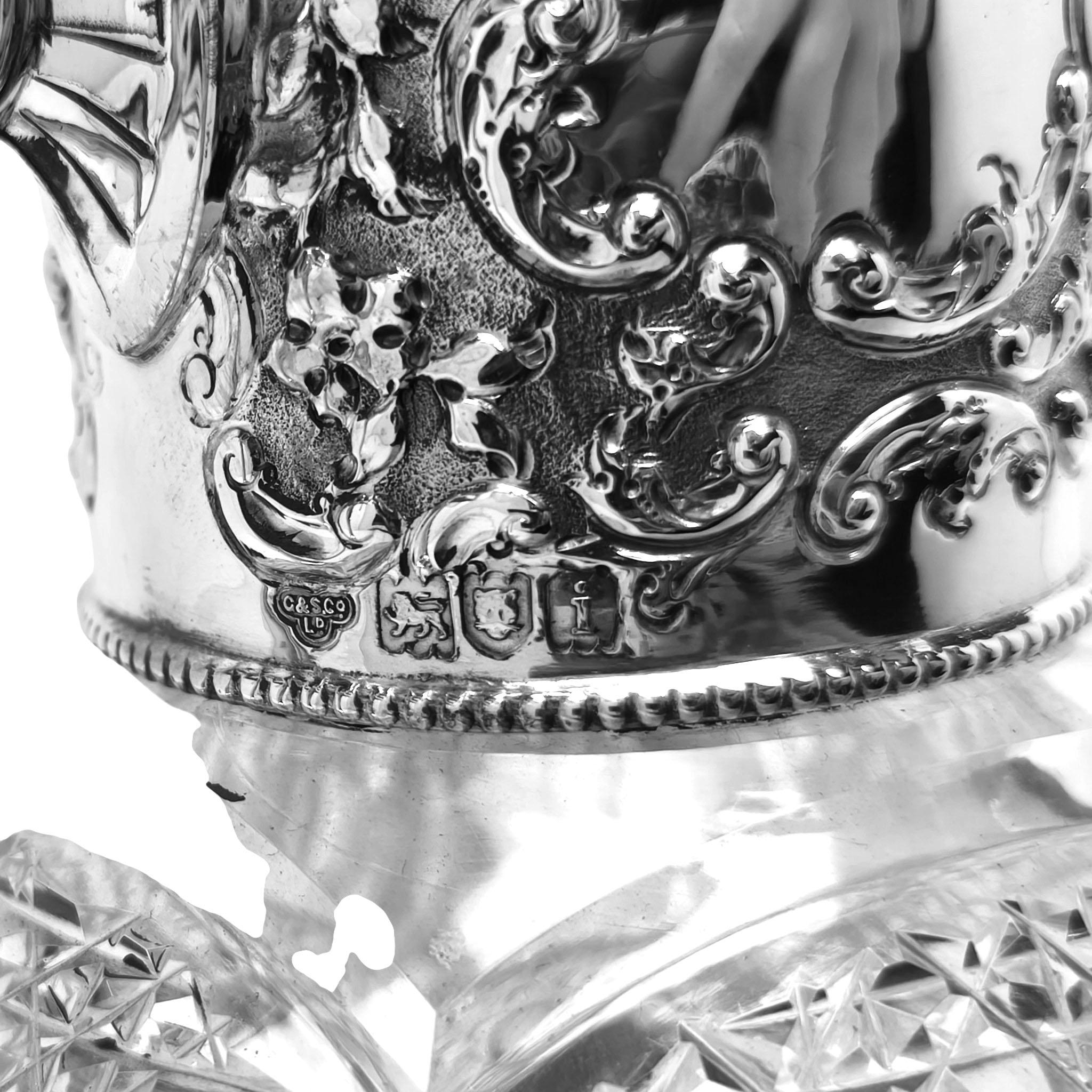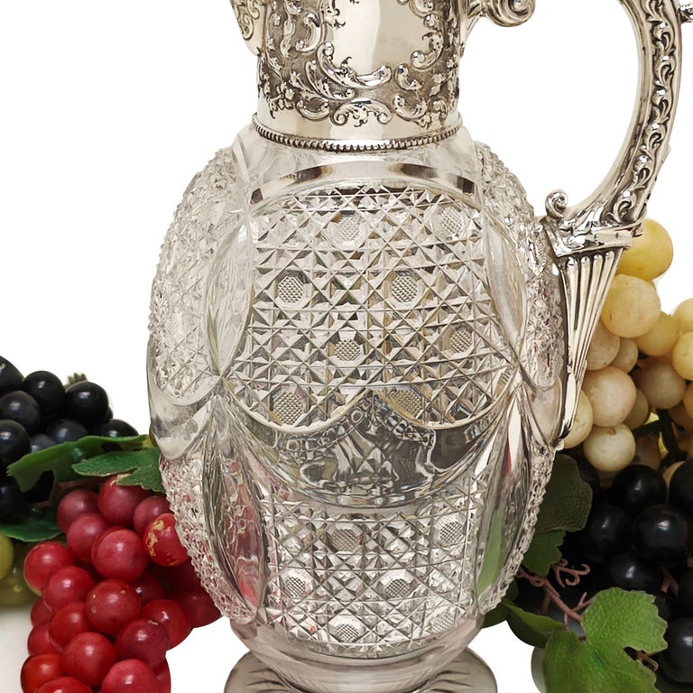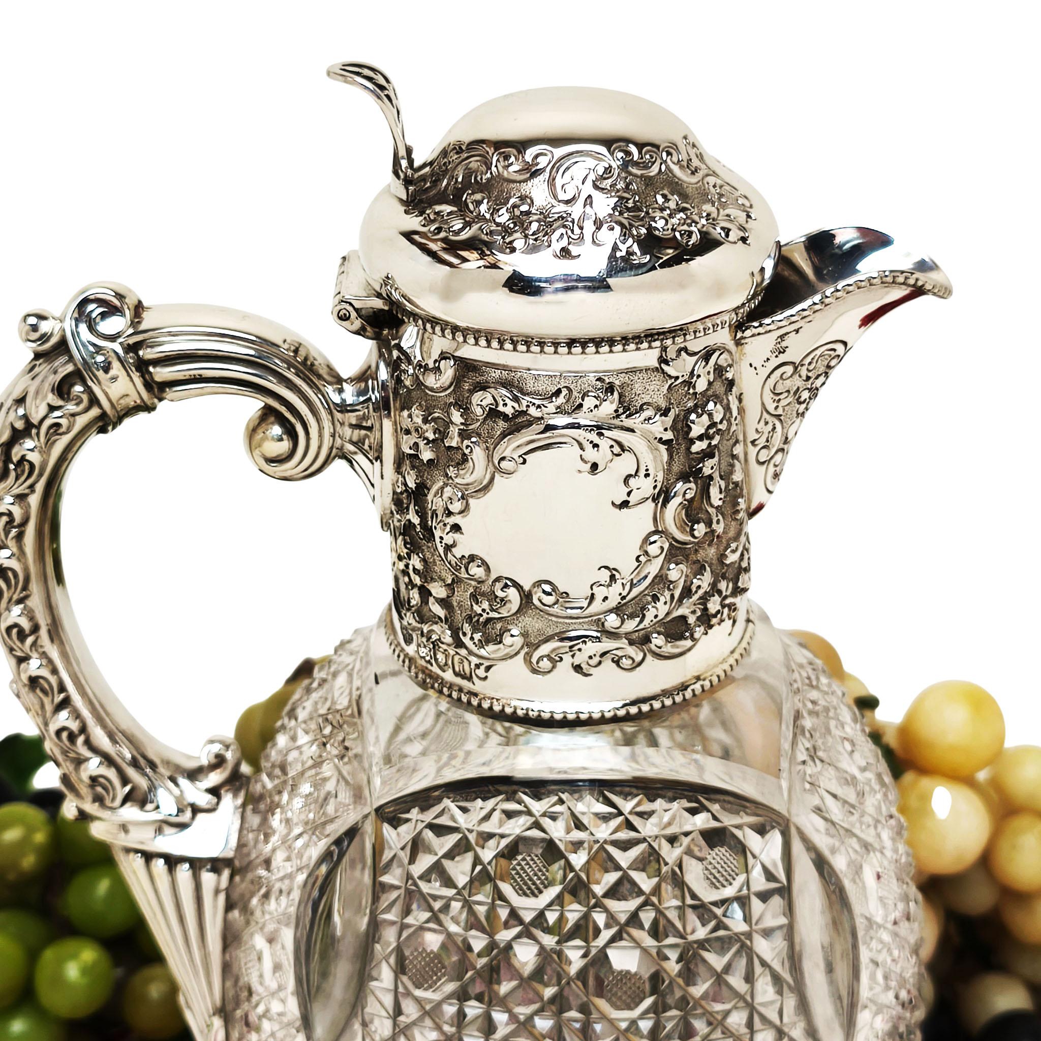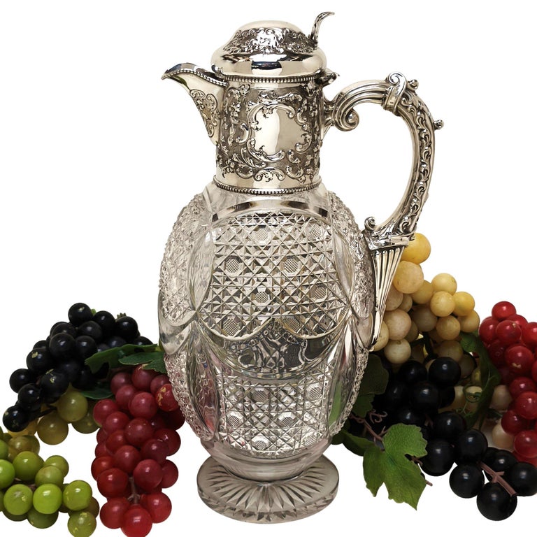 A beautiful Antique Sterling Silver & Cut Glass Claret Jug. This Wine Jug has a chased scroll and foliate design on the neck and hinged lid and has a pair of cartouches on opposite sides of the neck. The Claret Jug has a substantial scroll handle and the body of the jug has an elegant cut glass pattern and a start burst pattern below the foot.