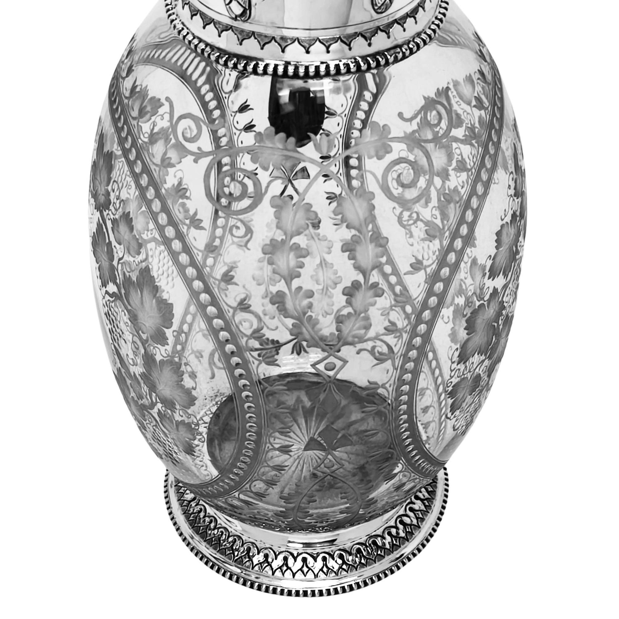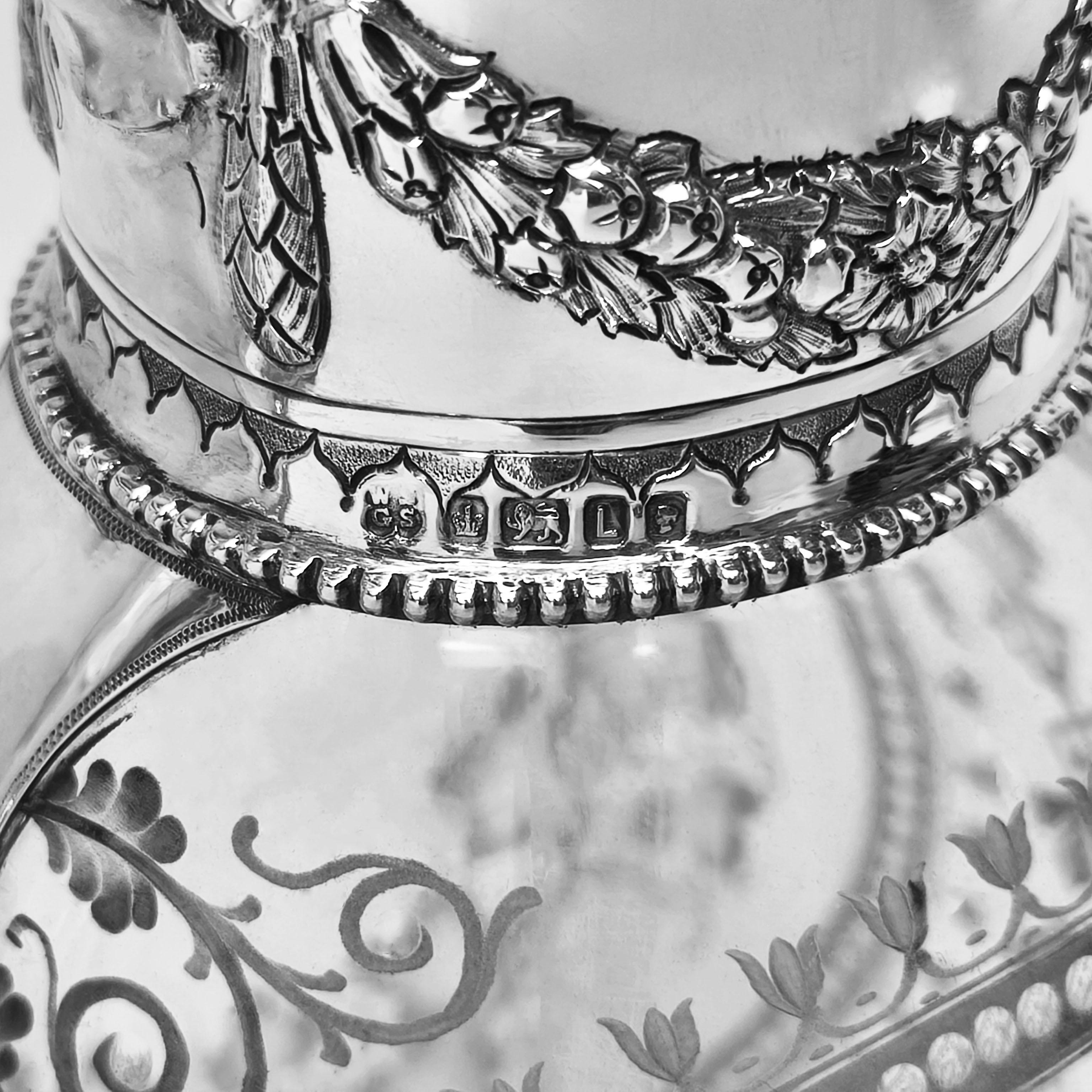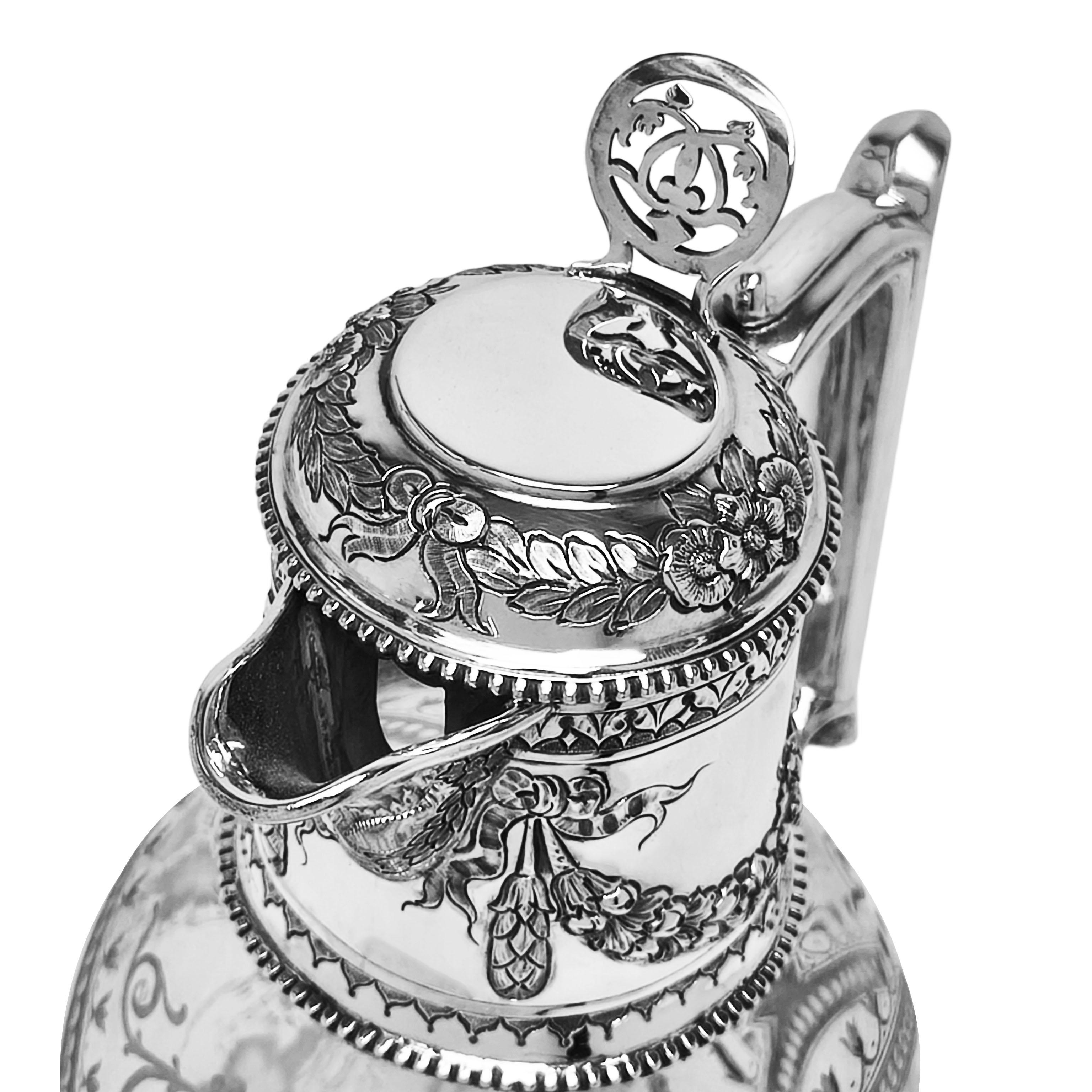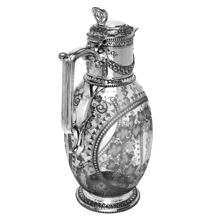 The ovoid glass body is finely etched with an intricate arrangement of trailing vines, leaves, and stylised floral motifs, arranged within decorative cartouches and bordered by delicate beading. This engraving on the body of the Claret Jug is notably fine. The upper mount, spout, and hinged Lid and Handle are crafted in Sterling Silver. The Neck of the Mount features a chased design of floral swags which are mirrored on the hinged lid.