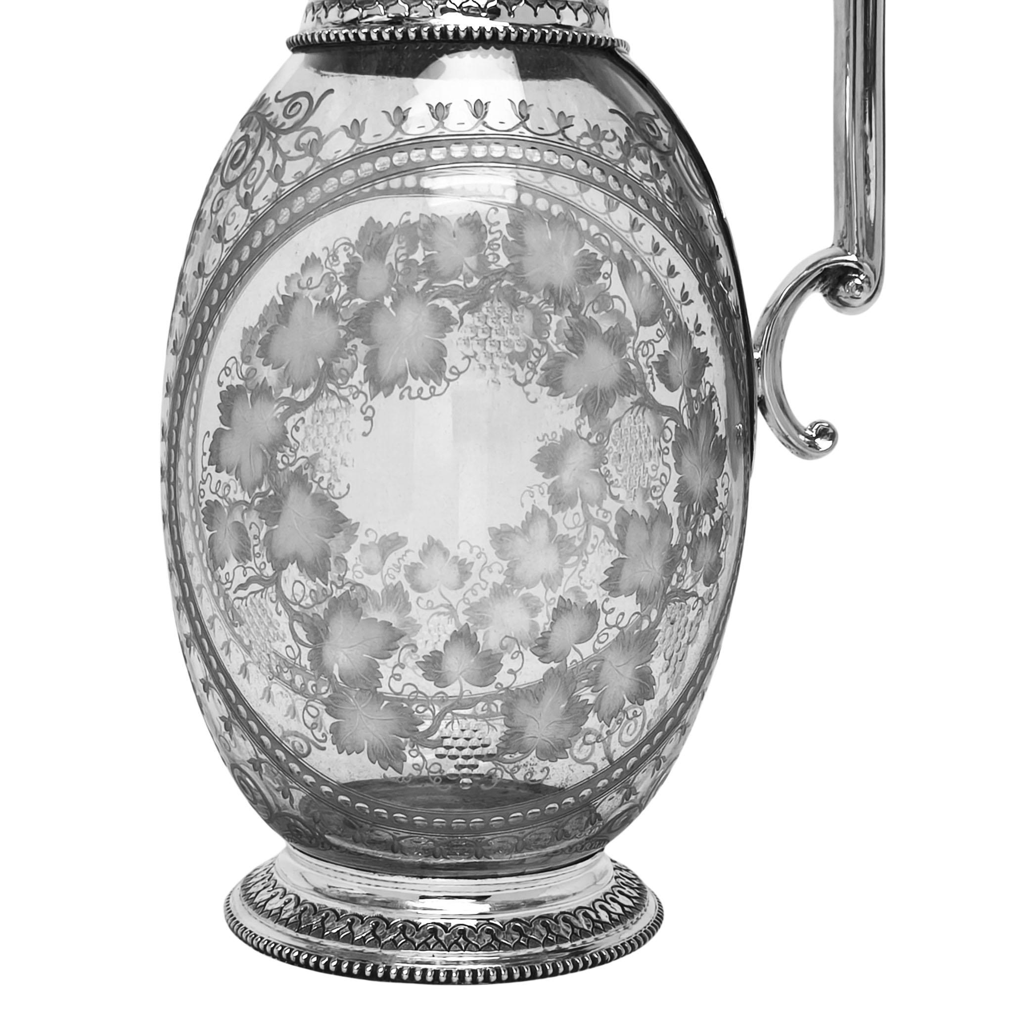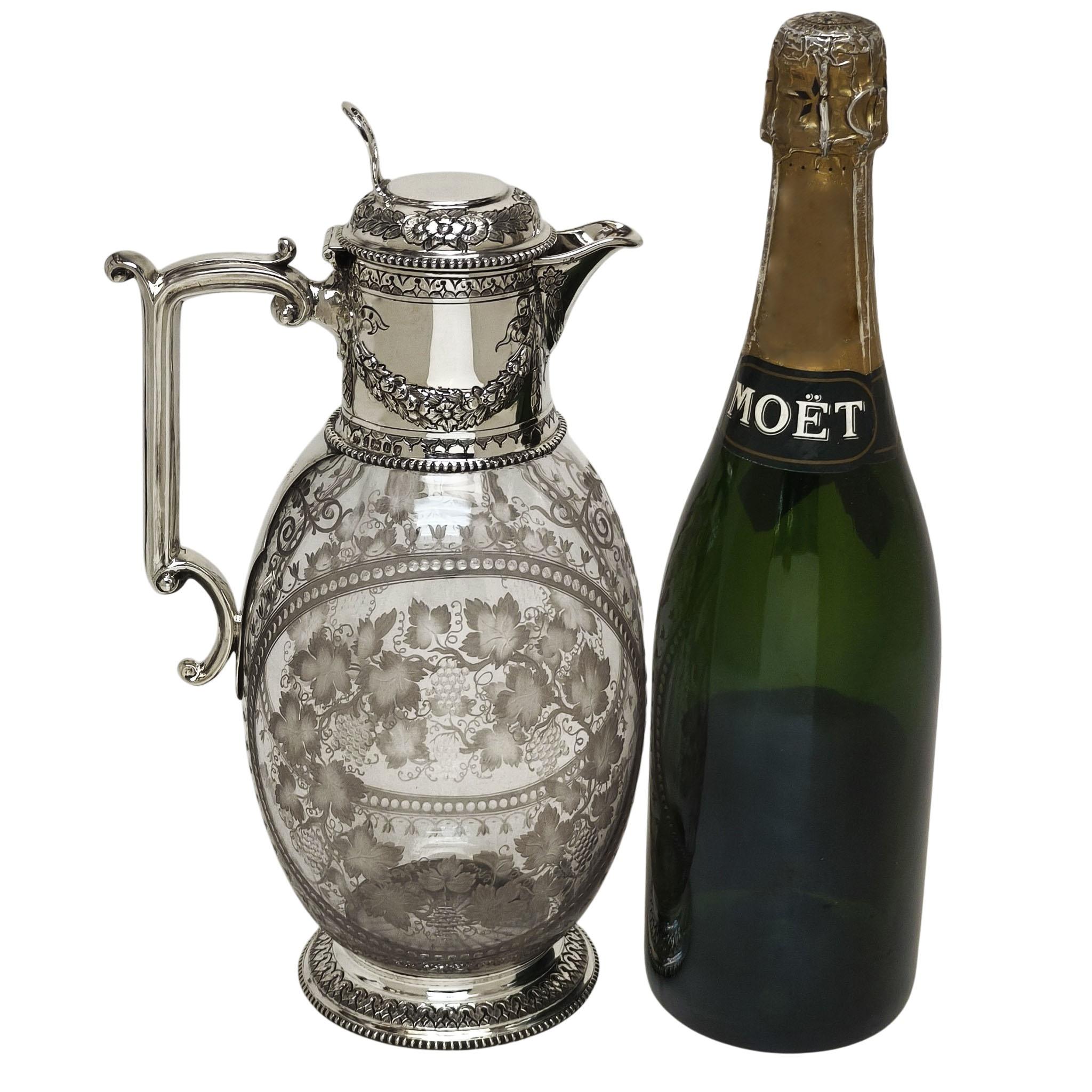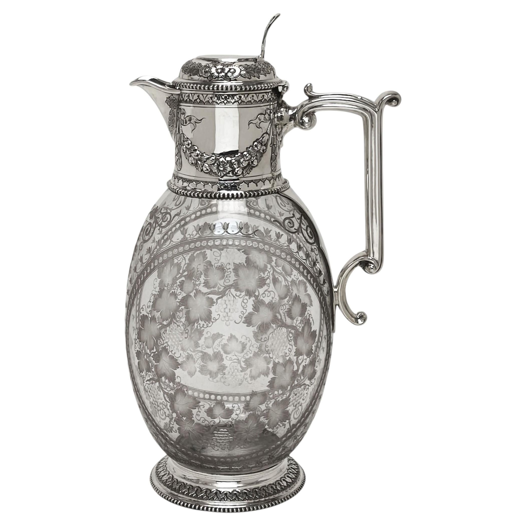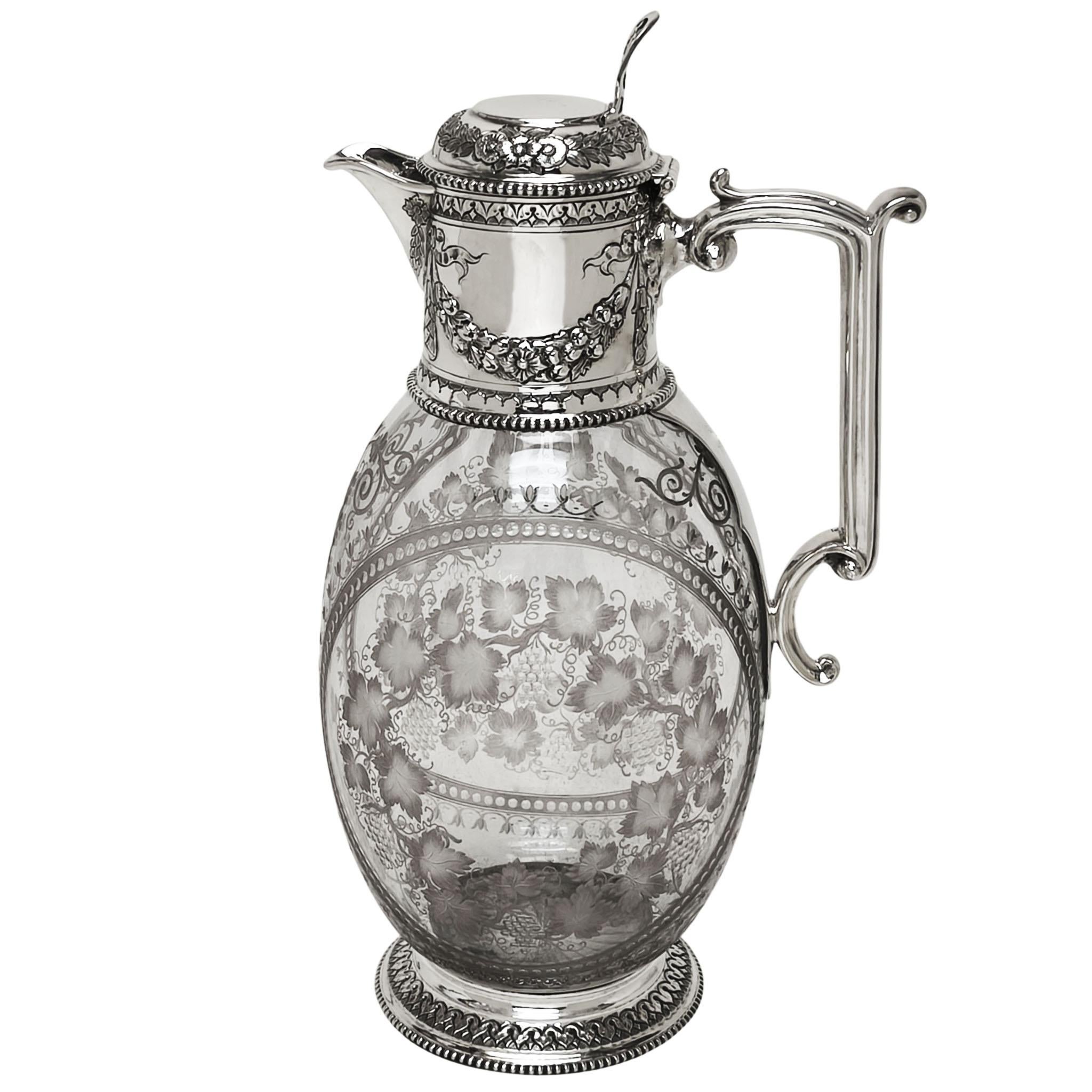 An elegant late 19th-century claret jug, combining refined silverwork with beautifully engraved glass, exemplifying the craftsmanship and taste of the Victorian period.