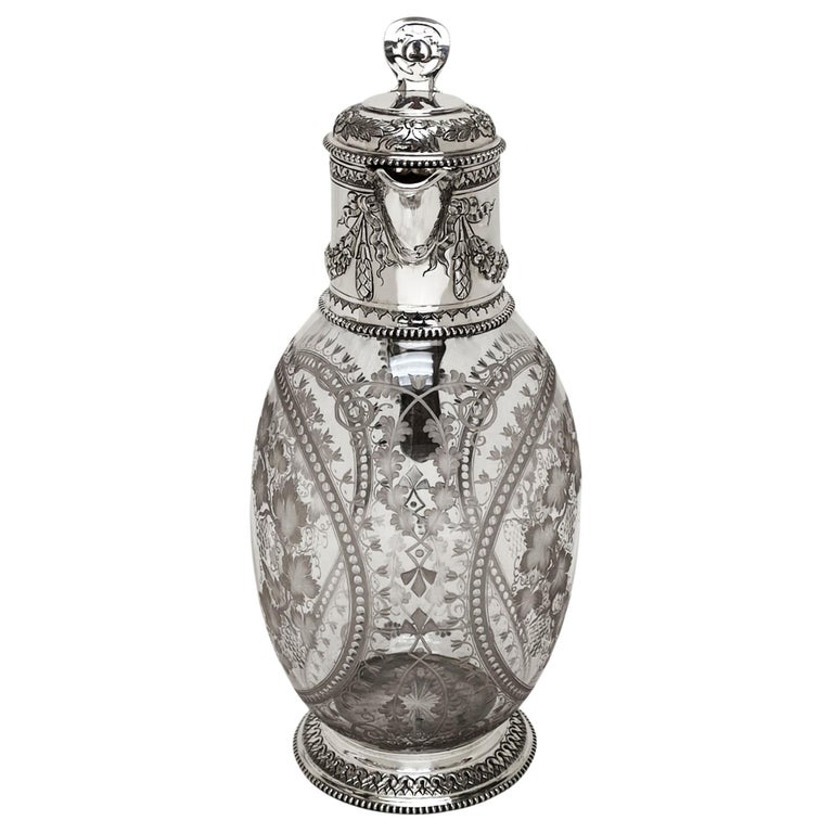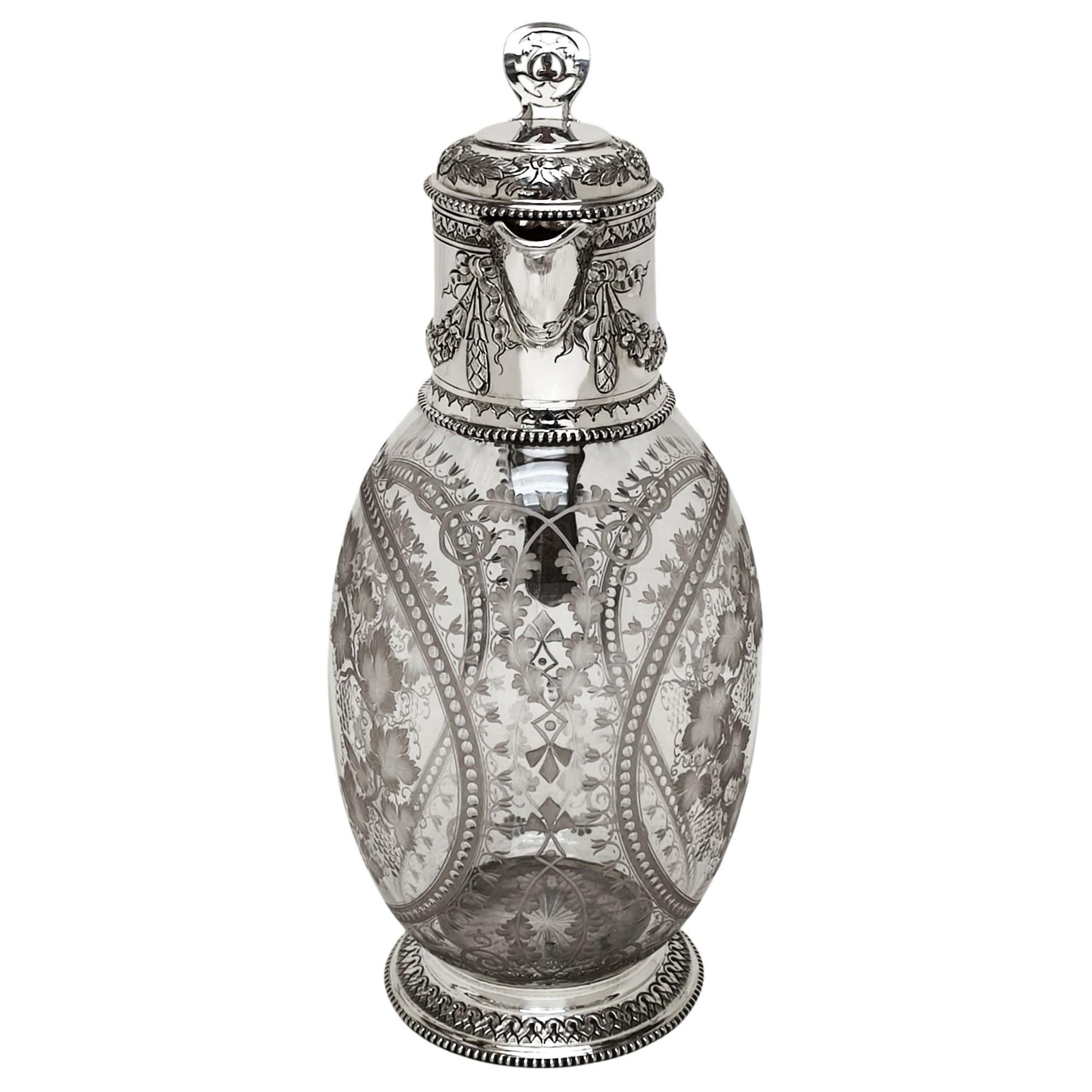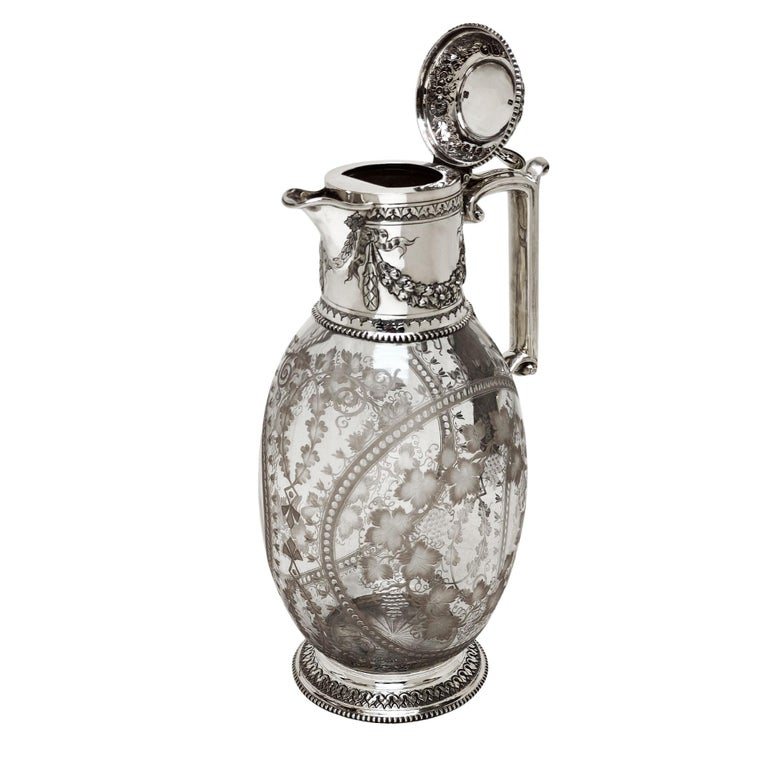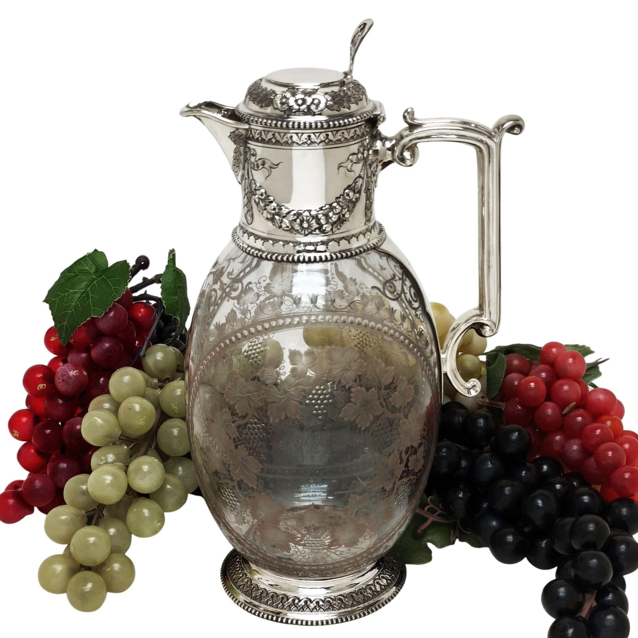 An elegant late 19th-century claret jug, combining refined silverwork with beautifully engraved glass, exemplifying the craftsmanship and taste of the Victorian period.