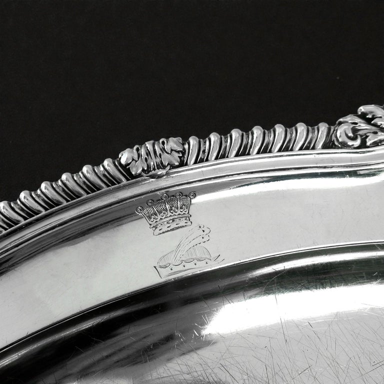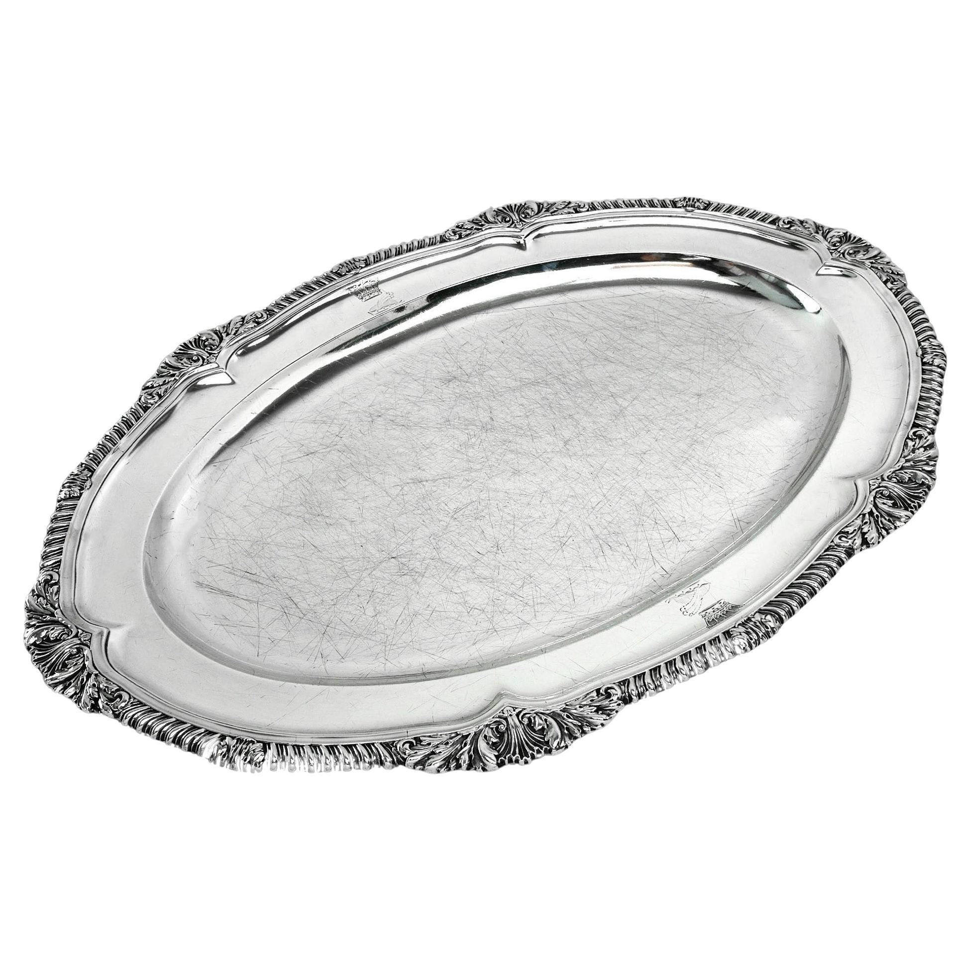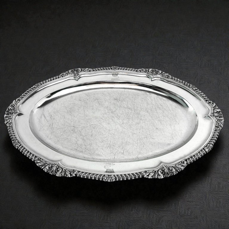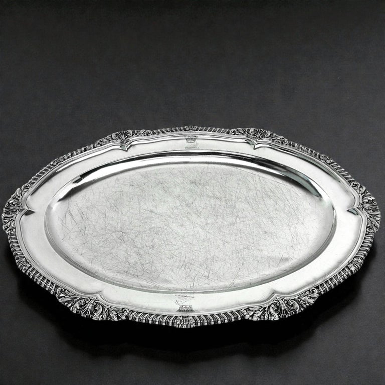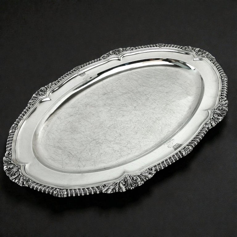 A Classic Georgian sterling silver Meat Dish serving platter. This Meat Platter is of substantial size and has a Classic oval shape. The Meat Platter has an ornate shell and gadroon border embellishing the rim. The Dish has two matched crests engraved on the rim.