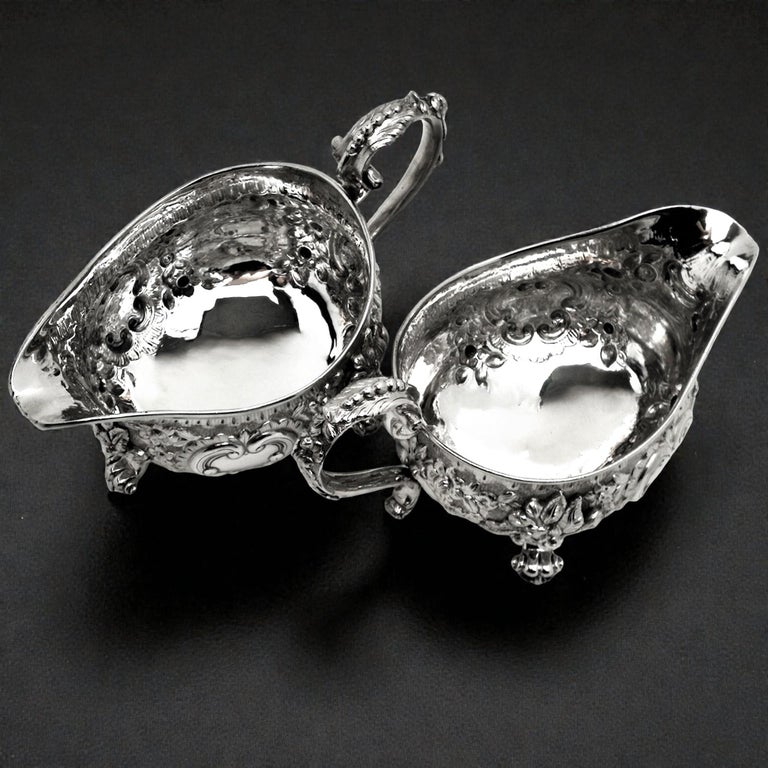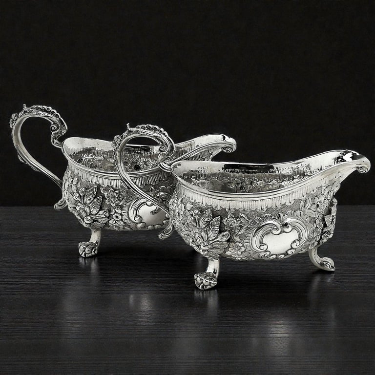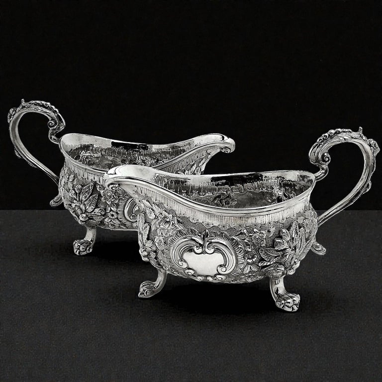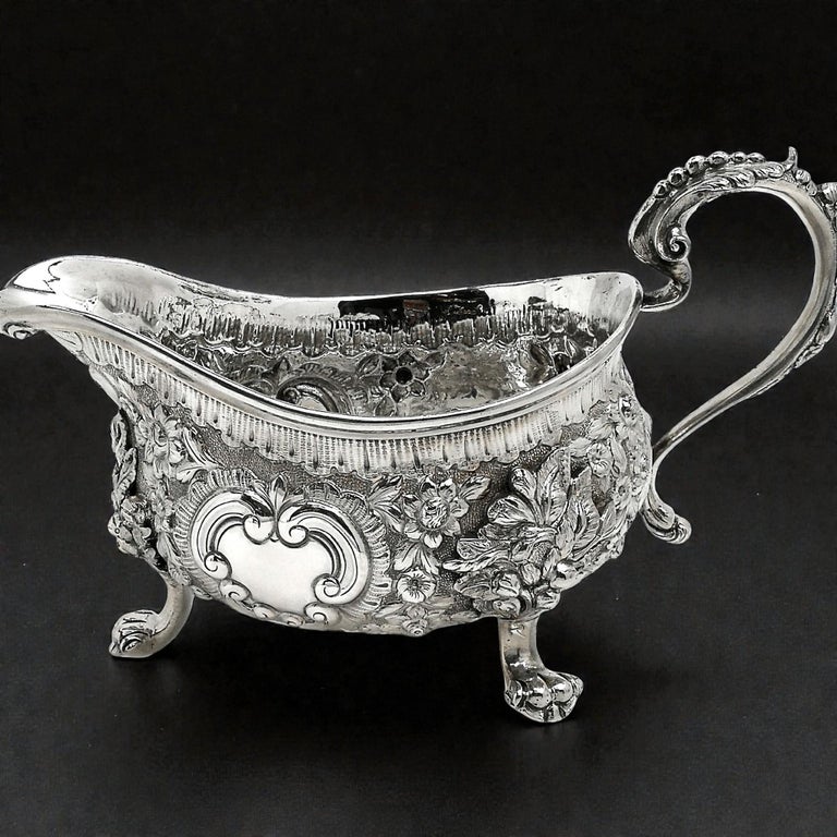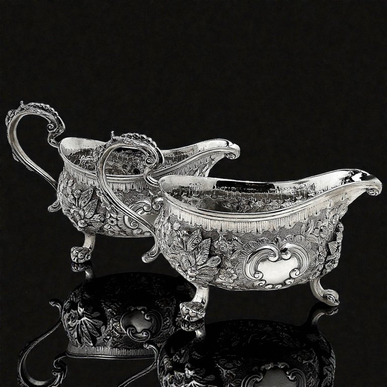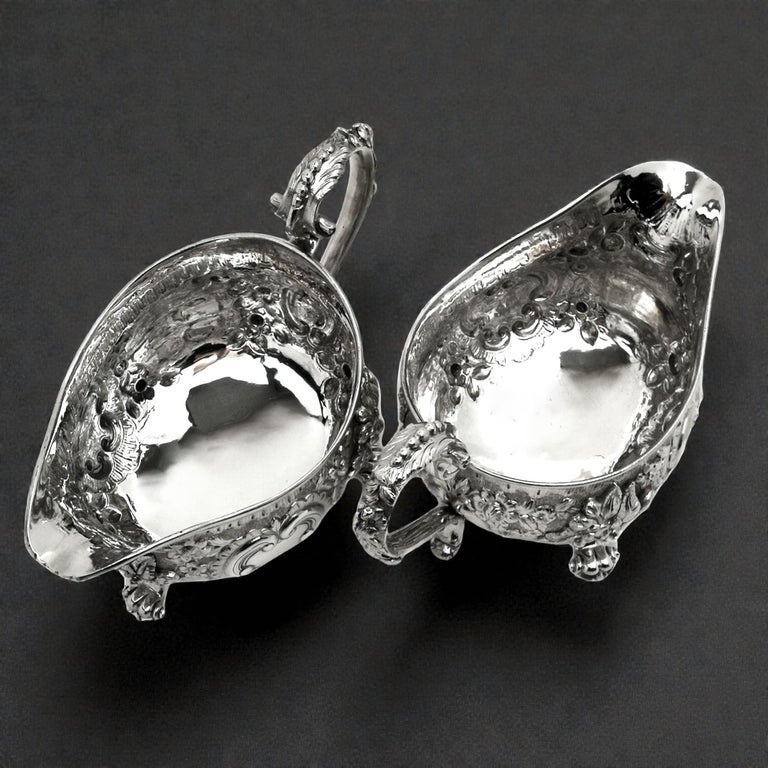An impressive Pair of Antique Georgian solid Silver Sauce / Gravy Boats. These beautiful Georgian Gravy Boats are of notably substantial size and heavy weight. Each Antique Sauce Boat is embellished with an ornate chased design incorporating floral and scroll patterns. Each Silver Jug has a pair of blank shaped cartouches suitable for engraving if desired. These Sauce Boats each stand on three scroll feet and have floral embellished scroll handles.