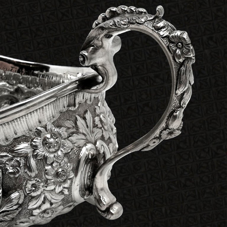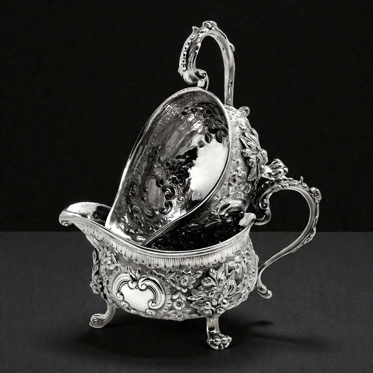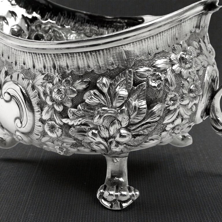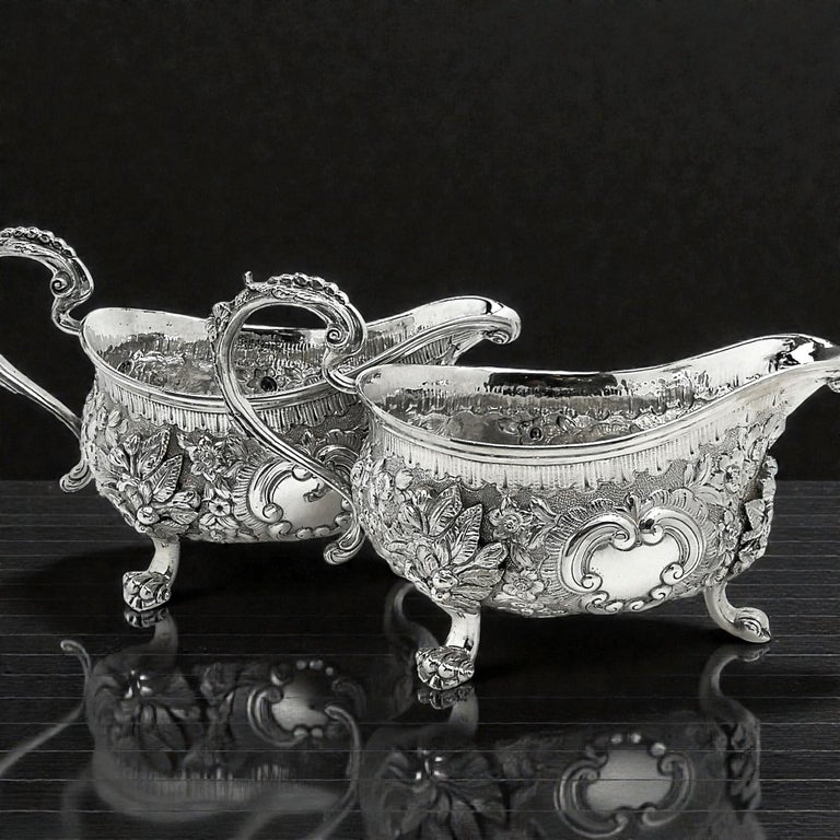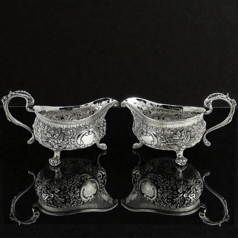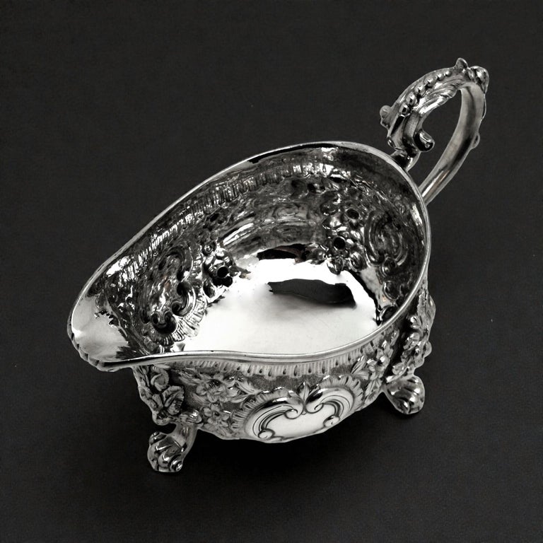 An impressive Pair of Antique Georgian solid Silver Sauce / Gravy Boats. These beautiful Georgian Gravy Boats are of notably substantial size and heavy weight. Each Antique Sauce Boat is embellished with an ornate chased design incorporating floral and scroll patterns. Each Silver Jug has a pair of blank shaped cartouches suitable for engraving if desired. These Sauce Boats each stand on three scroll feet and have floral embellished scroll handles.