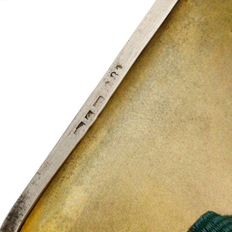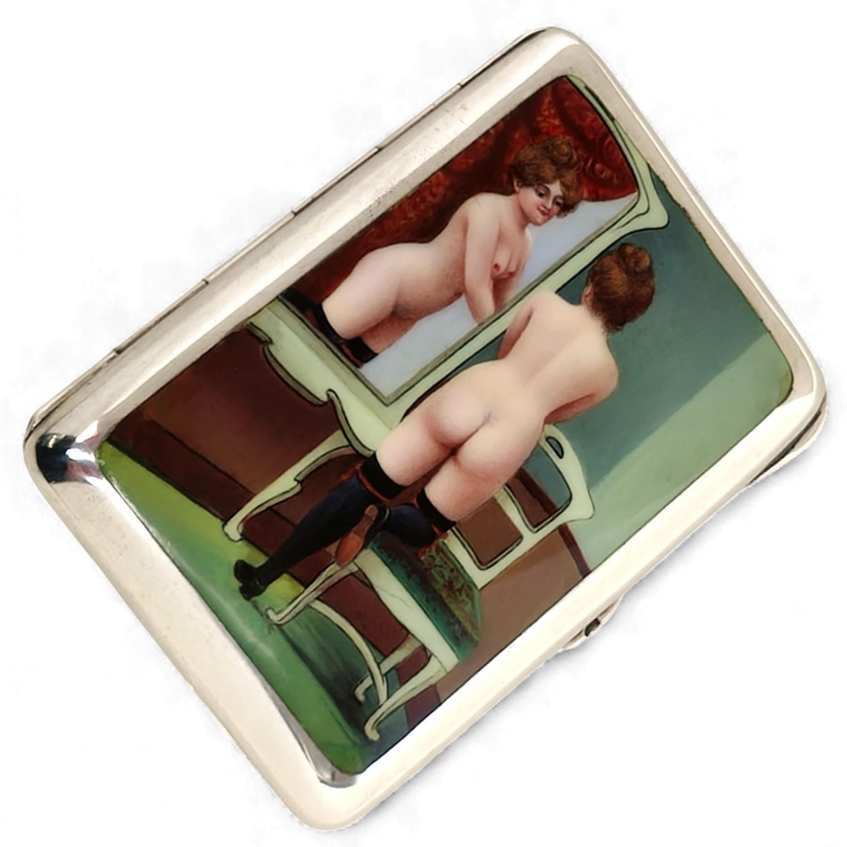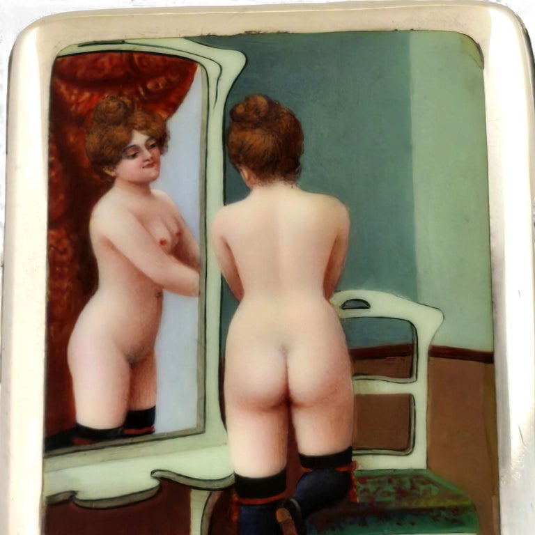 A magnificent Antique Silver & Enamel Cigarette Case with a subtle Erotic Theme showing a nude woman glancing in a mirror. This Enamel Case is created using rich, deep colours. The interior of the case is gilded.