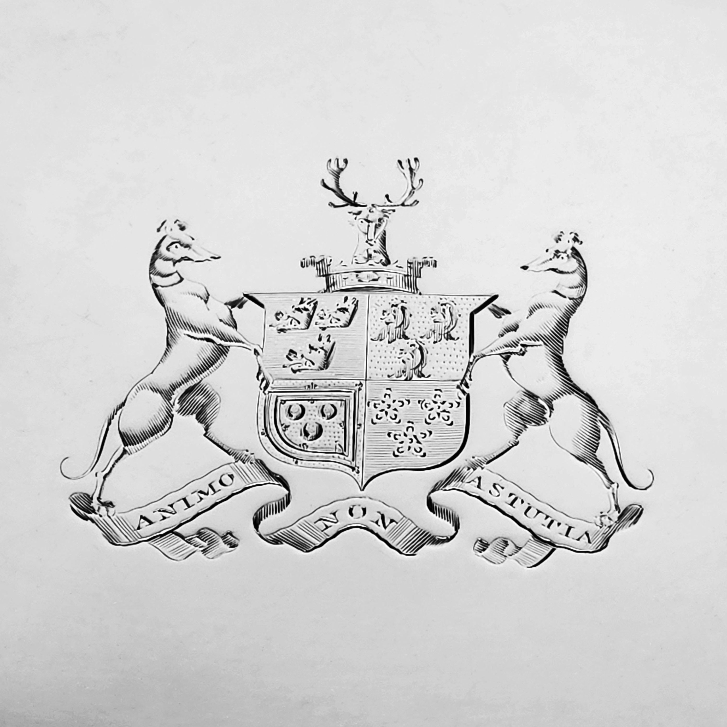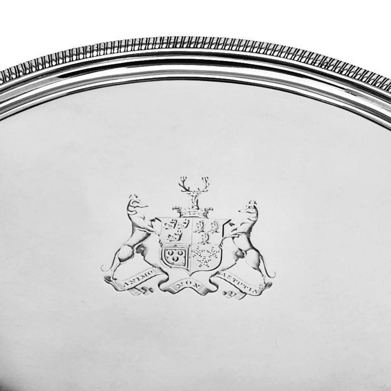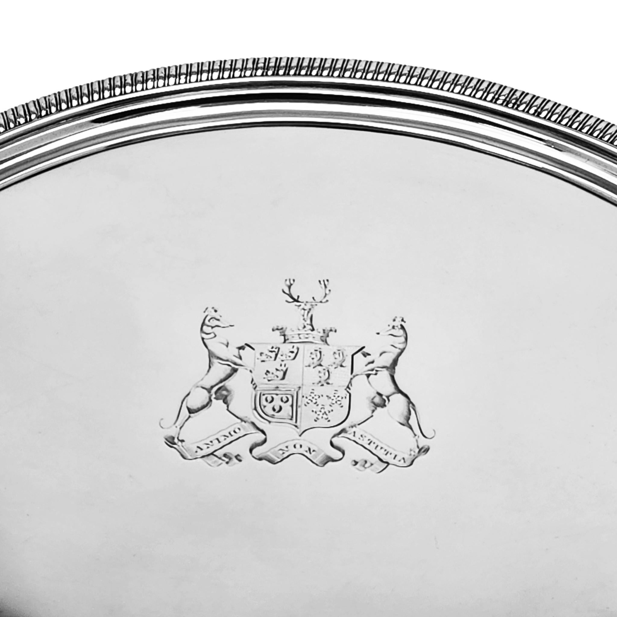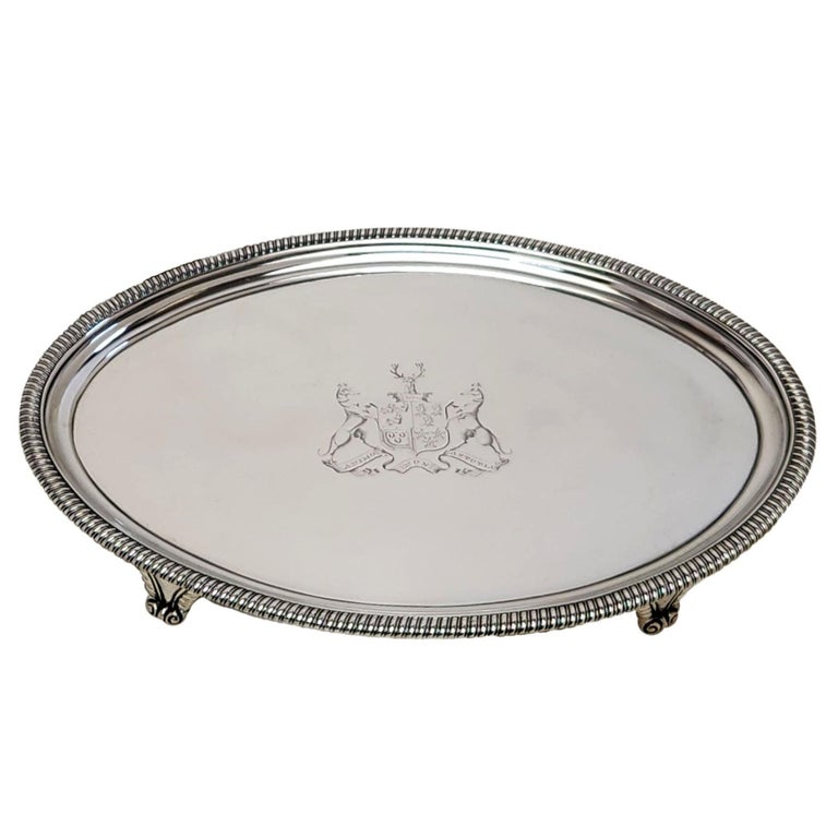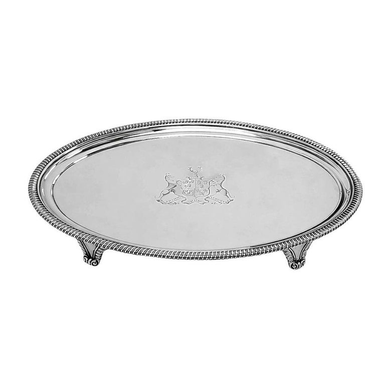 As elegant George III Oval Silver Salver with a classic gadroon borders. This Salver has an impressive armorial engraved in the centre and stands on stands on four gadroon patterned feet.