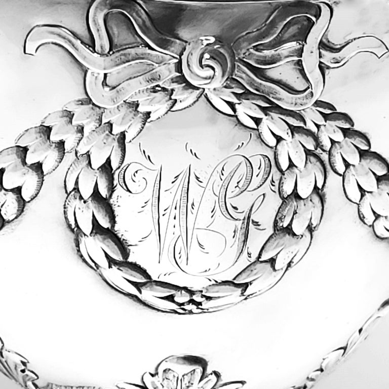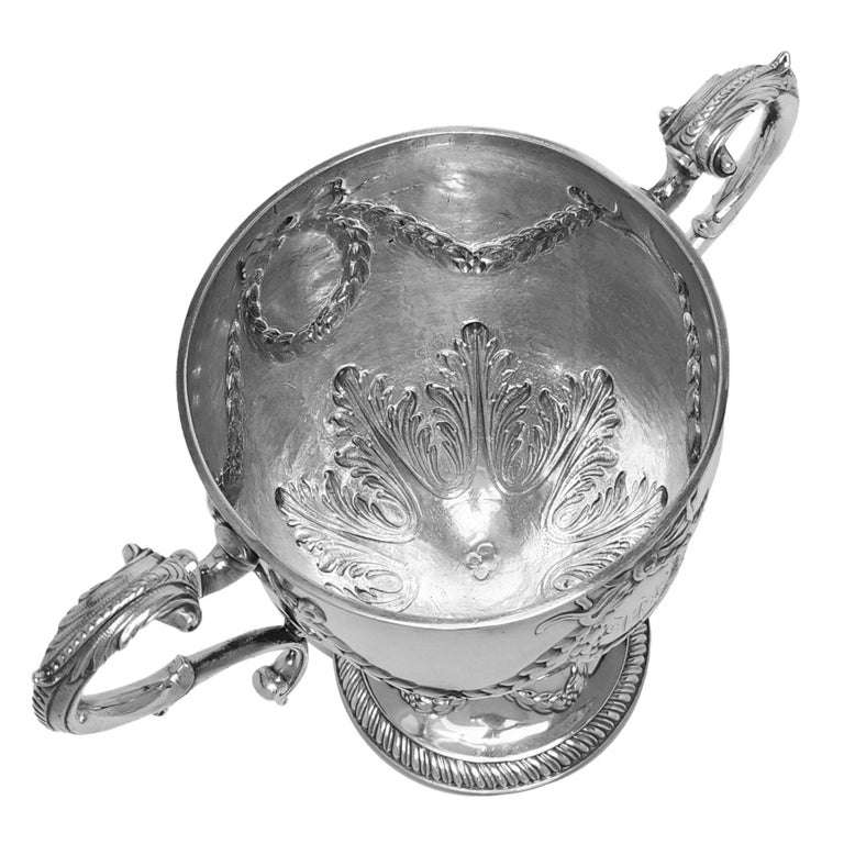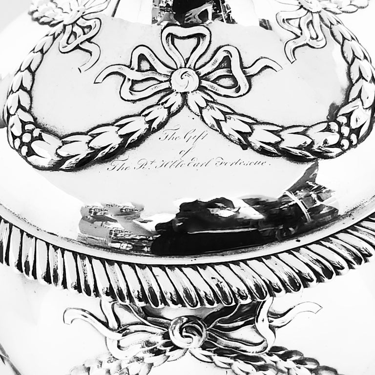 An Antique George III Sterling Silver Cup & Cover embellished with a classic swag and bow chased design. The Swags encircle oval cartouches on both sides of the trophy and each cartouche has a monogram engraved in the centre. The swag and bow design is mirrored on the lid and foot of the trophy. The Trophy has a pair of classic acanthus leaf topped scroll handles and an impressive finial on the lid.