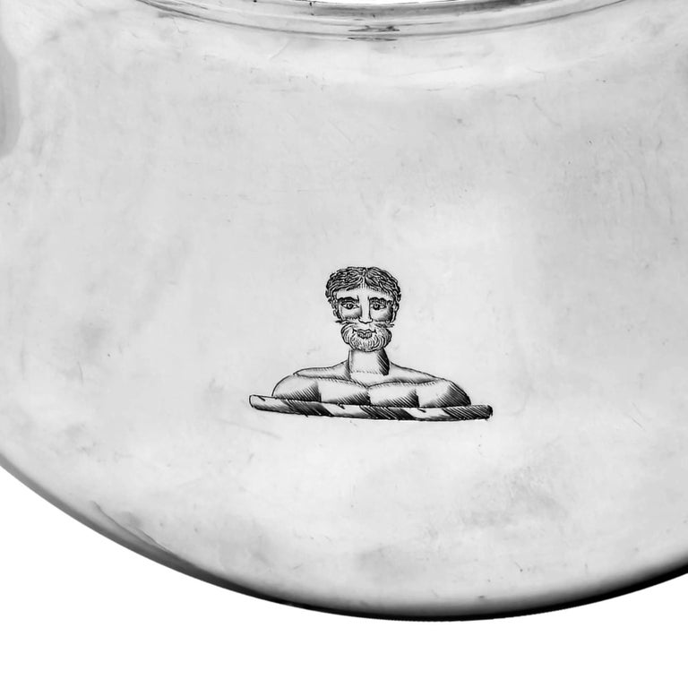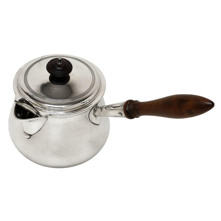 A classic Antique George IV Solid Silver Brandy Pan with a fitted lid. This Georgian Brandy Pan has a traditional Baluster Shape and an elegant wooden handle. The Lid has a subtle reeded band engraved on the top and features a wooden finial and a hinged cover for the spout to allow for pouring with the lid on. The Silver Pan has a crest engraved opposite the handle.