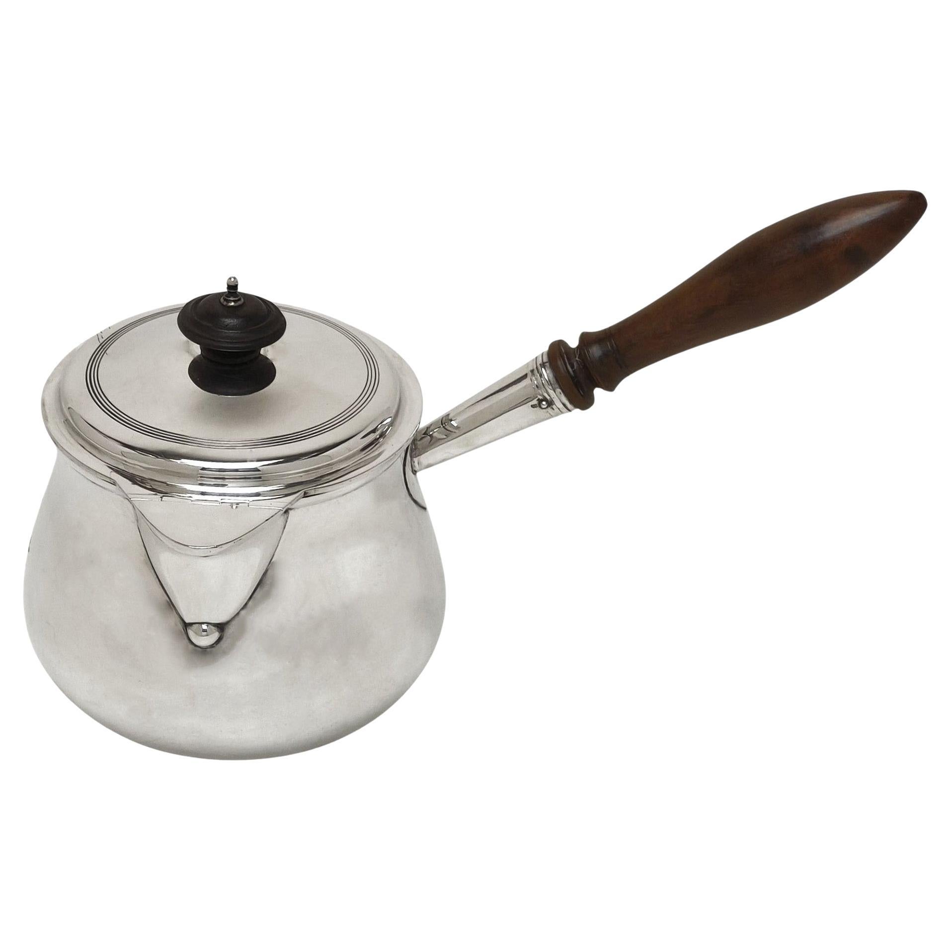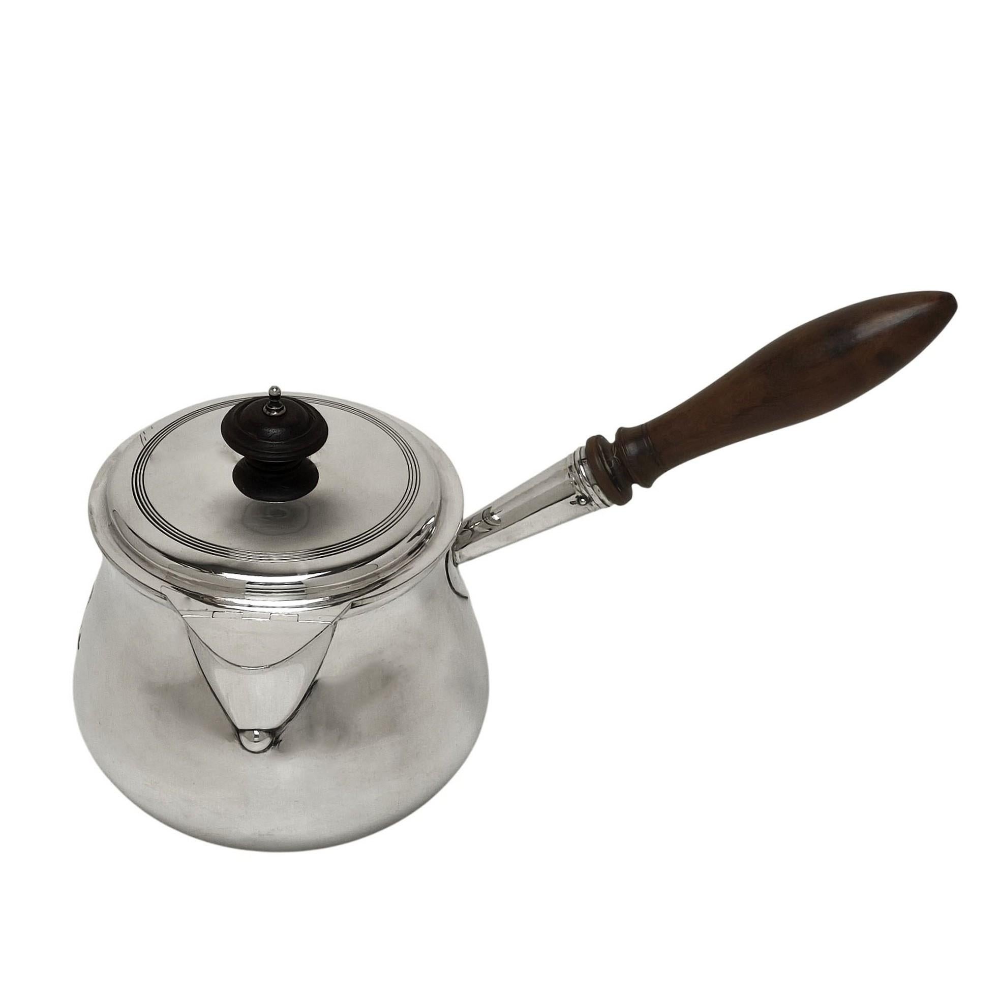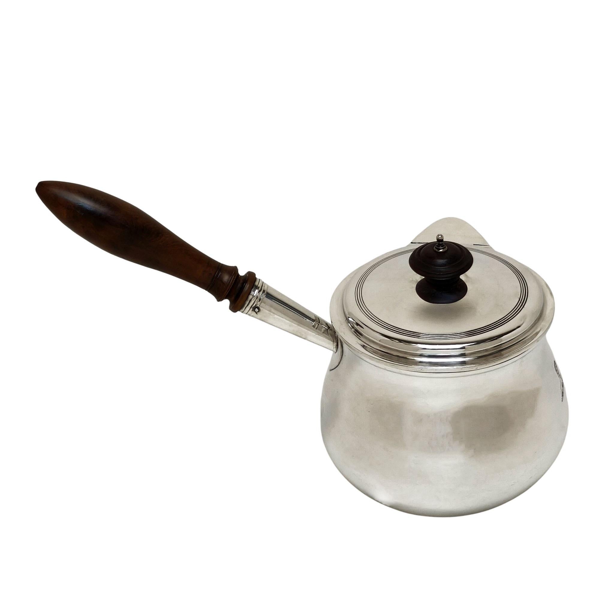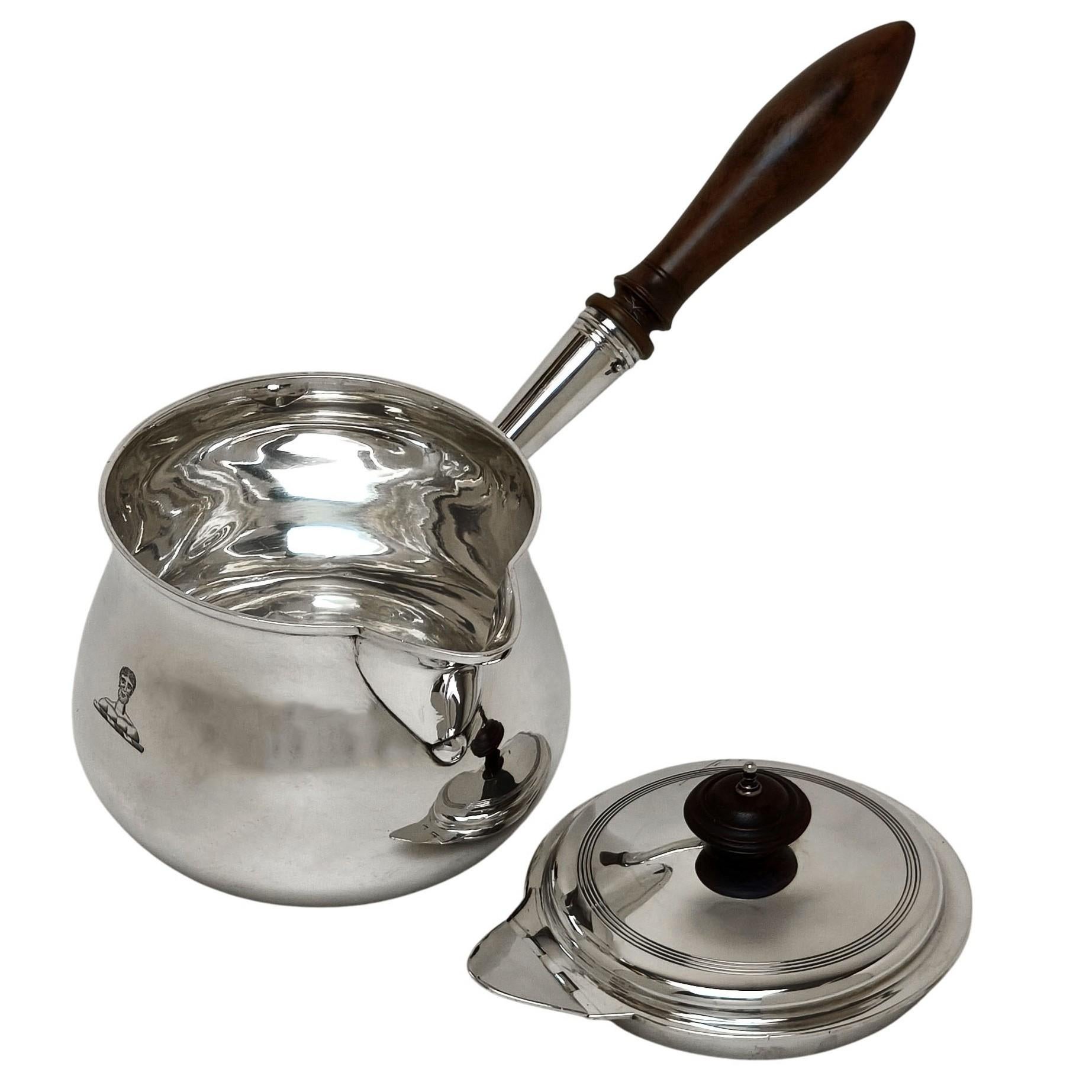 A classic Antique George IV Solid Silver Brandy Pan with a fitted lid. This Georgian Brandy Pan has a traditional Baluster Shape and an elegant wooden handle. The Lid has a subtle reeded band engraved on the top and features a wooden finial and a hinged cover for the spout to allow for pouring with the lid on. The Silver Pan has a crest engraved opposite the handle.