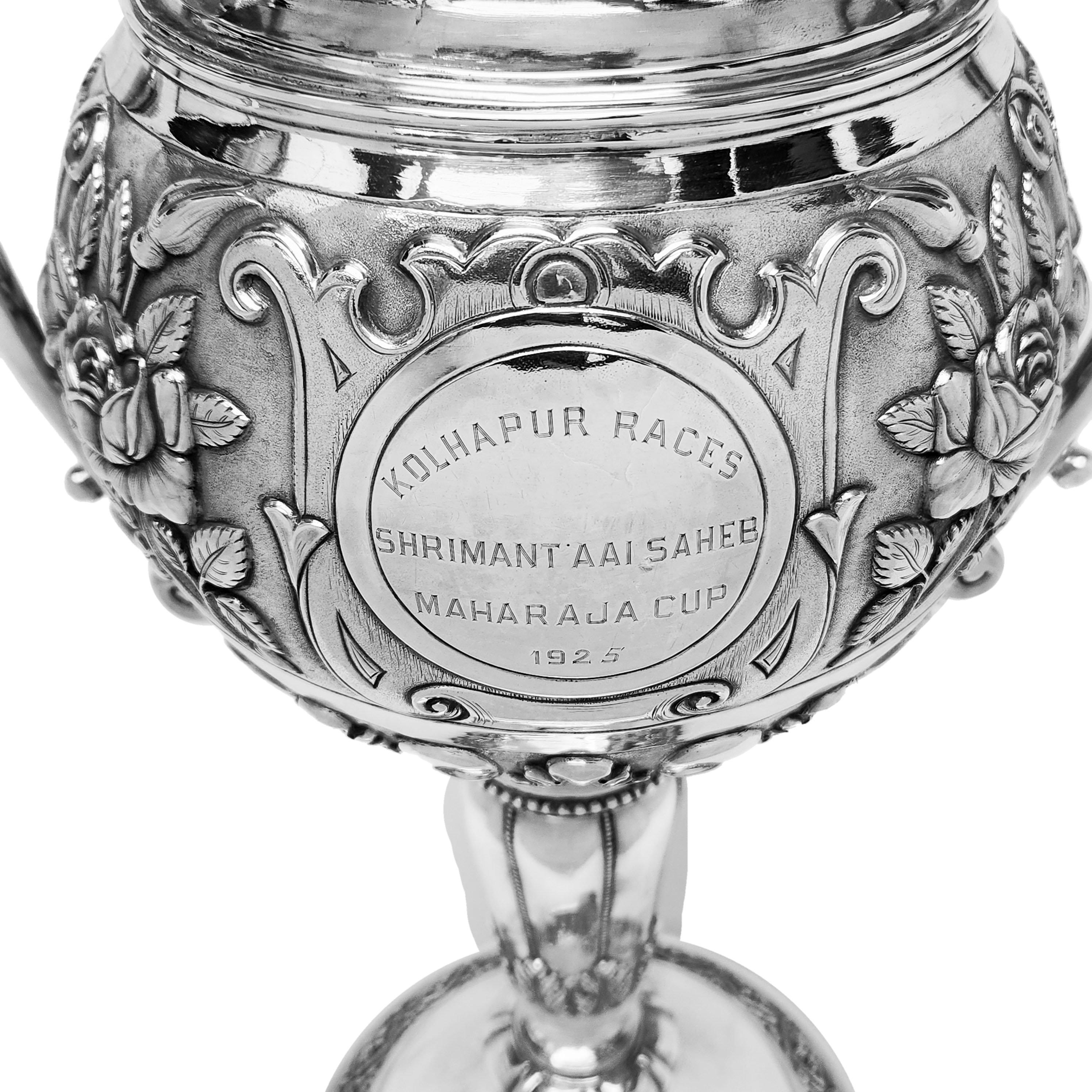 The cup was a prize awarded in the 1925 Kolhapur Races and is engraved 'KOLHAPUR RACES SHRIMANT AAI SAHEB MAHARAJA CUP 1925' It is a lidded cup that can be used as a centre piece or as an impressive vase with the fitted lid removed.