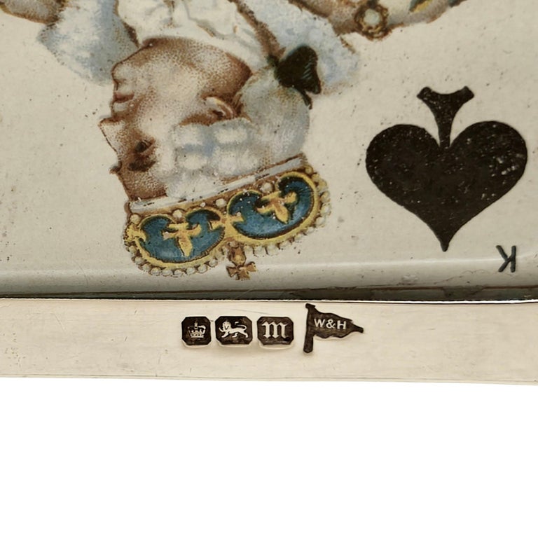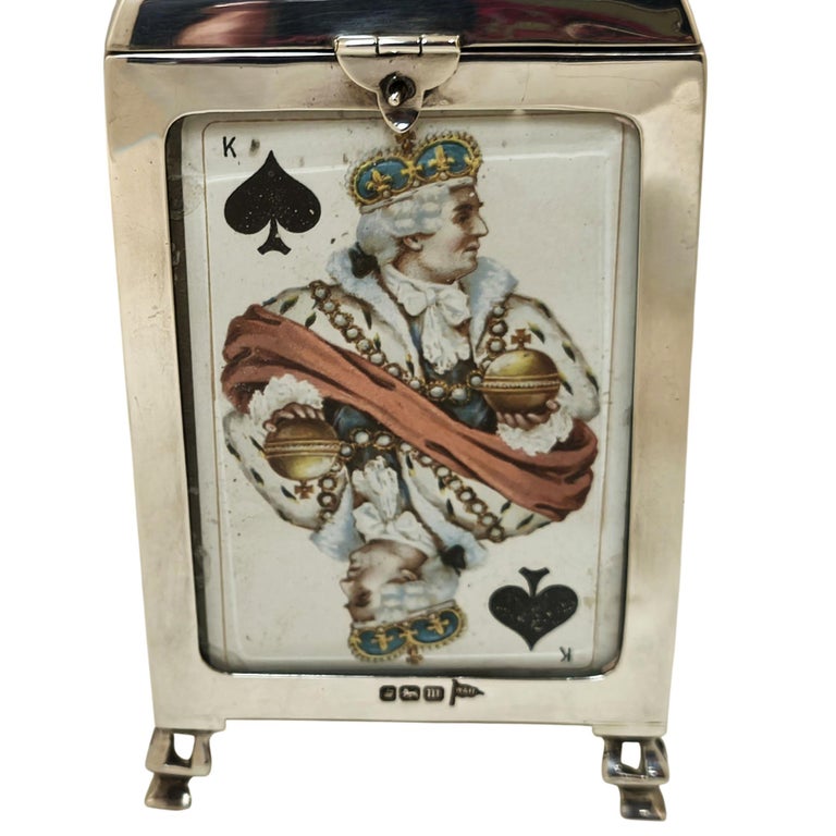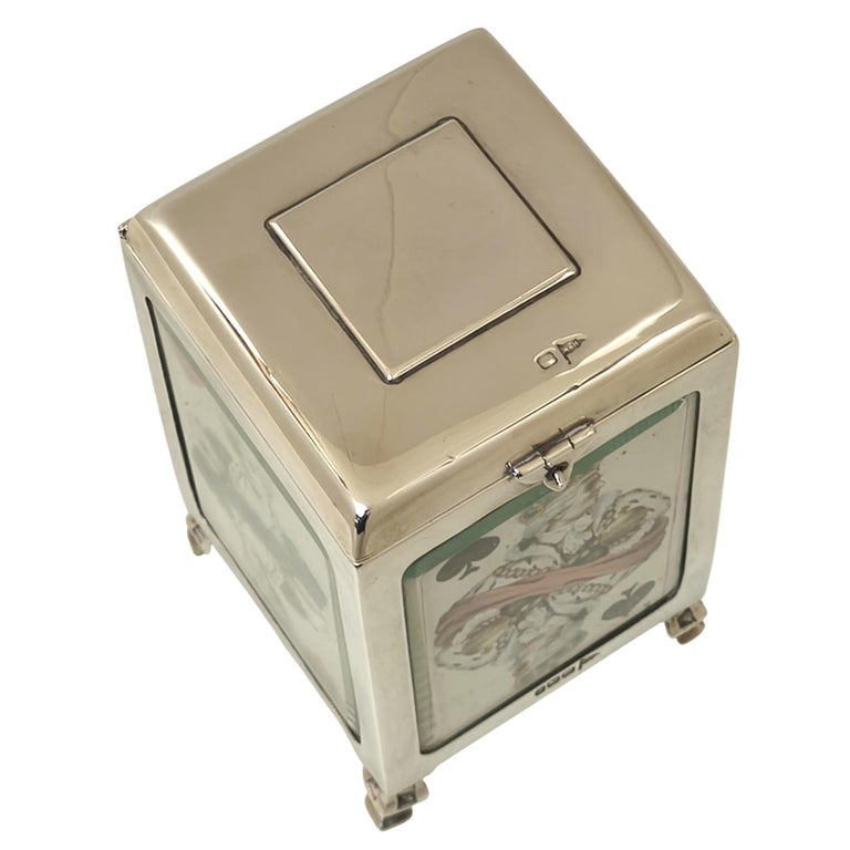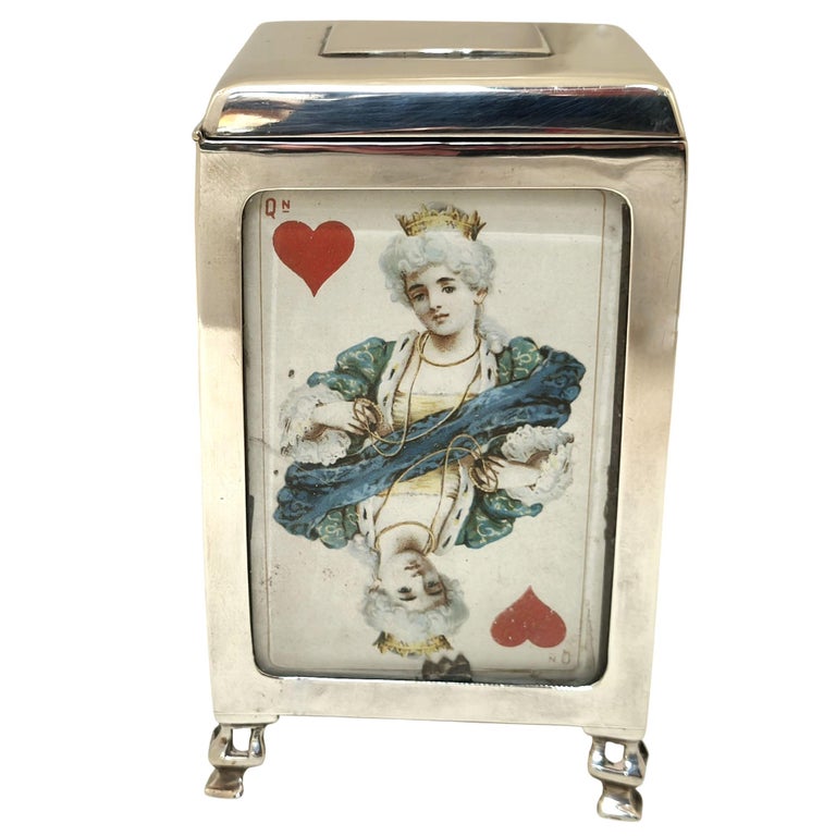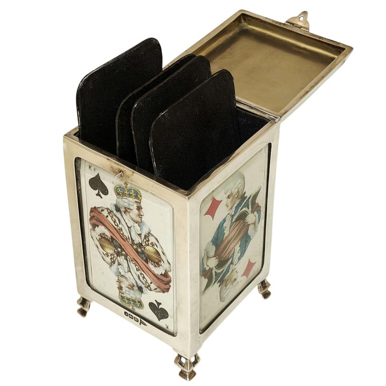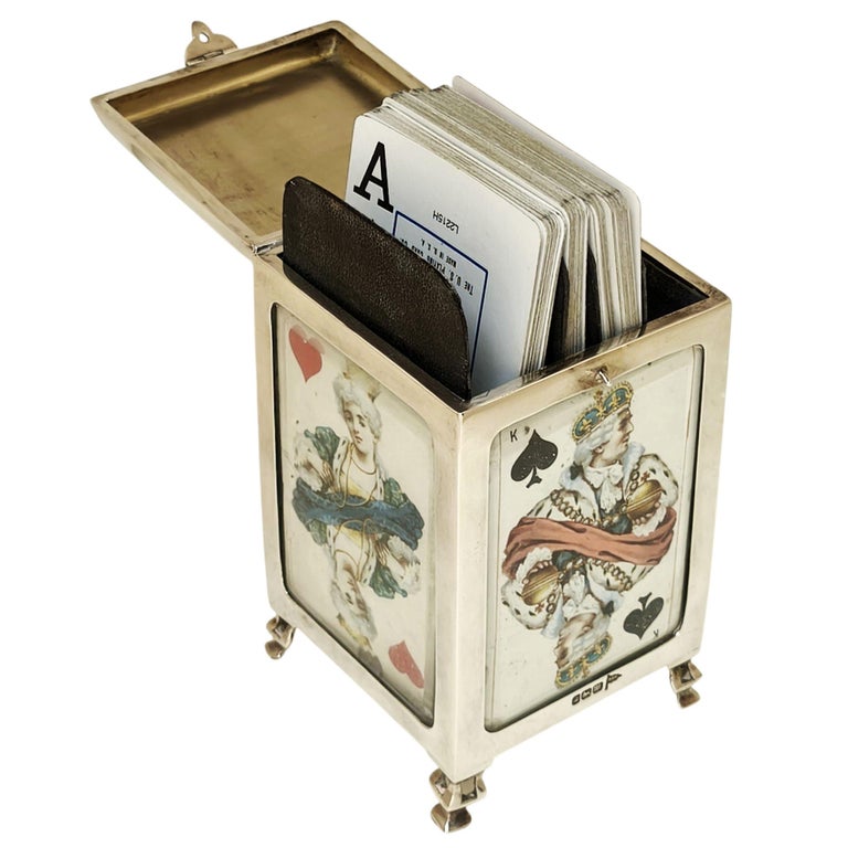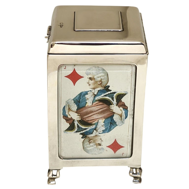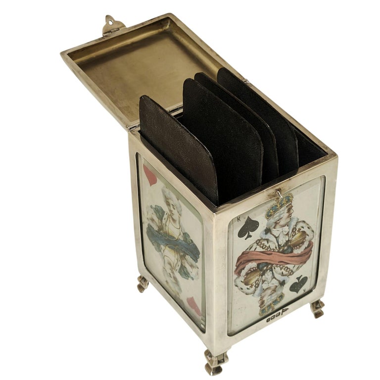 A lovely Antique Sterling Silver & Glass Playing Card Box in a rectangular form standing on 4 feet. Each of the 4 side panels is inset with a glass panel, behind which is a different face playing card including a King of Spades, a Queen of Hearts, a Queen of Clubs and a Jack of Diamonds. The Playing Card Case has a hinged lid and its interior holds a black spring loaded liner with space for three decks of cards.