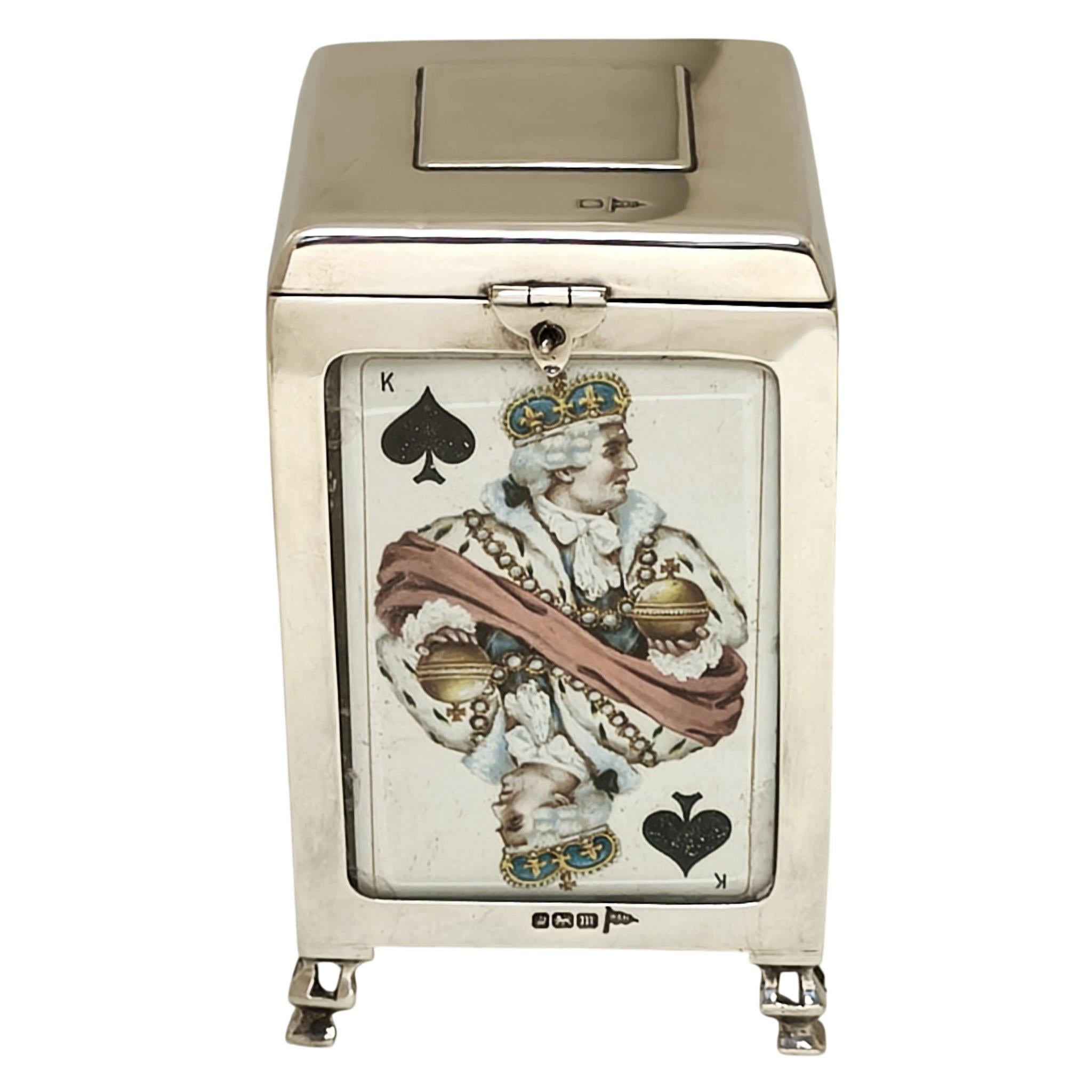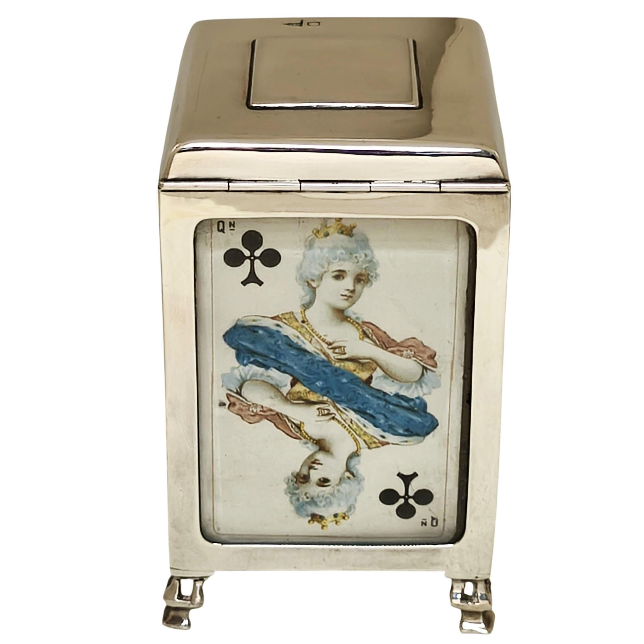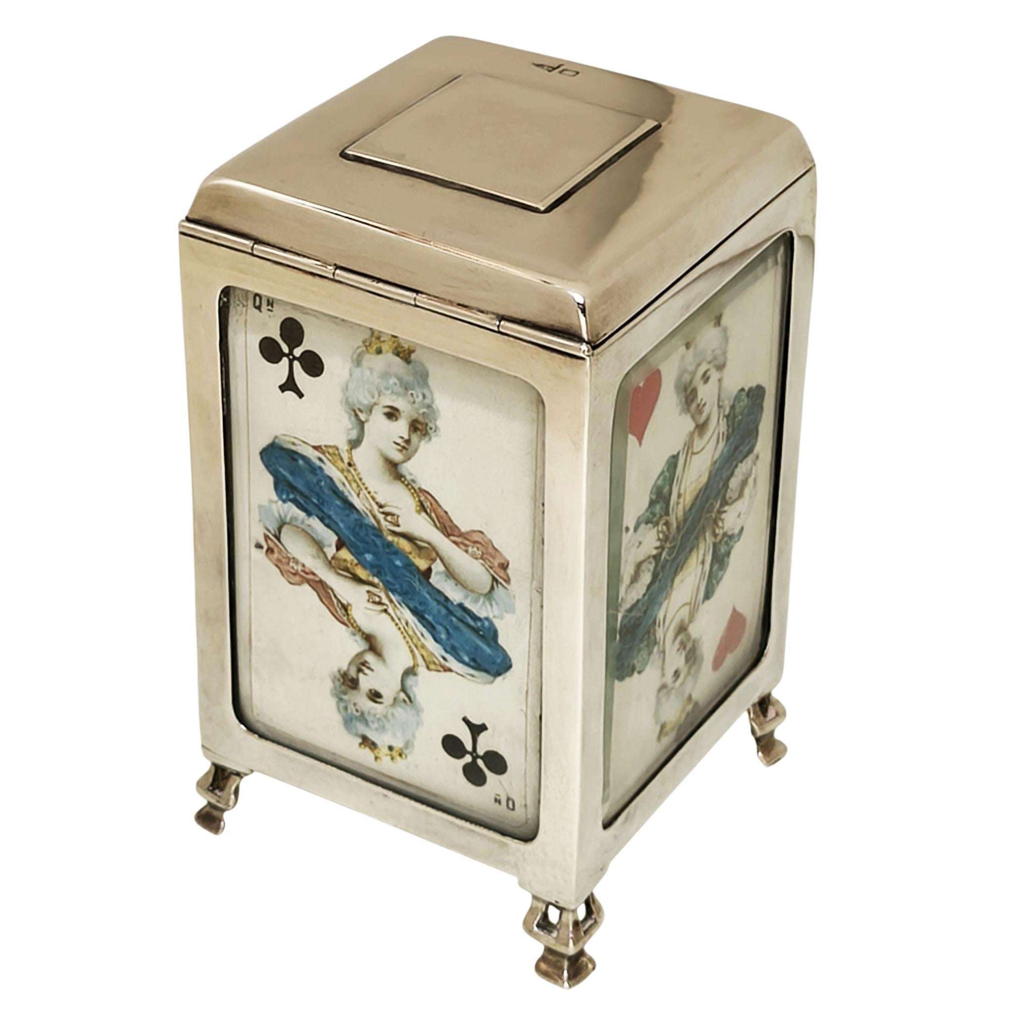 A lovely Antique Sterling Silver & Glass Playing Card Box in a rectangular form standing on 4 feet. Each of the 4 side panels is inset with a glass panel, behind which is a different face playing card including a King of Spades, a Queen of Hearts, a Queen of Clubs and a Jack of Diamonds. The Playing Card Case has a hinged lid and its interior holds a black spring loaded liner with space for three decks of cards.