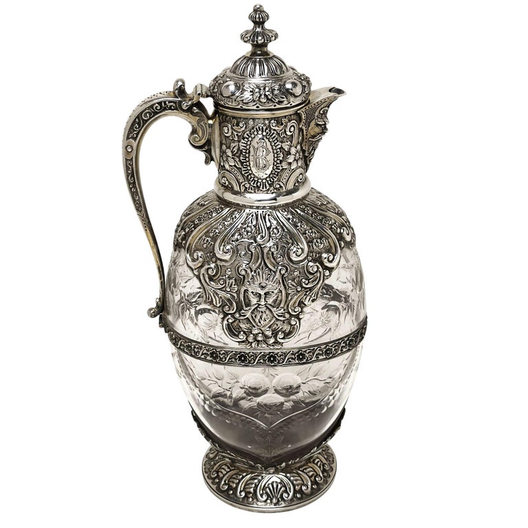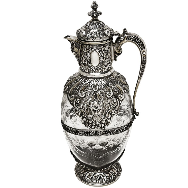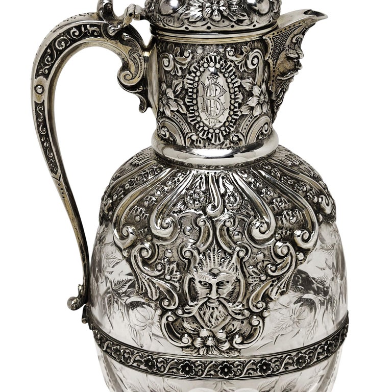 An Antique Victorian Silver and Cut Glass Claret Jug with an oval form. This clear oval cut glass is engraved with floral and foliate motifs, allowing light to refract richly through the surface. Encasing the upper portion of the glass is a lavish silver mount chased and repoussé with scrolling acanthus, flowers, and a prominent classical mask at the front. This mask is repeated in three dimensions below the spout and the jug has an ornate chased neck and hinged lid. The Jug stands on a chased spread foot and has a pierced floral band around the centre of the body.