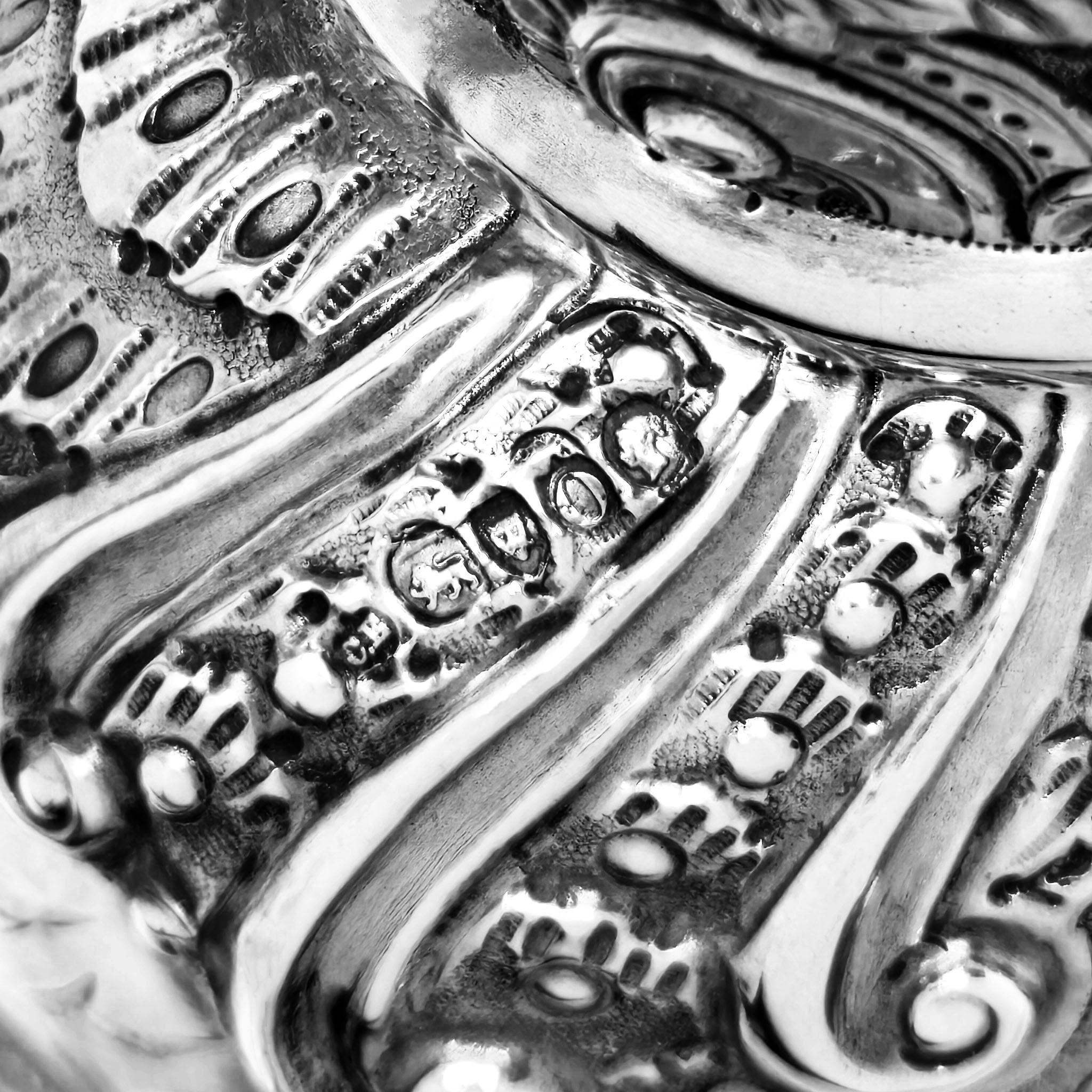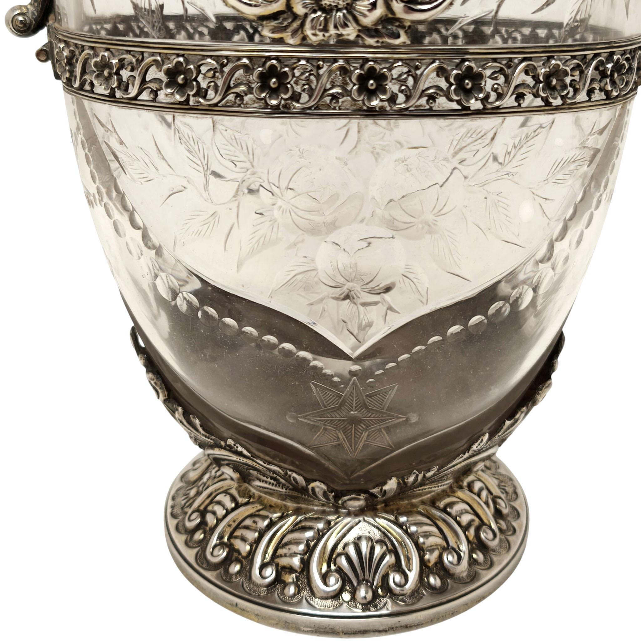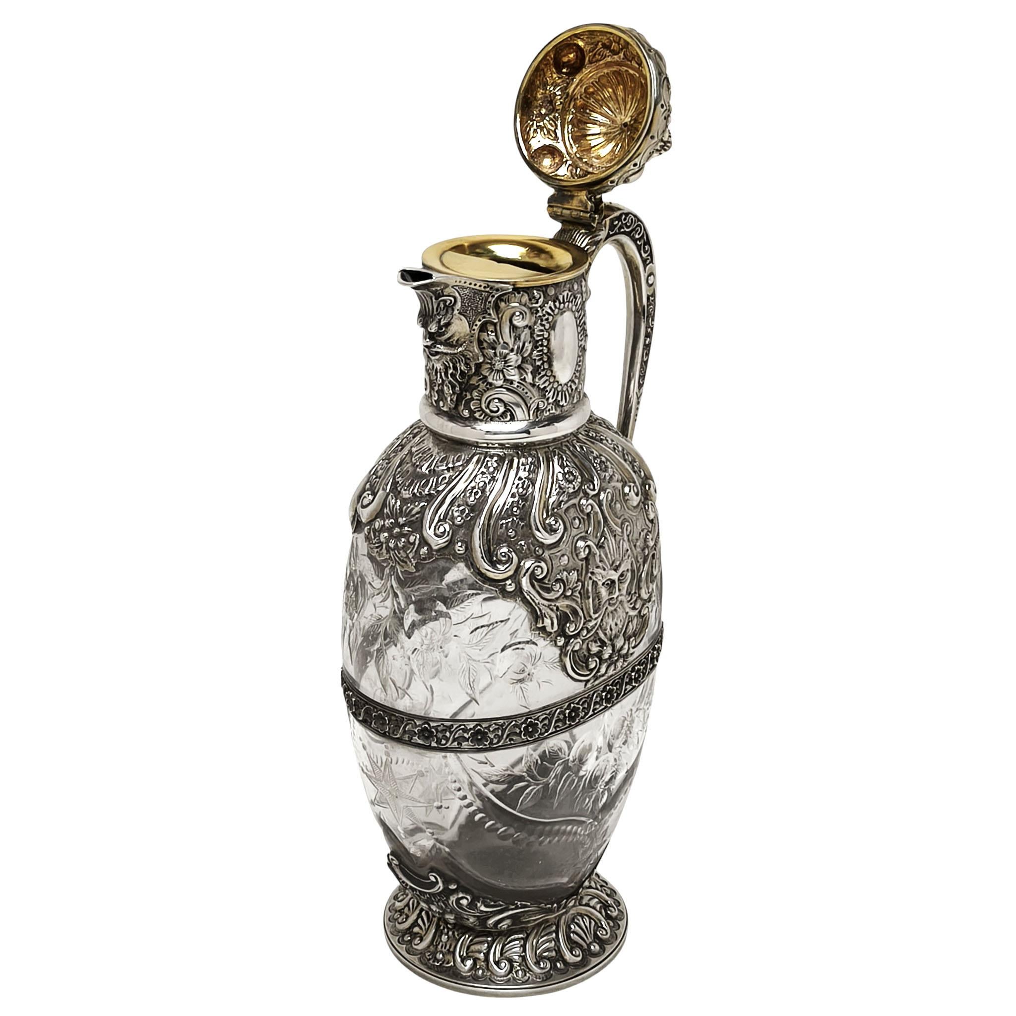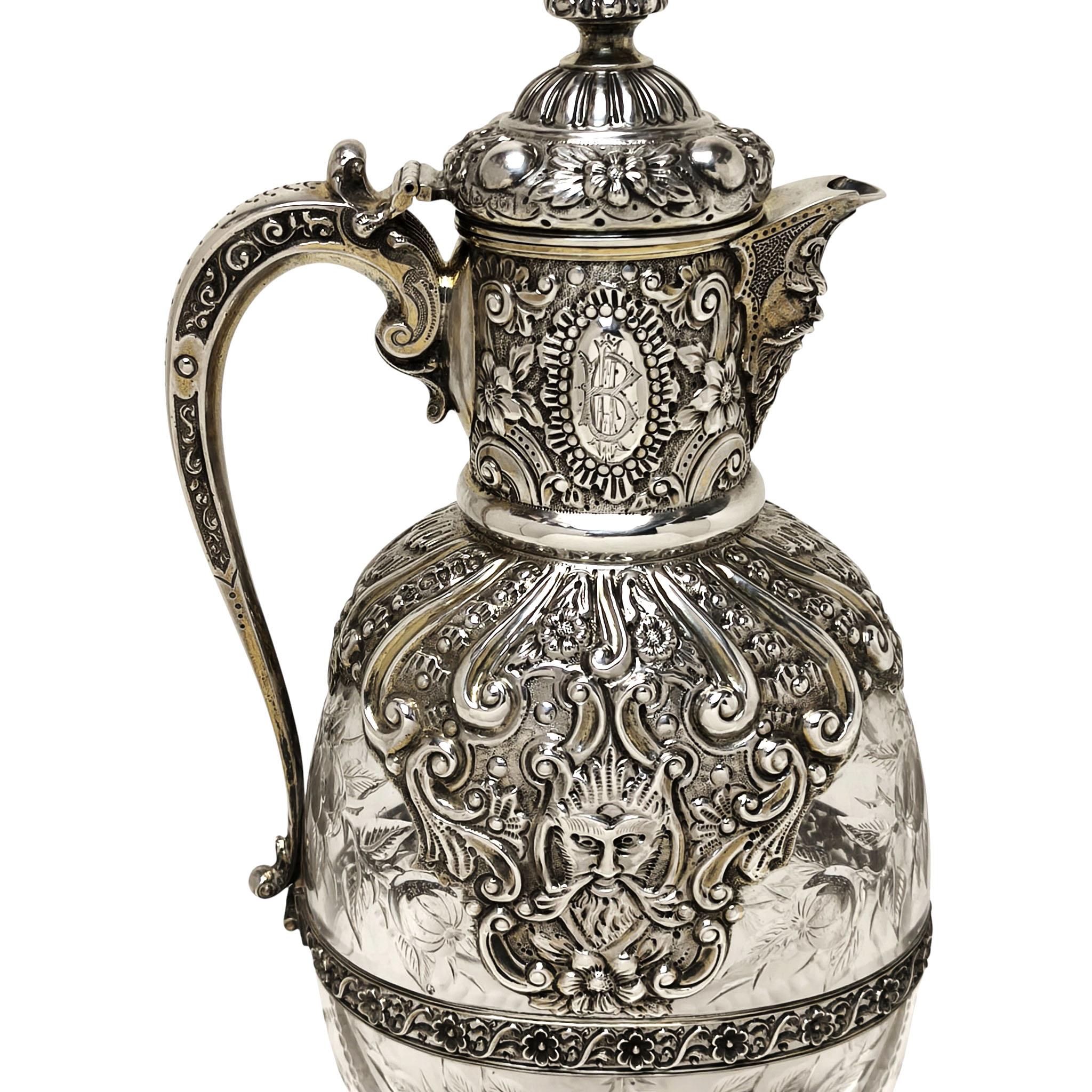 An Antique Victorian Silver and Cut Glass Claret Jug with an oval form. This clear oval cut glass is engraved with floral and foliate motifs, allowing light to refract richly through the surface. Encasing the upper portion of the glass is a lavish silver mount chased and repoussé with scrolling acanthus, flowers, and a prominent classical mask at the front. This mask is repeated in three dimensions below the spout and the jug has an ornate chased neck and hinged lid. The Jug stands on a chased spread foot and has a pierced floral band around the centre of the body.