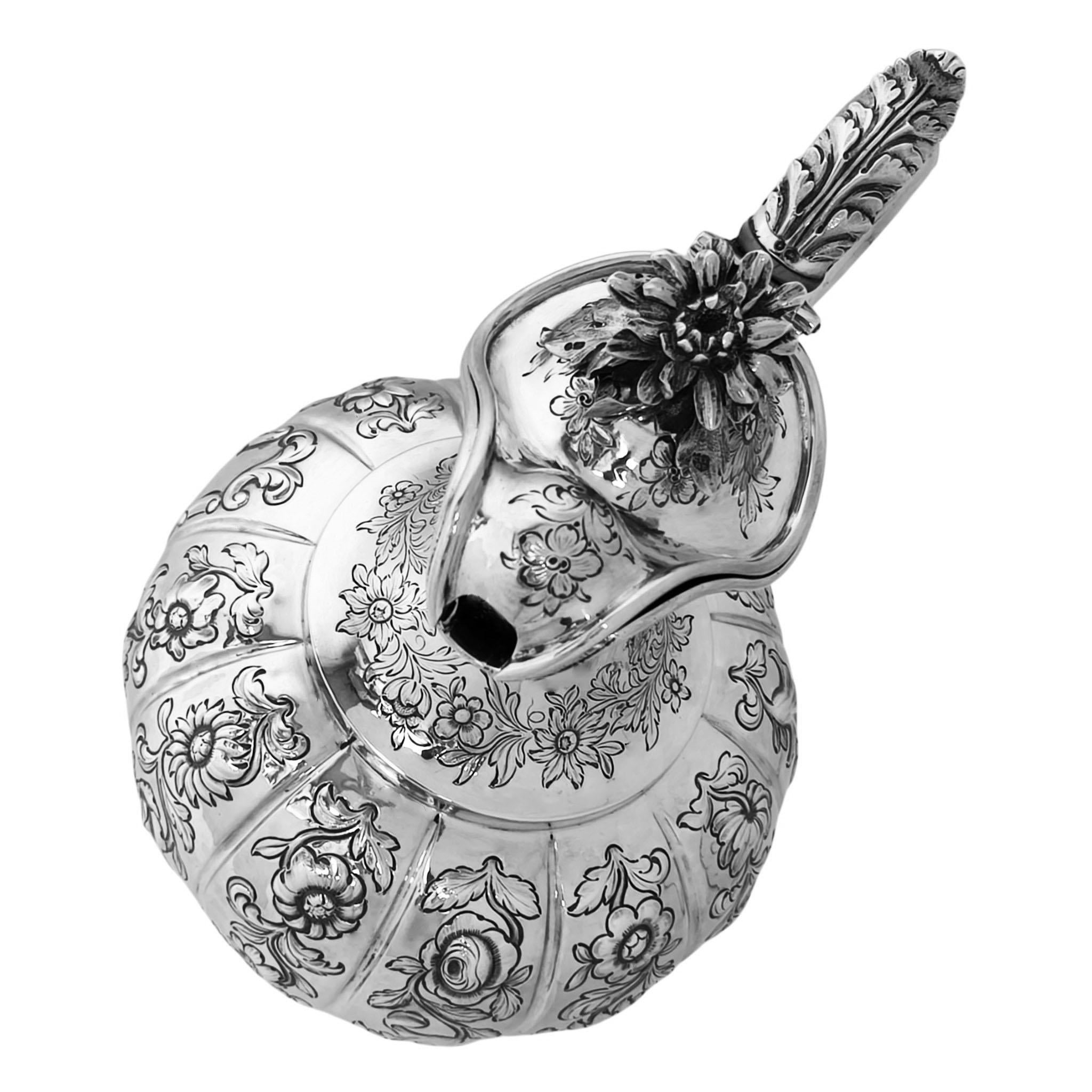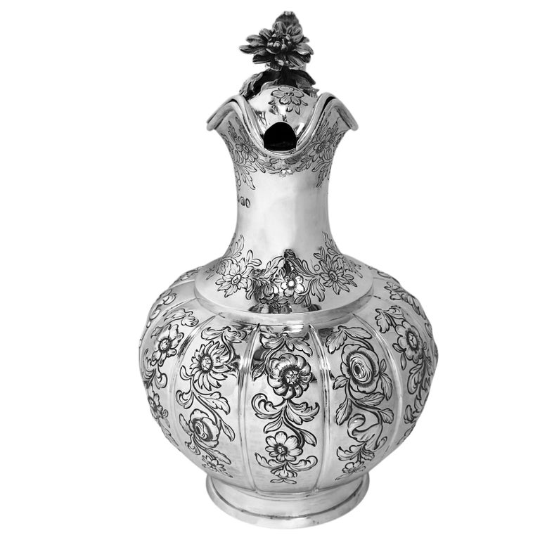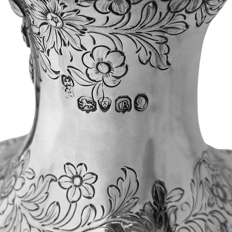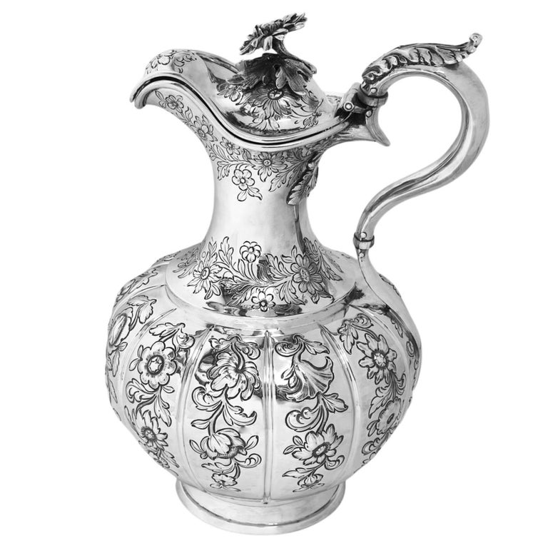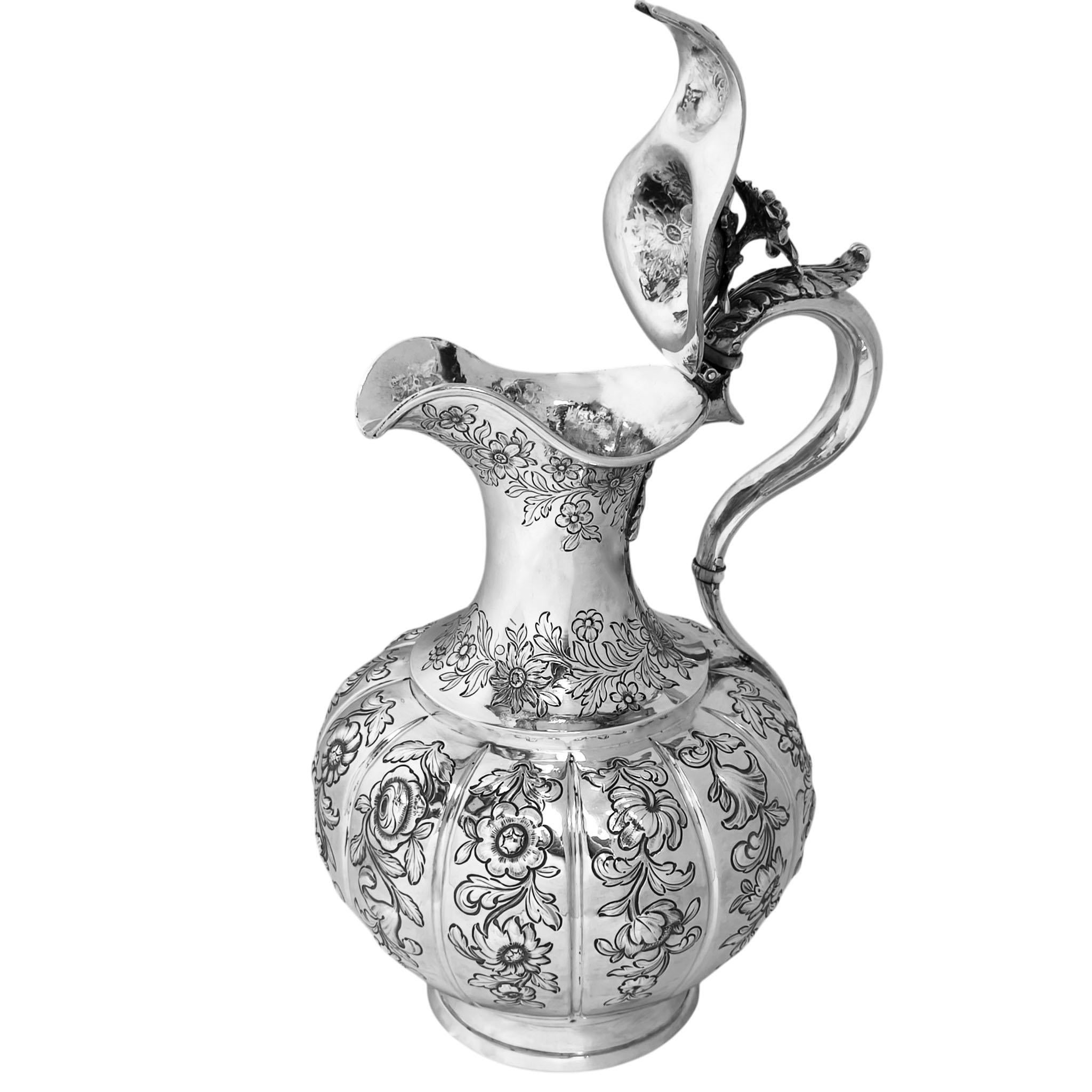 A beautiful Antique Sterling Silver Claret Jug with an elegant chased design covering its exterior. The William IV Jug is embellished with stylised floral, foliate and scroll designs on each of the panels on the body of the jug and up the tall neck. The body of the Silver Pitcher also features a blank cartouche. The Jug is further embellished with an impressive floral finial on the hinged lid. The Jug has an acanthus leaf scroll handle and stands on a low circular foot.
