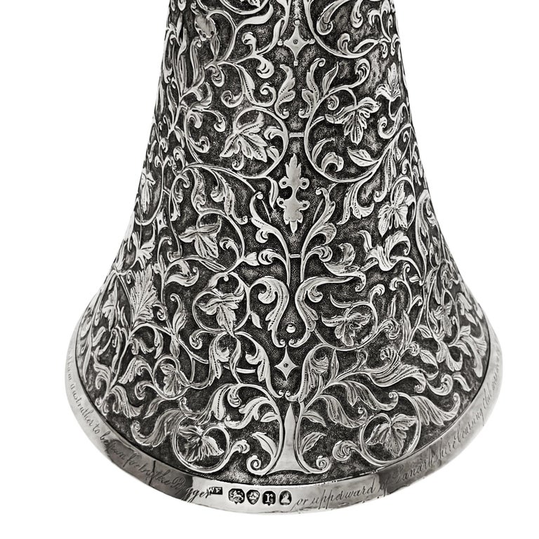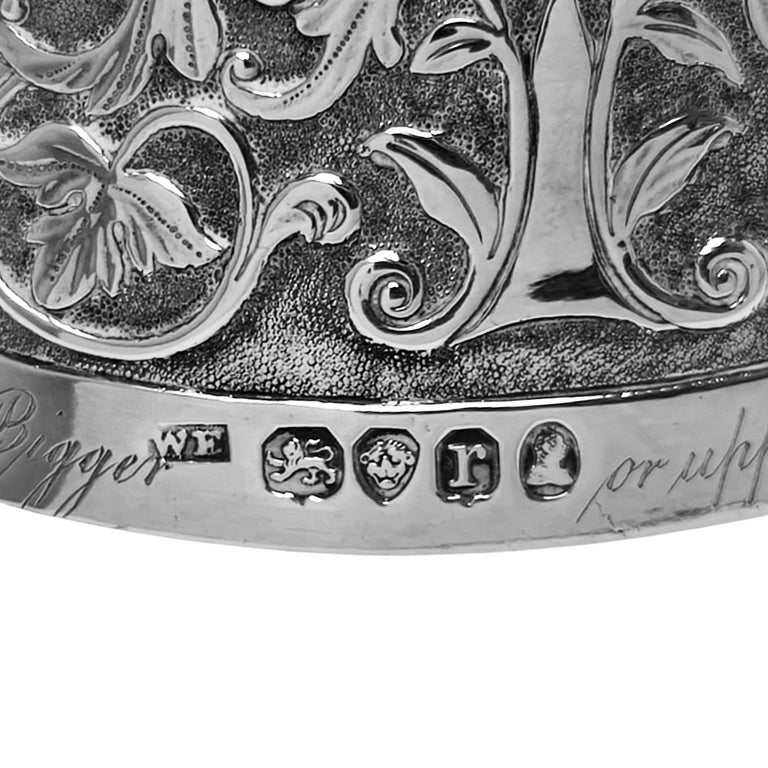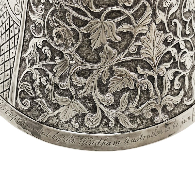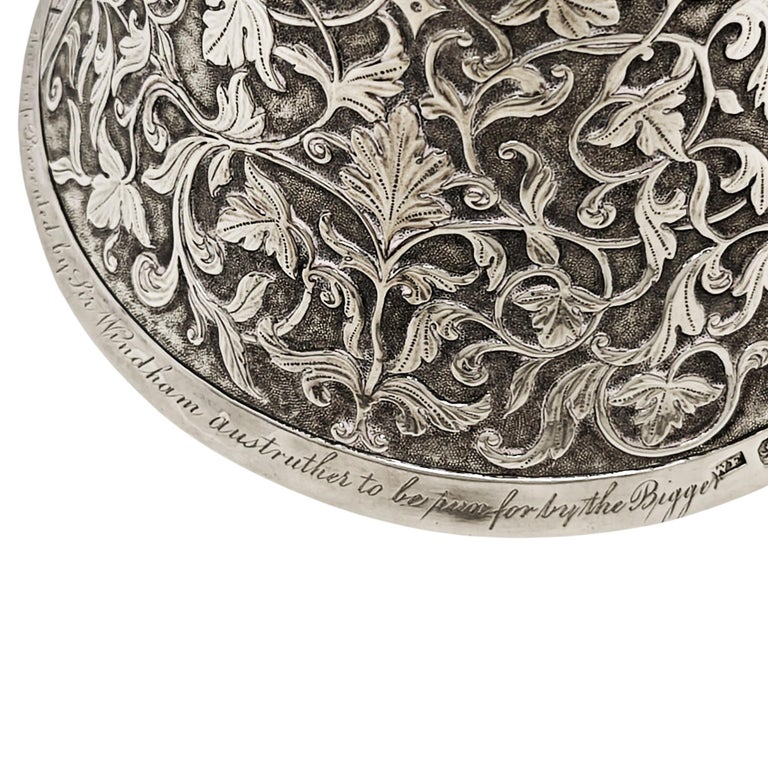 The cup has an engraving on the base saying - This Cup Presented by Sir Windham Ansthruther to be run for the Bigger or upperward of Lanarkshire Coursing Club was won by Captn Paterson's Dog Hubert 14th January 1833 (Hamlet. Fecit. Goldsmith to the King London)