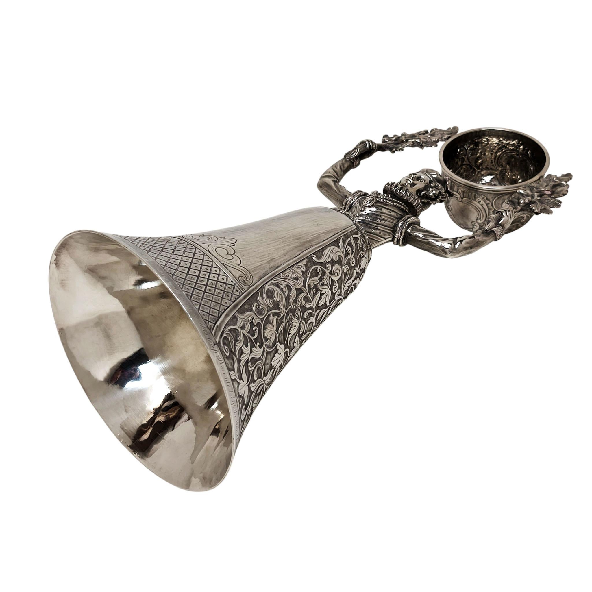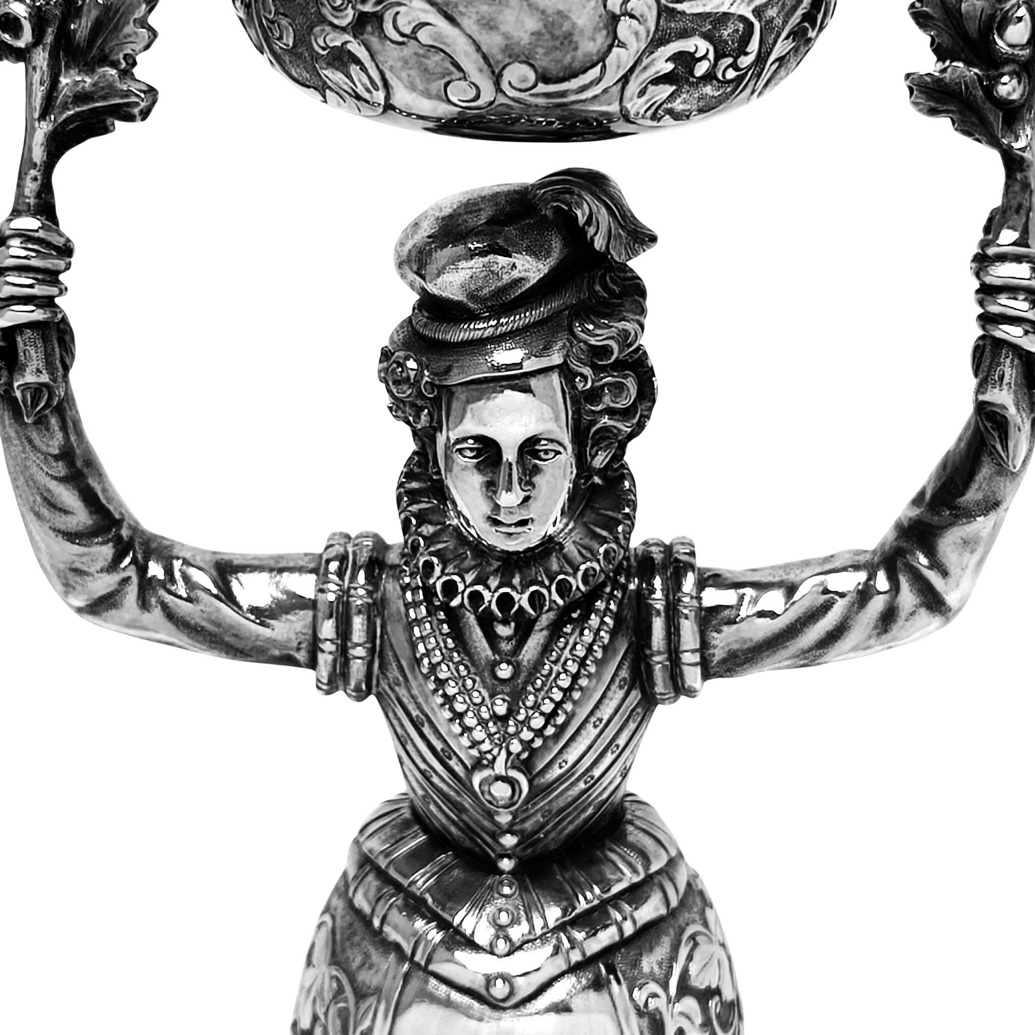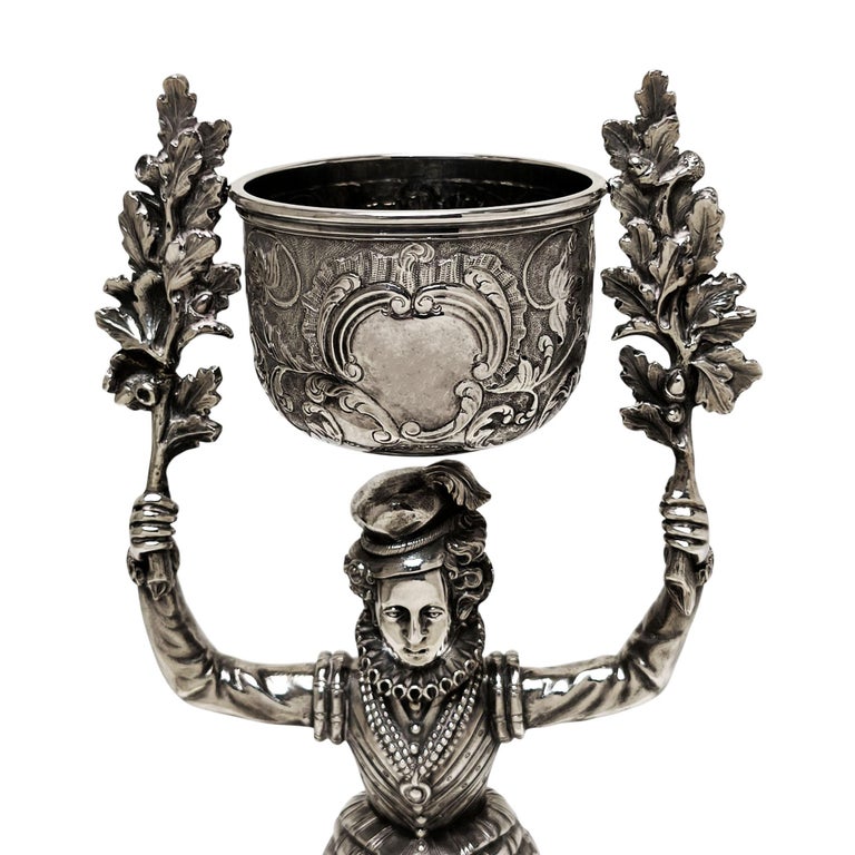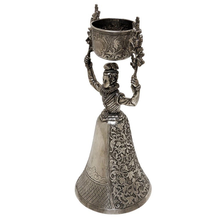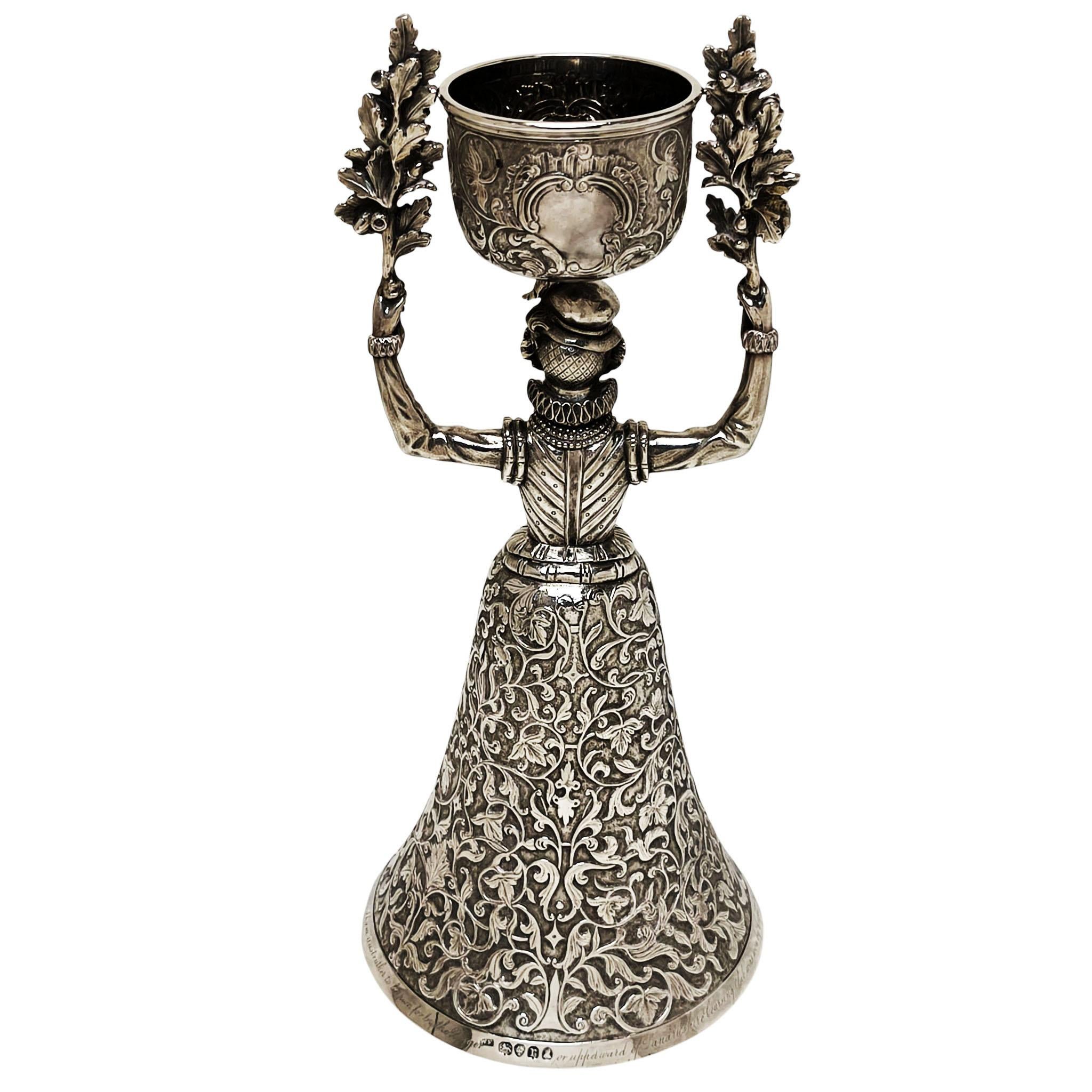 A impressive Antique William IV Solid Silver Wager Cup in the style of the original 15th century German Marriage Cups originally created to be used at weddings to allow the bride and groom to share the same cup without spilling. This particularly fine example is of notably heavy weight and is finely crafted. The main body of the cup is formed in the shape of a woman in Elizabethan dress raising two oak branches above her head to support the cup above her head. The wide skirt forming the larger of the cups is embellished with delicate leaf and scroll patterns mirrored on the smaller cup.
