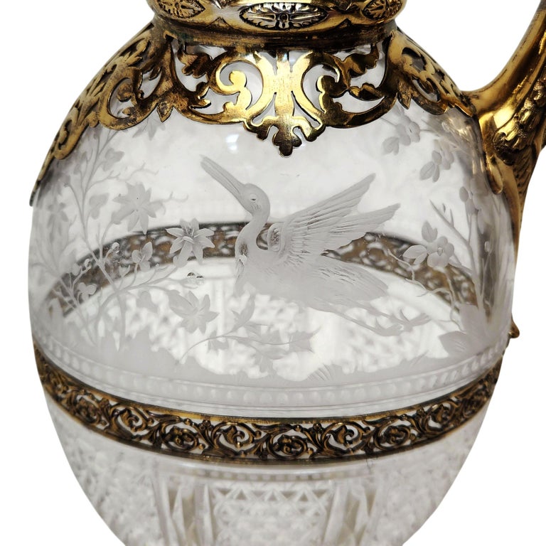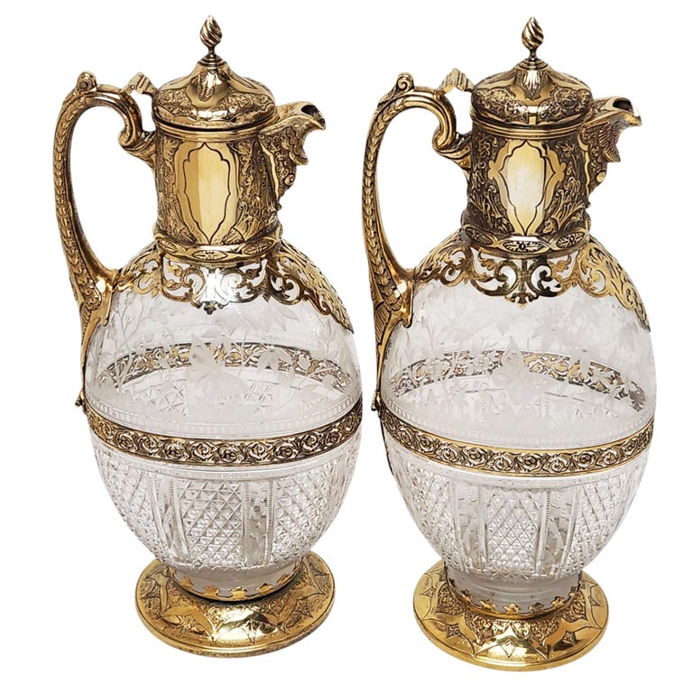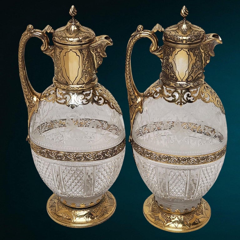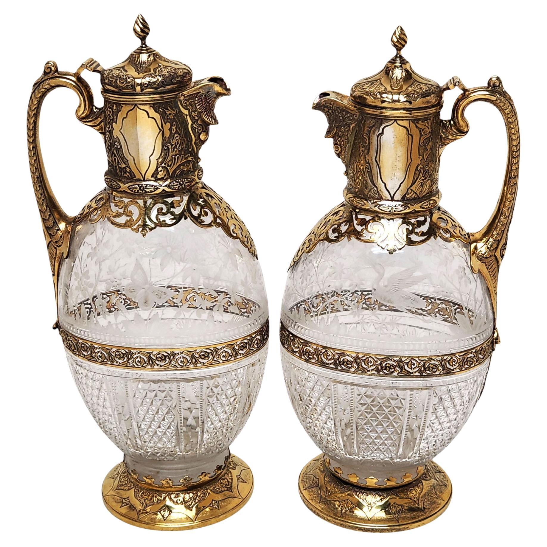 A fine and decorative matched pair of Victorian silver-gilt mounted Claret Jugs, combining richly chased metalwork with beautifully cut and engraved clear glass bodies. The ovoid glass bodies are divided into two distinct decorative area divided by a decorative pierced band. The upper section features delicate naturalistic etching depicting birds among foliage and flowering plants, whilst the lower portion is dressed in bold hobnail and fan-cut diamond patterns, catching the light with exceptional brilliance.