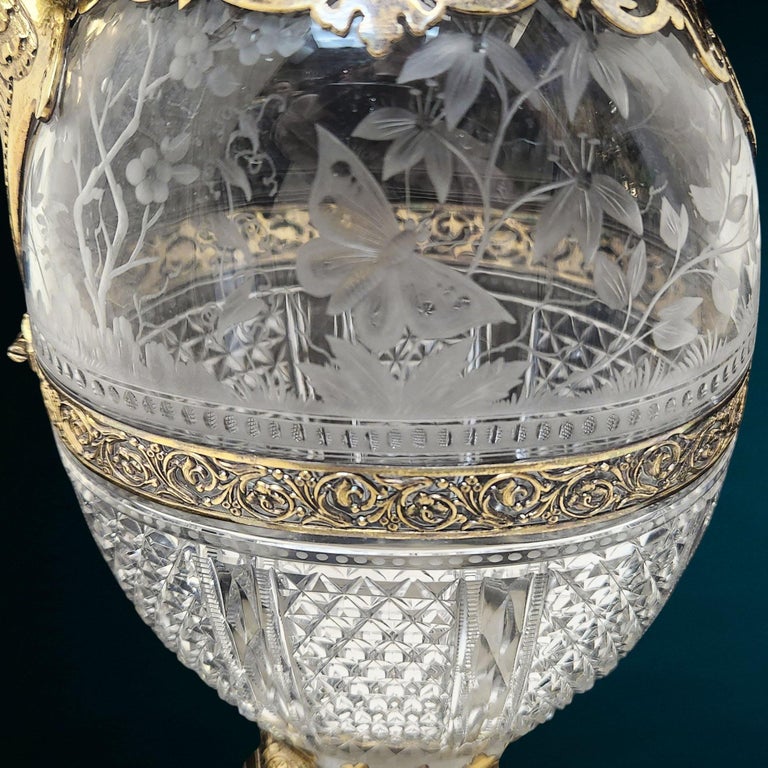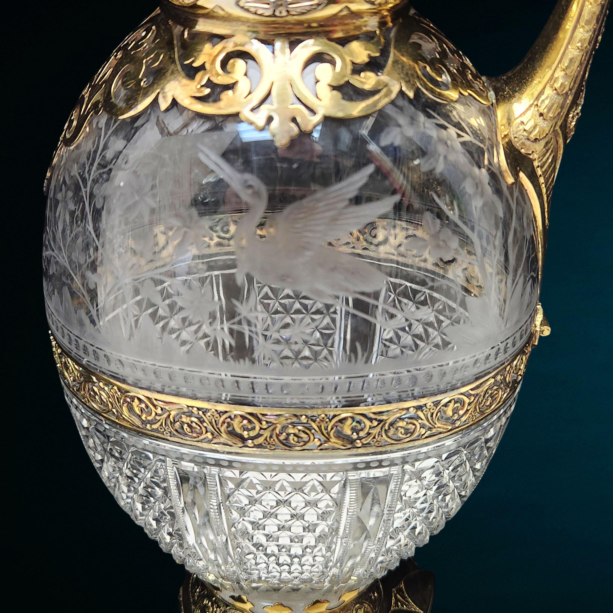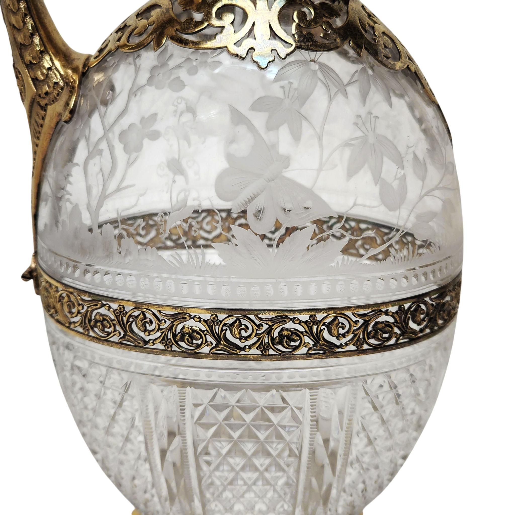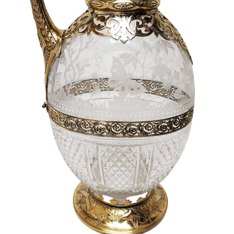 A fine and decorative matched pair of Victorian silver-gilt mounted Claret Jugs, combining richly chased metalwork with beautifully cut and engraved clear glass bodies. The ovoid glass bodies are divided into two distinct decorative area divided by a decorative pierced band. The upper section features delicate naturalistic etching depicting birds among foliage and flowering plants, whilst the lower portion is dressed in bold hobnail and fan-cut diamond patterns, catching the light with exceptional brilliance.