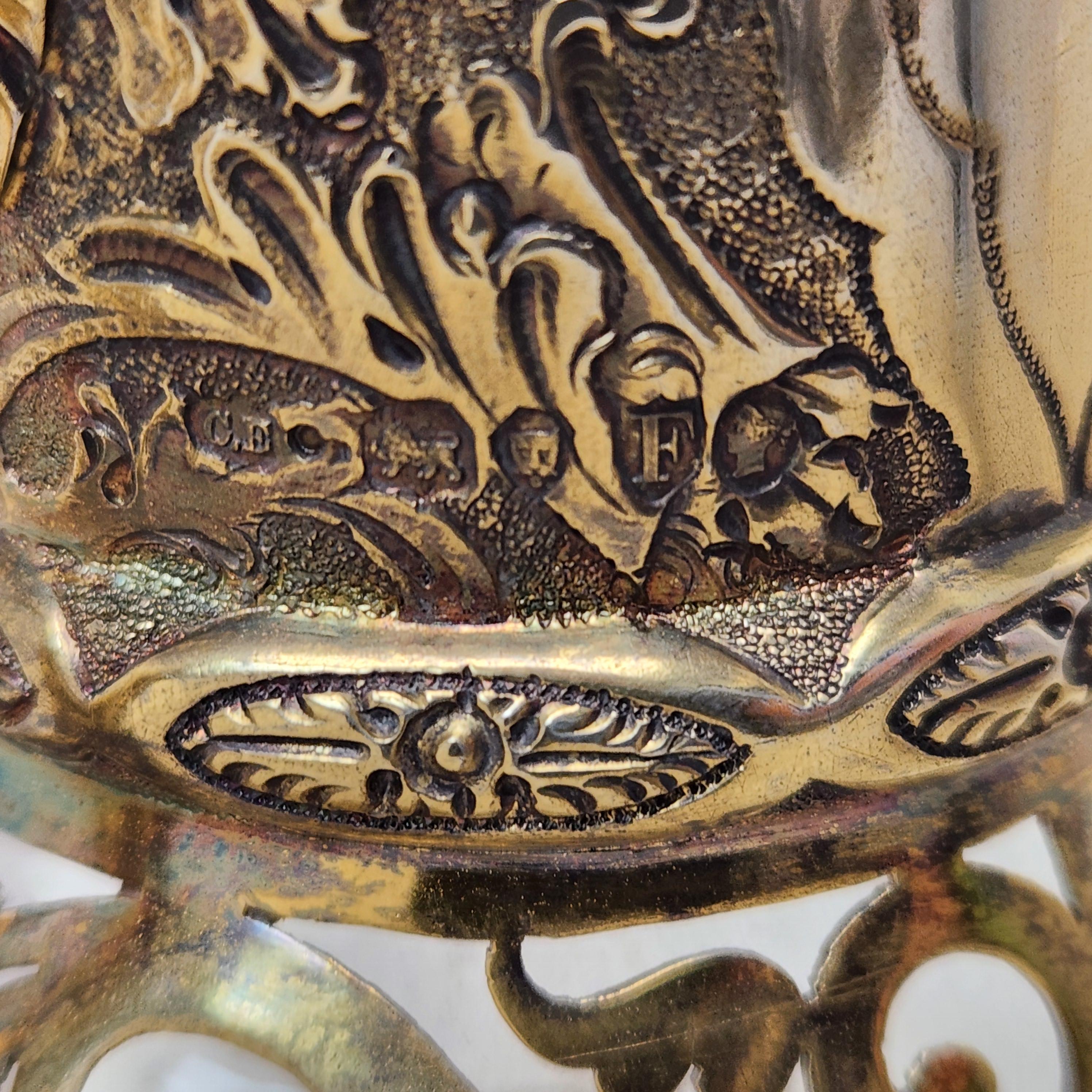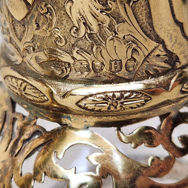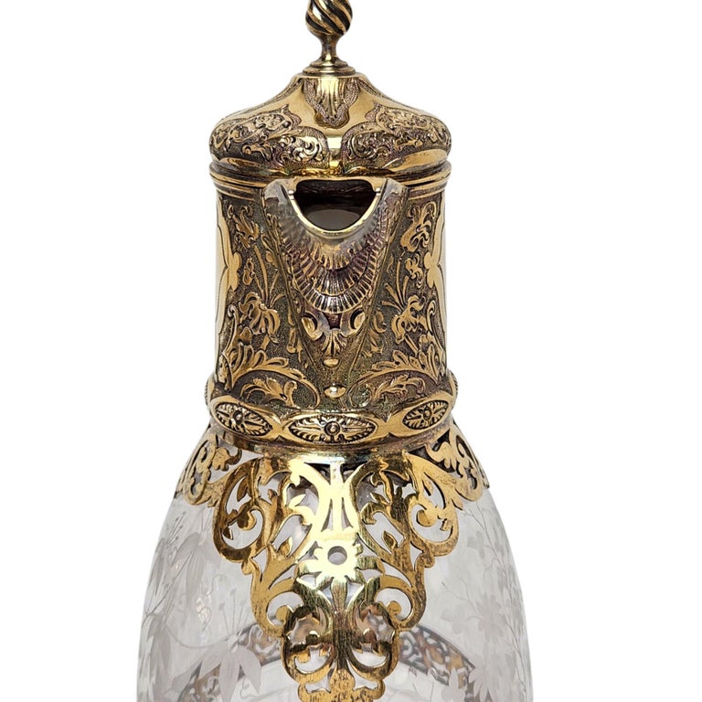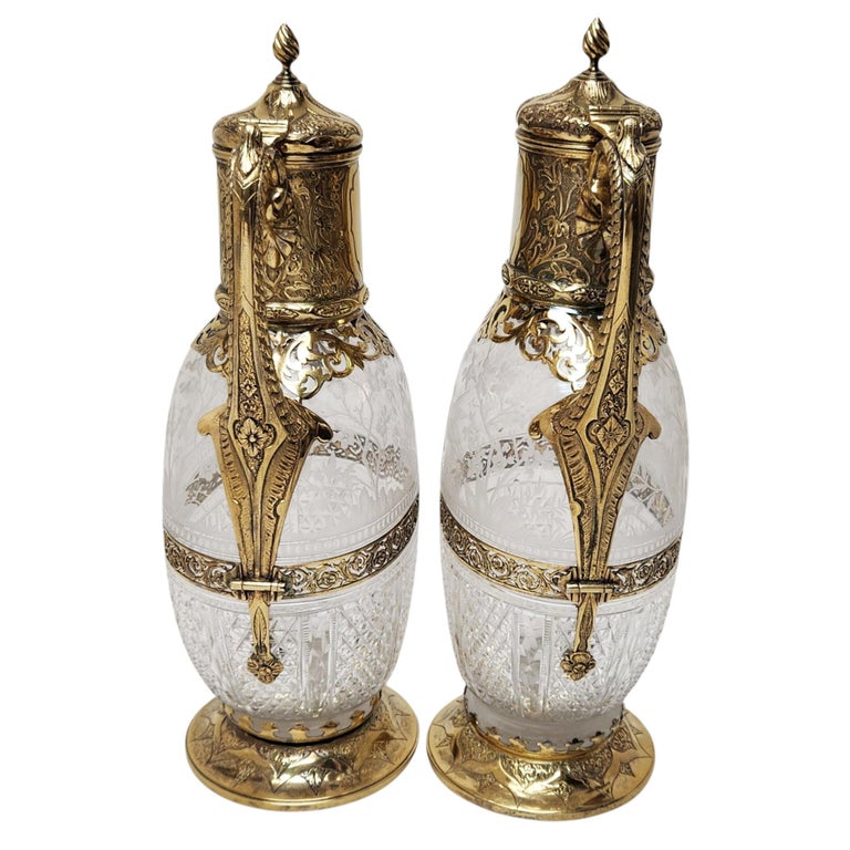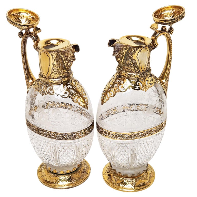 Pair Antique Victorian Silver Gilt & Cut Glass Claret Jugs Wine Decanters 1881/3