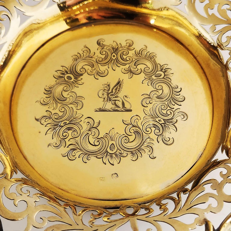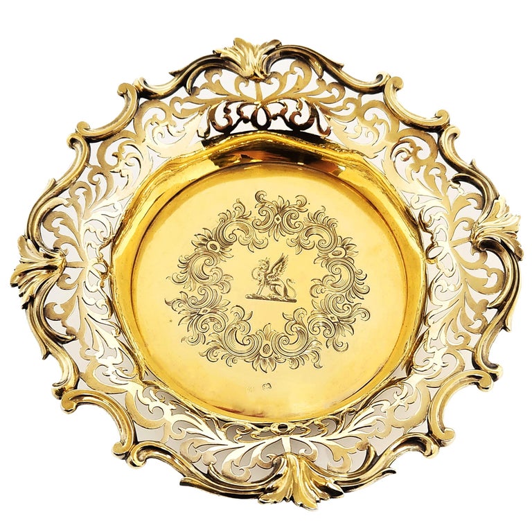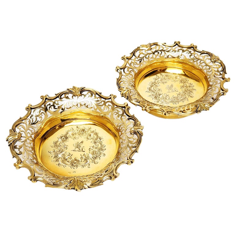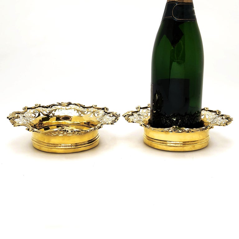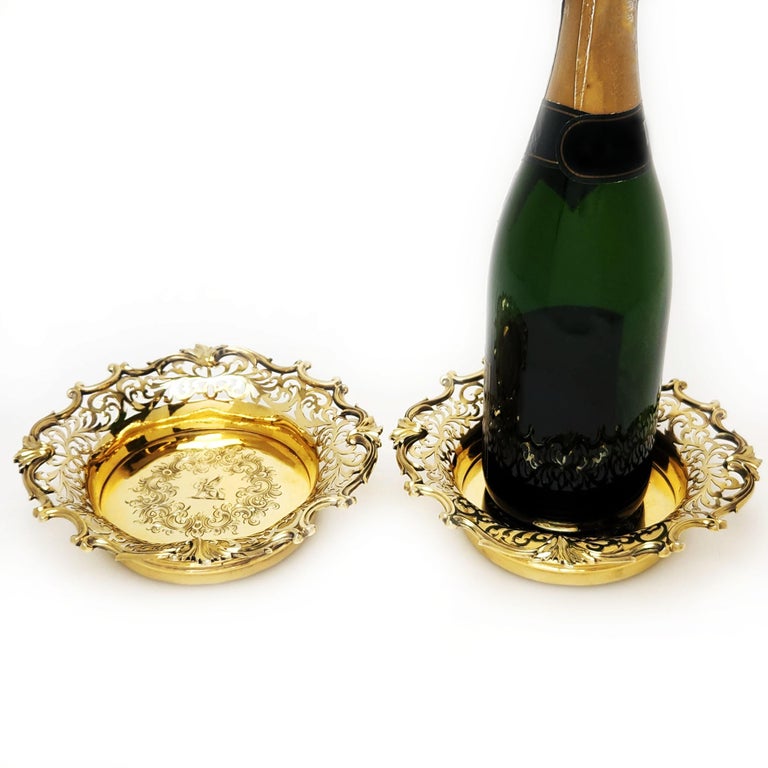 A pair of beautiful Antique Solid Silver Wine Bottle Coasters with an elegant gilded finish. The coasters have and ornate pierced design on the sides and a leaf and scroll boarder on the rim. The gilded silver base of each of the Wine Coasters are engraved with a griffin crest surrounded by an detailed scroll and foliate border.
