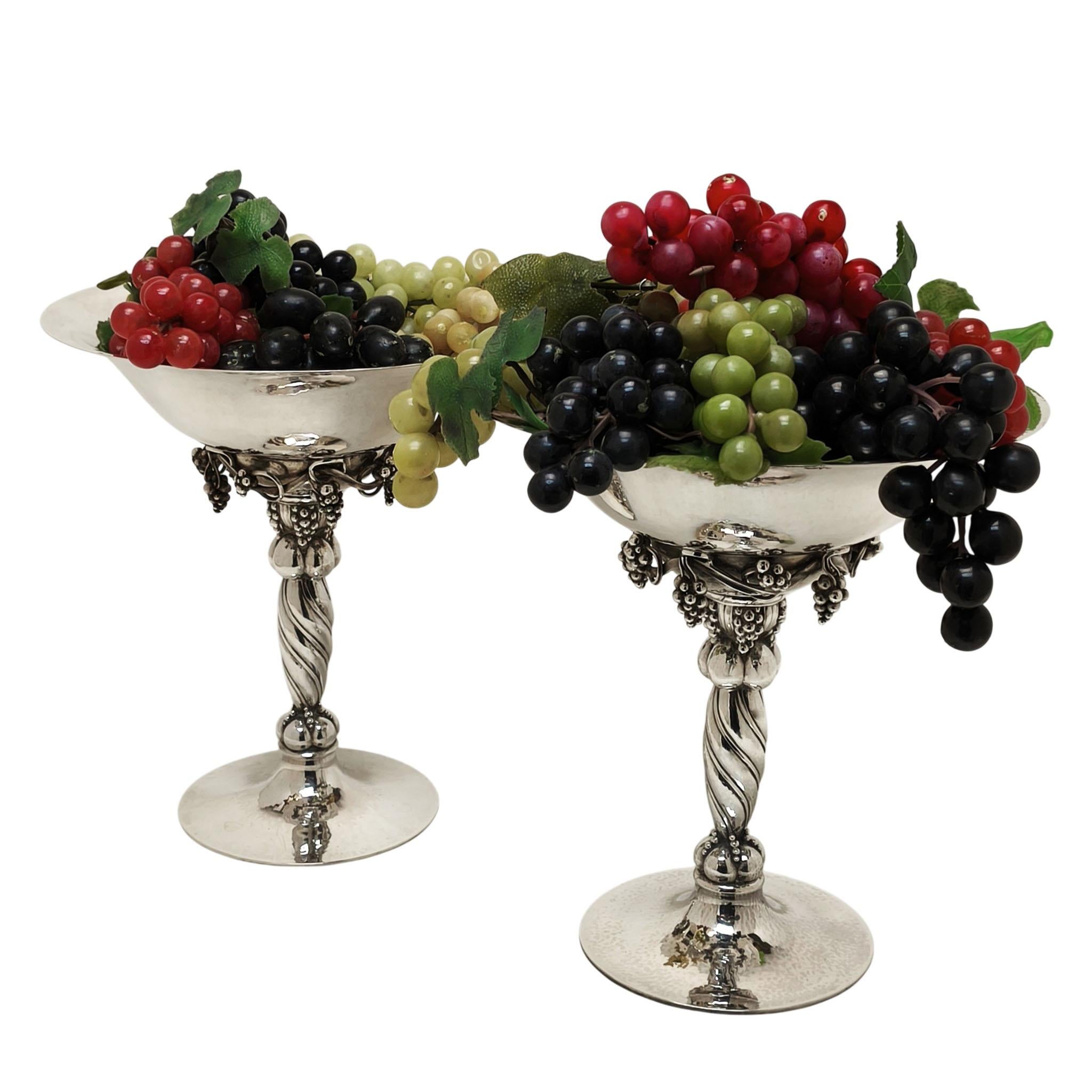 A magnificent pair of vintage Georg Jensen solid silver compotes in the celebrated Grape pattern - no. 264. Each features an elegant grape motif beneath a subtly hammered bowl, a hallmark of Jensen’s understated yet richly textured design language. The bowls are supported on twisted stems, rising from beautifully hammered, spreading feet, creating a harmonious balance of sculptural form and refined craftsmanship.