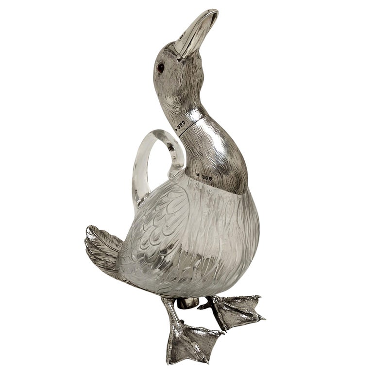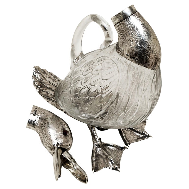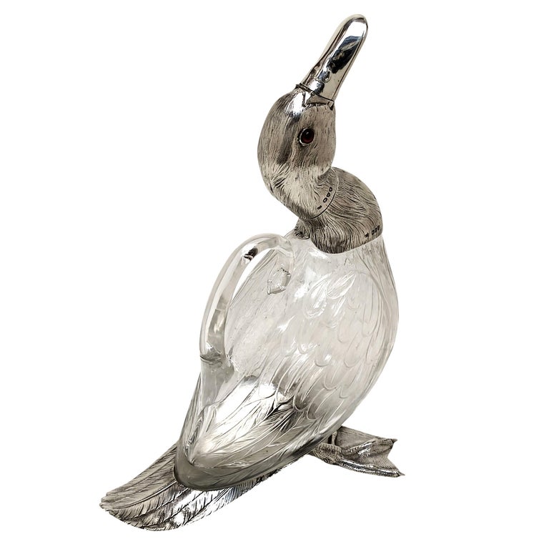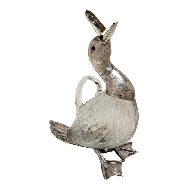 A Rare Antique Victorian Novelty Claret Jug in the shape of a Duck. The Head, Neck, Webbed Feet and Tail are naturalistically modelled in Sterling Silver with a fine attention to detail. The Silver Head and Neck have a push fit mechanism to allow the Jug to be easily filled and one filled the wine pours elegantly from within the beak. The Body of the Duck is created in clear etched glass to create the illusion of folded feathered wings. The Duck Claret Jug has inset glass eyes. This Victorian Claret Jug is a exceptional and highly collectable item.