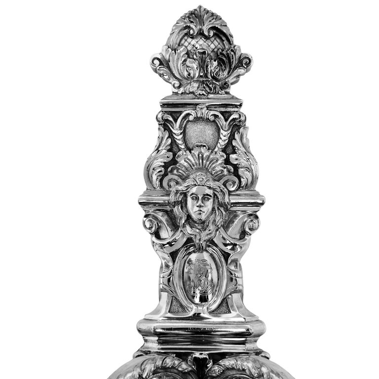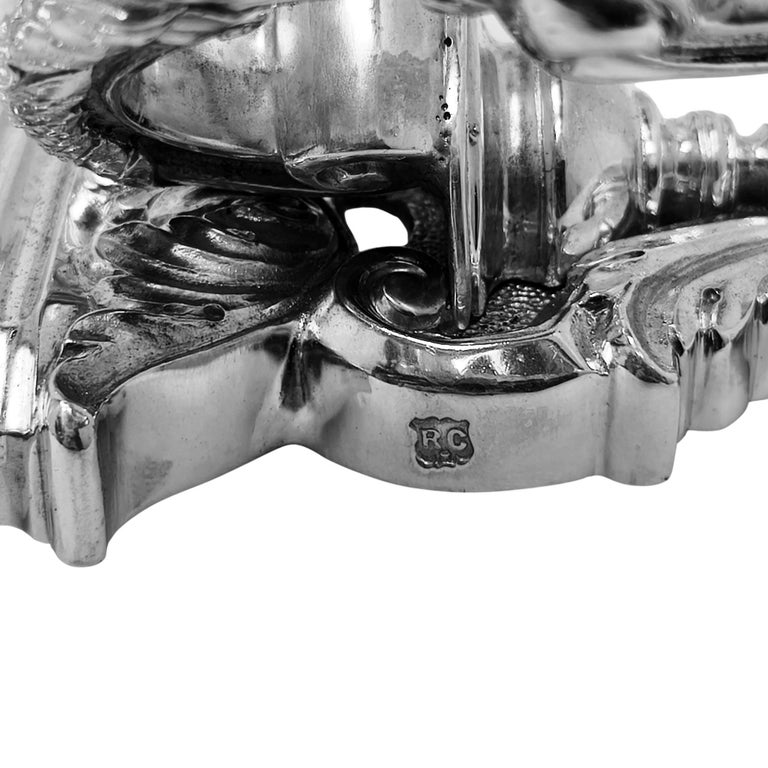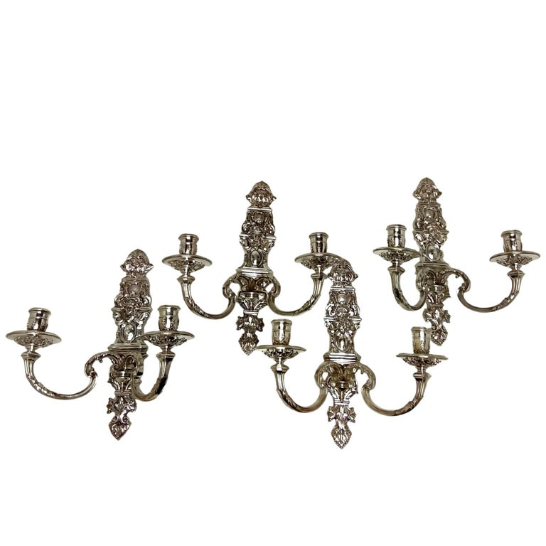 A Set of 4 exceptional vintage Cast Sterling Silver Wall Sconces. These Cast Solid Silver Wall Candle Holders are of notable weight and quality. Mirroring the designs of the Walls Sconces of the early18th Century, these wall sconces each have two curved branches with substantial drip pans. These Wall Sconces are designed with influence from the Baroque Period including scroll and foliate elements on the back plate and embellishing the branches. A superior attention to detail is paid, including embellishments to the underside of the drip pans. The Back Plates also feature oval cartouches and masks.