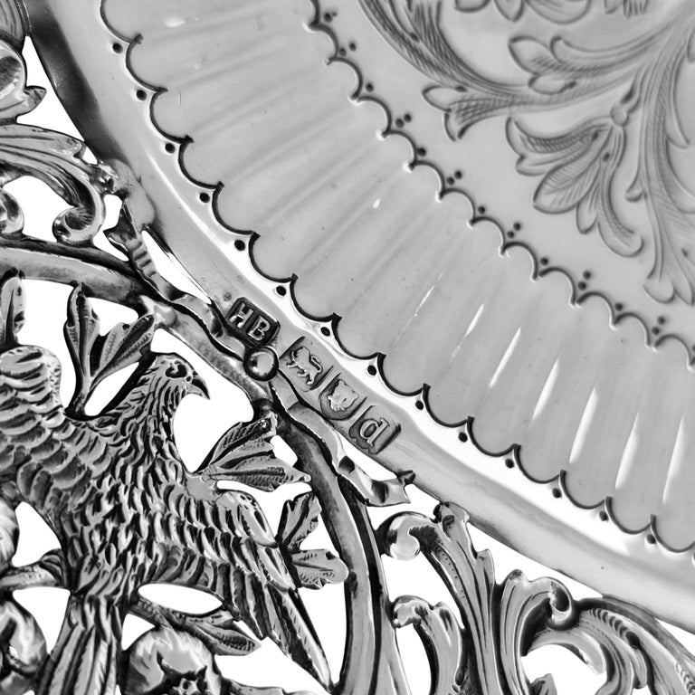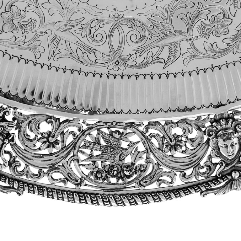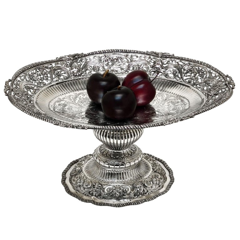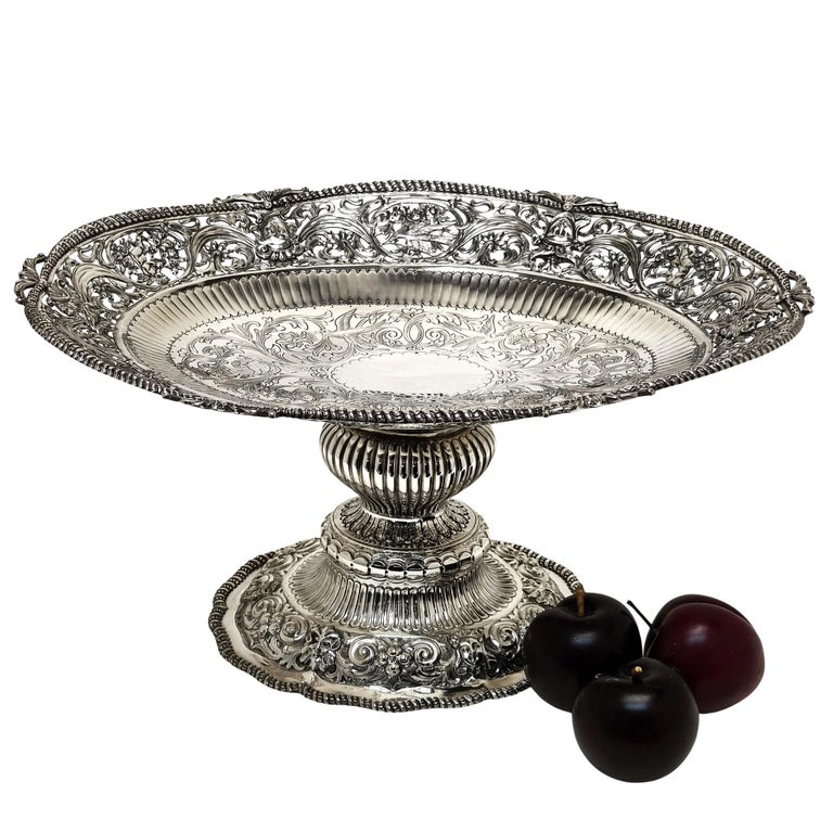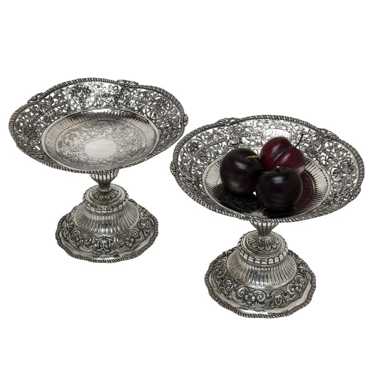A magnificent Set of 3 Antique Victorian Sterling Silver Comports. This Suite of 3 Victorian Comports makes for an impressive table centrepiece but can also be uses individually. Each Silver Comport has an ornate chased and pierced border of scroll and foliate patterns surrounding alternating cartouches and faces. Each cartouche has a unique theme showing animals, birds, cupids and flowers. Each comport has an engraved band around the center of the bowl. These Comports had a chases shaped column on a spread pedestal foot.