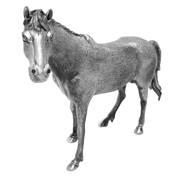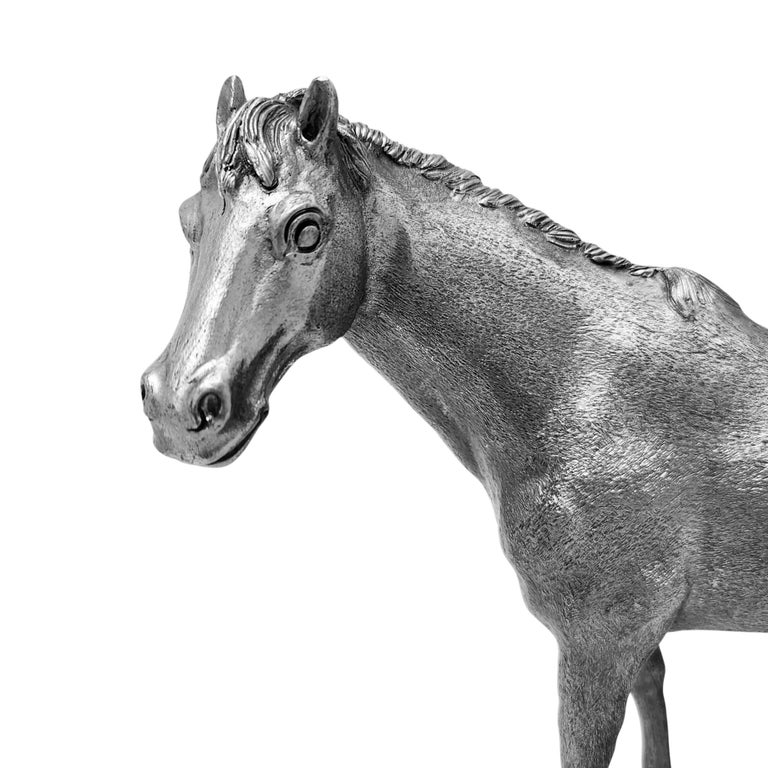 Finely modelled Vintage Italian Solid Silver Model Horse standing with the head slightly turned, the figure with a textured body and naturalistically chased mane and tail. The well-observed head with alert ears and pronounced eyes lends the piece a lively character, while the compact proportions and subtly stylised musculature are typical of mid-20th-century European decorative animal models.
