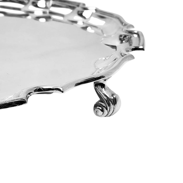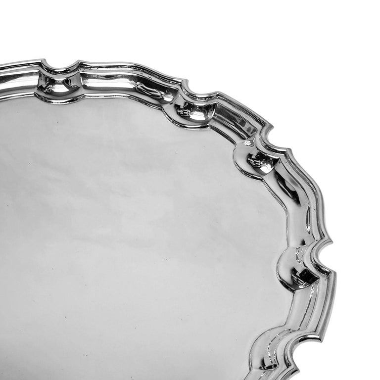 A classic Sterling Silver Salver in a traditional Chippendale pattern. This Silver Tray is of a substantial size with a Chippendale 'pie-crust' border and stands on three scroll feet. The Silver Salver has a plain highly polished finish. Originally used for serving or decorative pieces in the home, these Salvers are also highly sought after as Presentation Pieces or Prizes as they are perfect for engraving.