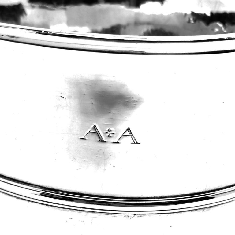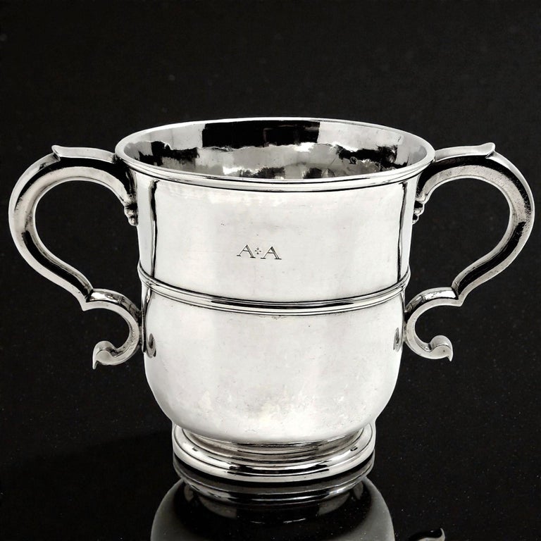 A lovely Antique George I solid Silver Cup with two elegant scroll handles. This classic Georgian two-handled Cup stands on a low spread foot and has a band around the centre. It is unembellished except for the AA engraved initials and its simple design creates an understated elegance.