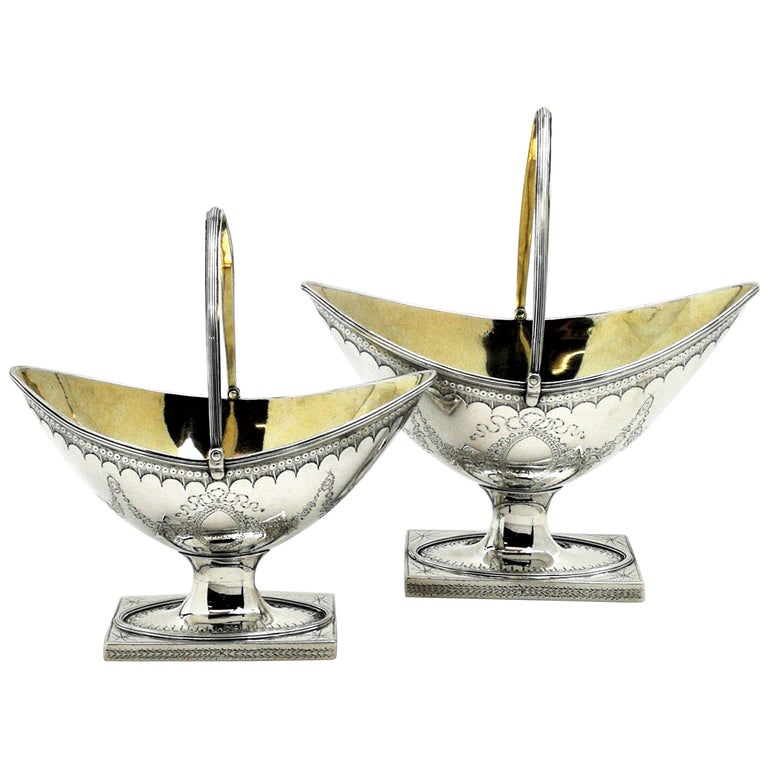 An antique Georgian George III solid Silver Sugar and Cream Set comprising of a Sugar Basket and a Cream Basket. This pair of Baskets is matched in design with the sugar basket being slightly larger than the cream basket. The oval Baskets stand on rectangular bases and the exterior of each is decorated with delicate engraved designs including blank oval cartouches and floral swag patterns. The interiors of the baskets are lightly gilded.