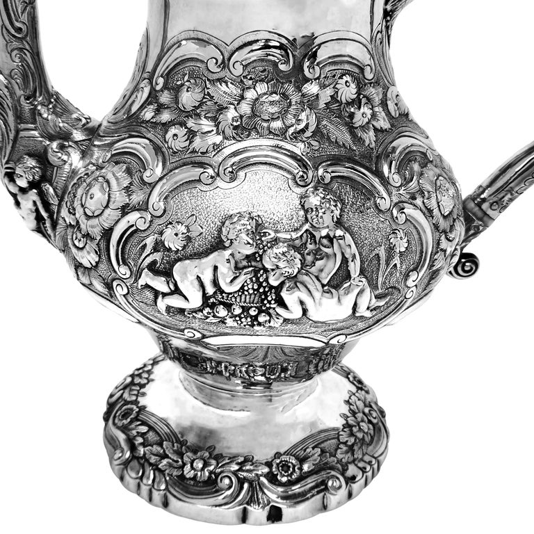 A beautiful antique George V sterling silver 4 piece Tea & Coffee Set comprising of a coffee pot, teapot, sugar bowl and milk / cream Jug. The pieces have a classic baluster shape. Each piece is emebellished with ornate chased designs including floral and scroll imagery. Each piece has two cartouches - one plain and one showing a chased scene of frolicking cherubs. The teapot and coffee pot have a chinoiserie style figure as finials.