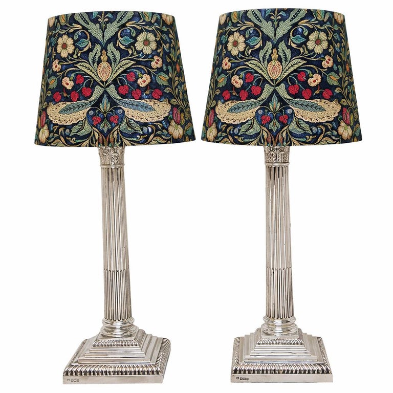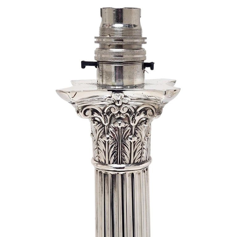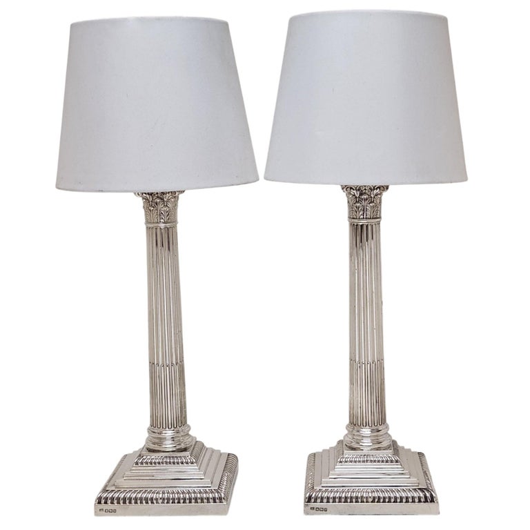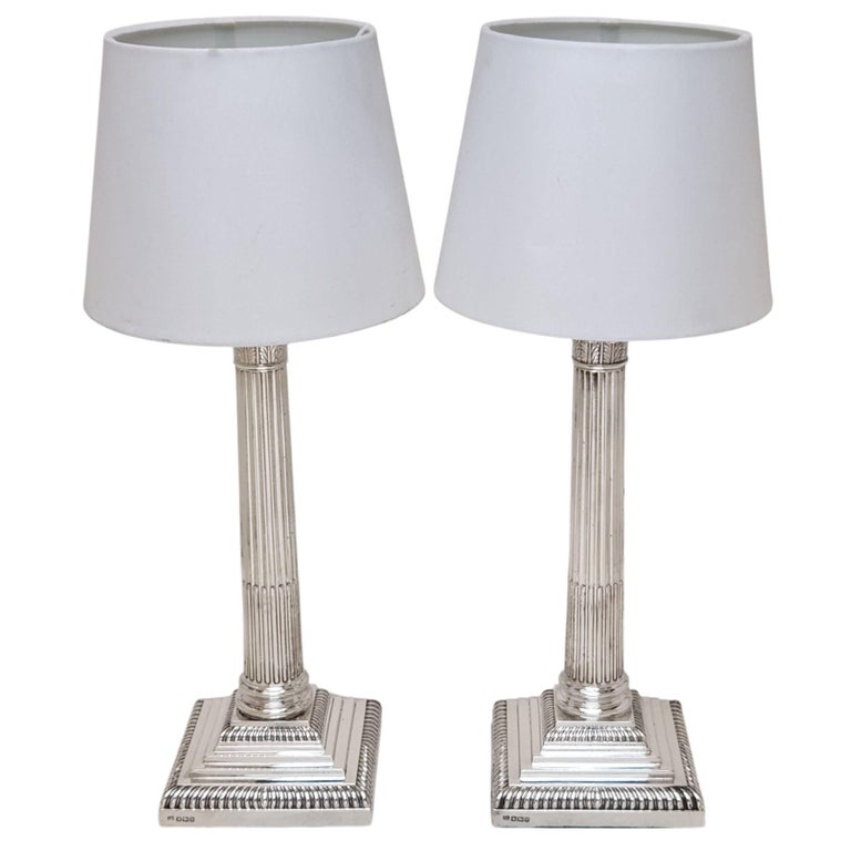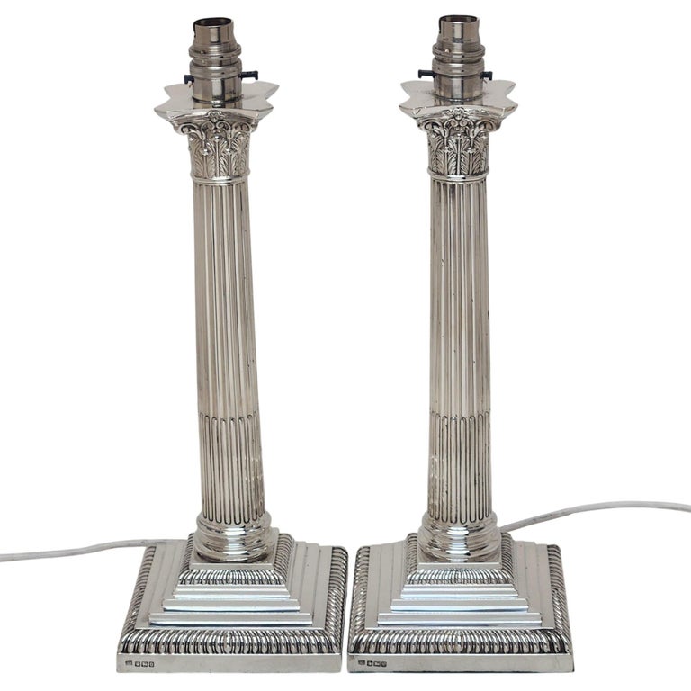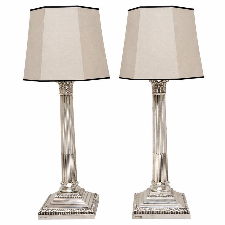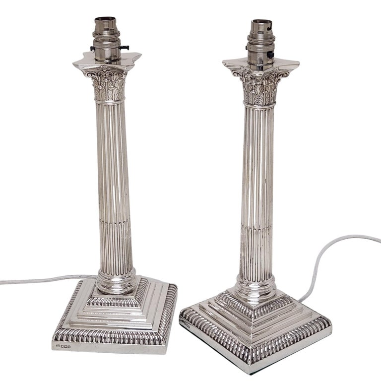 A pair of Classic Antique Sterling Silver Corinthian Column Table Lamps. These Traditional Silver Lamps stand on stepped square bases embellished with two rows of gadroon pattern borders. The tapered straight sided columns have quintessential Corinthian Capitals inspired by the Ancient Grecian Corinthian Capitals popularised in the 4th Century BC. A pair of absolutely classic, stylish Sterling Silver Table Lamps. These Electric Lamps have recently been rewired.