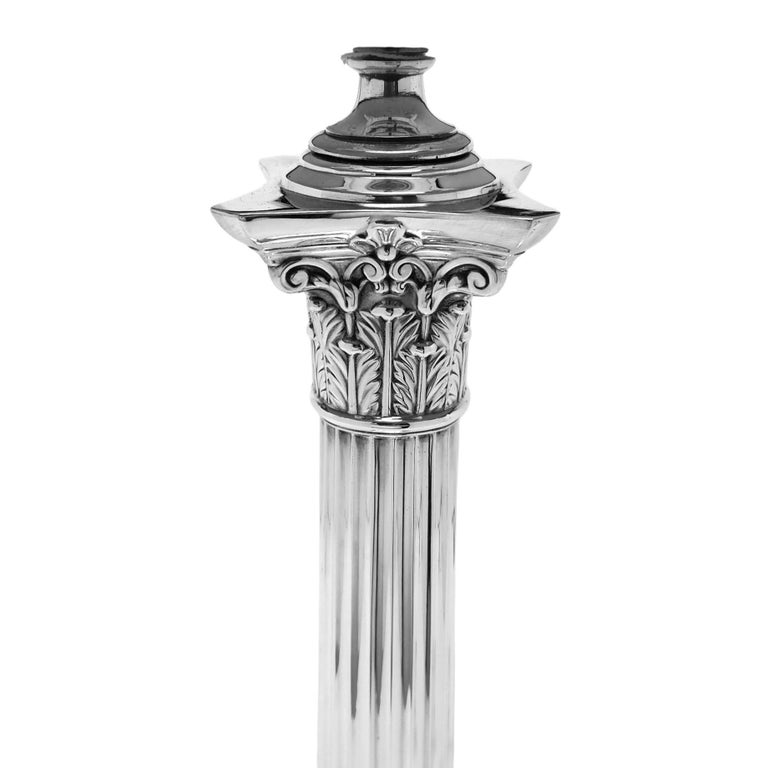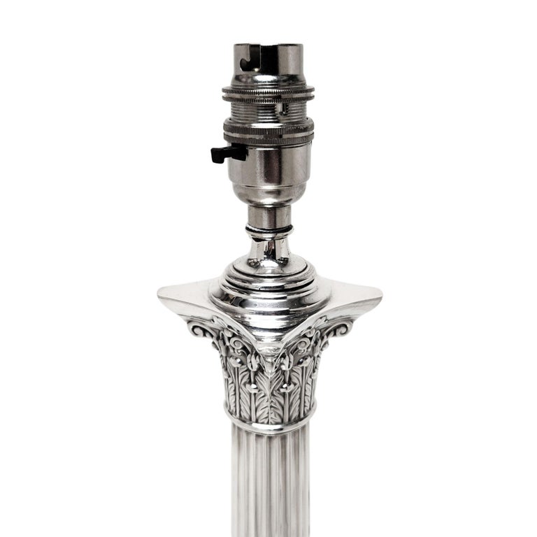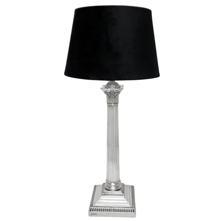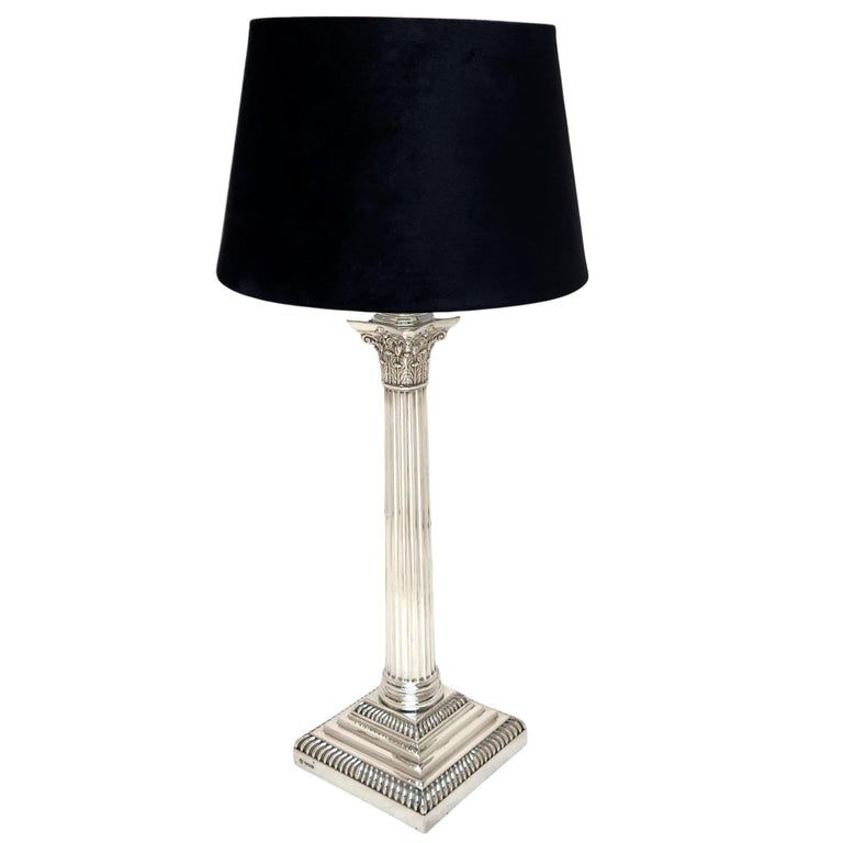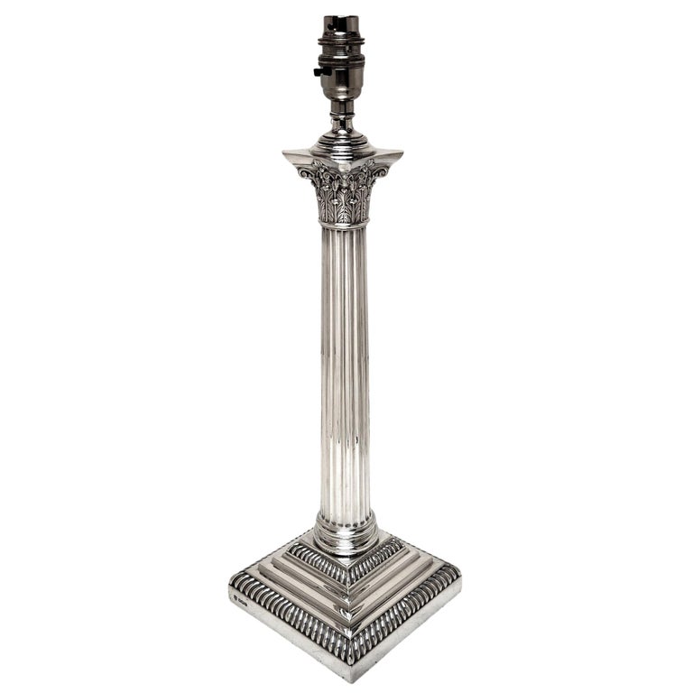 A magnificent Sterling Silver Table Lamp in a classic Corinthian Column Form. This Silver Table Lamp stands on a square stepped Base embellished with two rows of gadroon patterns. The Lamp has a tapered straight sided fluted column with a traditional Corinthian Capital inspired by the Ancient Greek architectural detailing popularised in the 4th century BC.